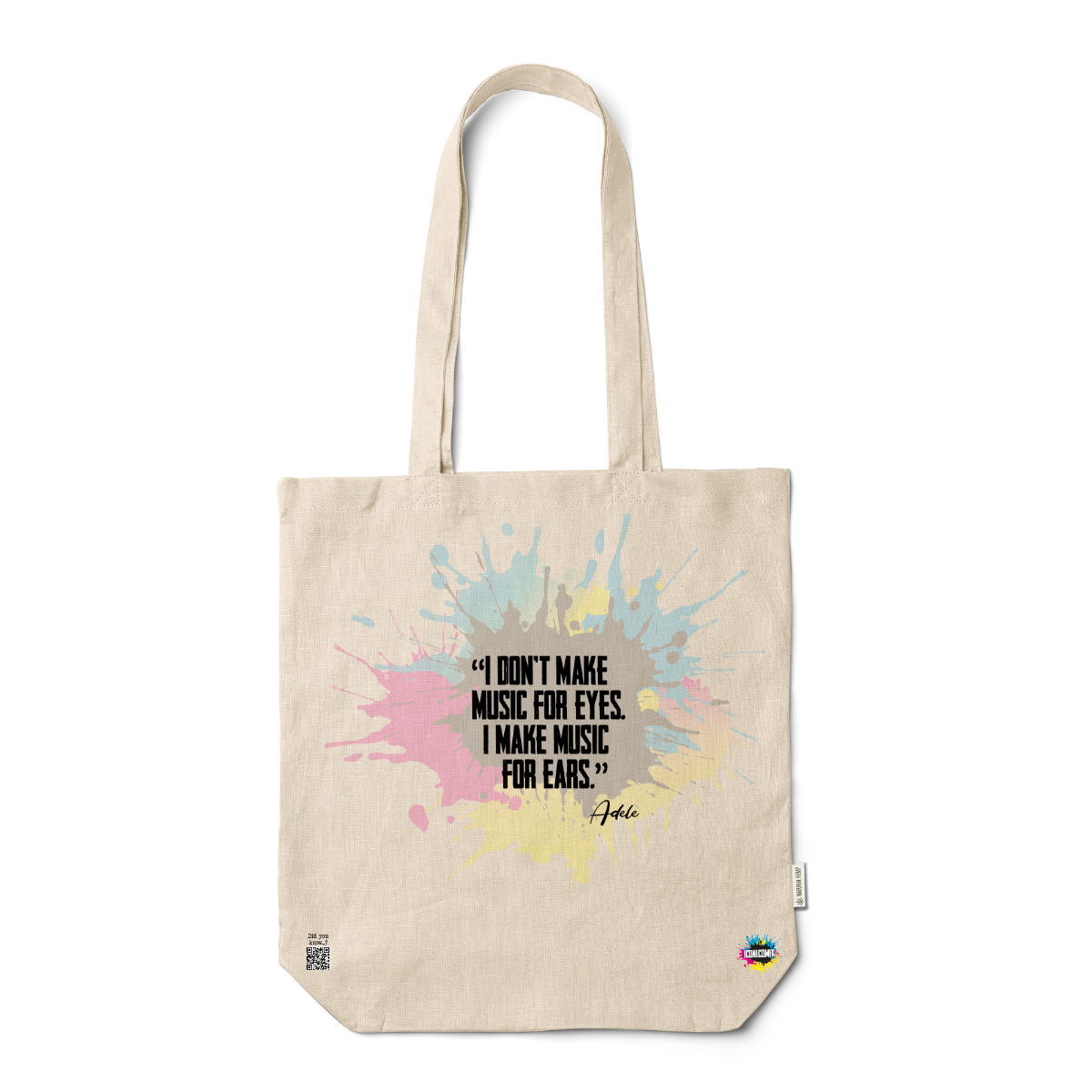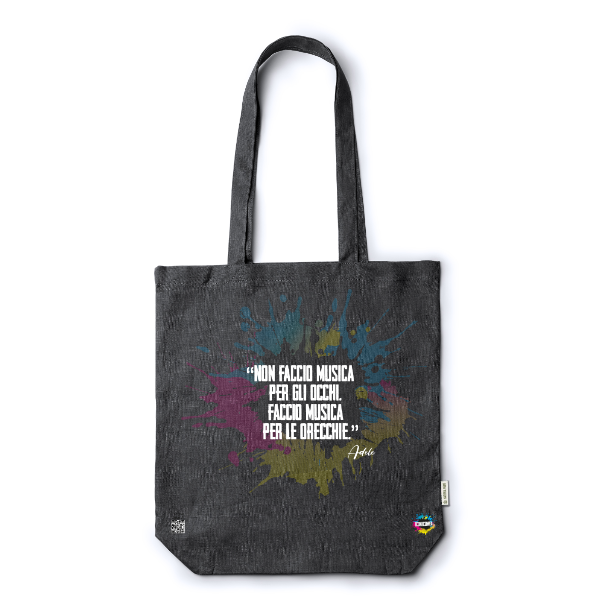 In ogni nostra grafica è presente anche un QR code che reindirizza al sito iconicomix.com, alla pagina ufficiale dell’icona che hai scelto. Una porta digitale che racconta la sua storia, le sue frasi e il suo mondo.