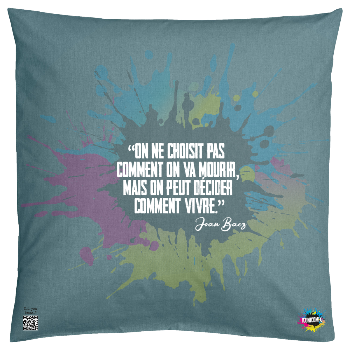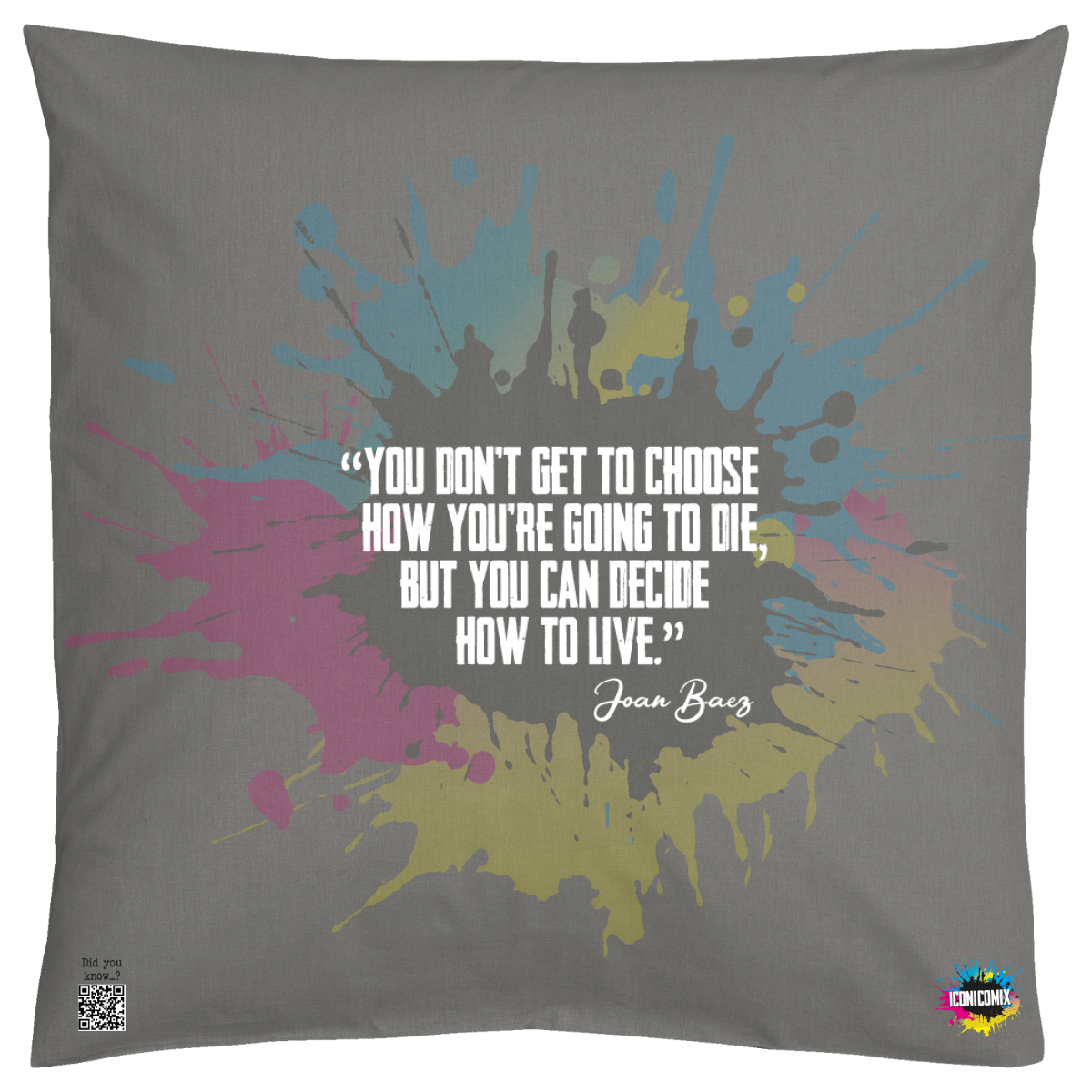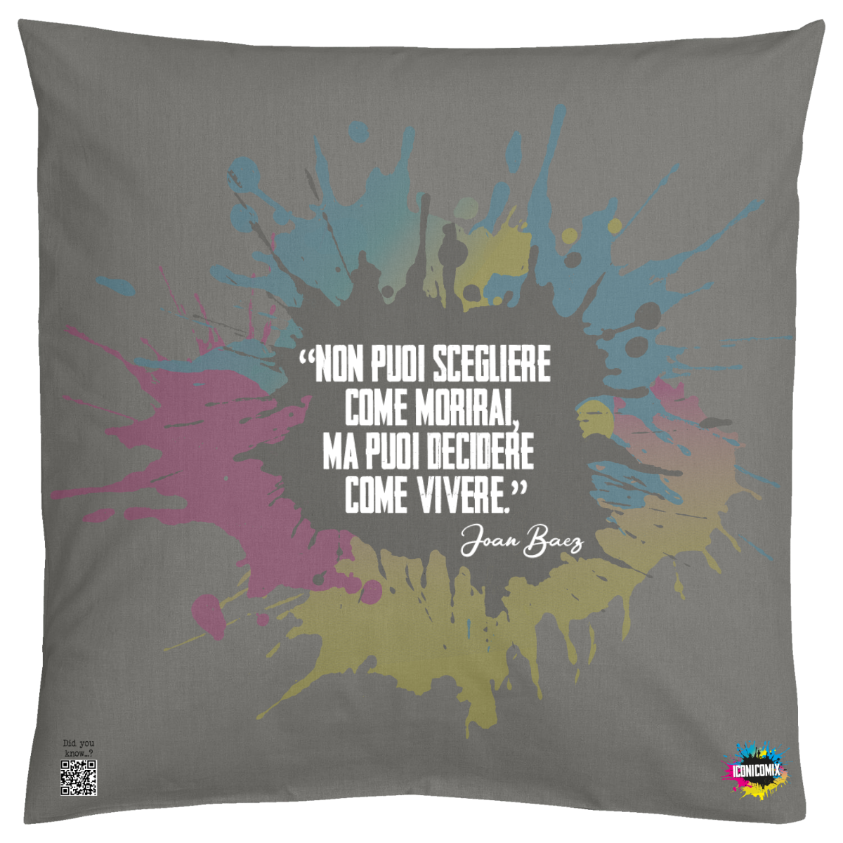 In ogni nostra grafica è presente anche un QR code che reindirizza al sito iconicomix.com, alla pagina ufficiale dell’icona che hai scelto. Una porta digitale che racconta la sua storia, le sue frasi e il suo mondo.