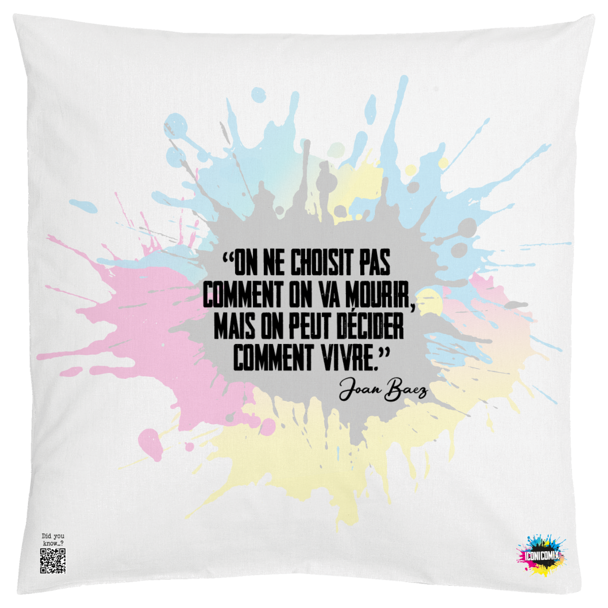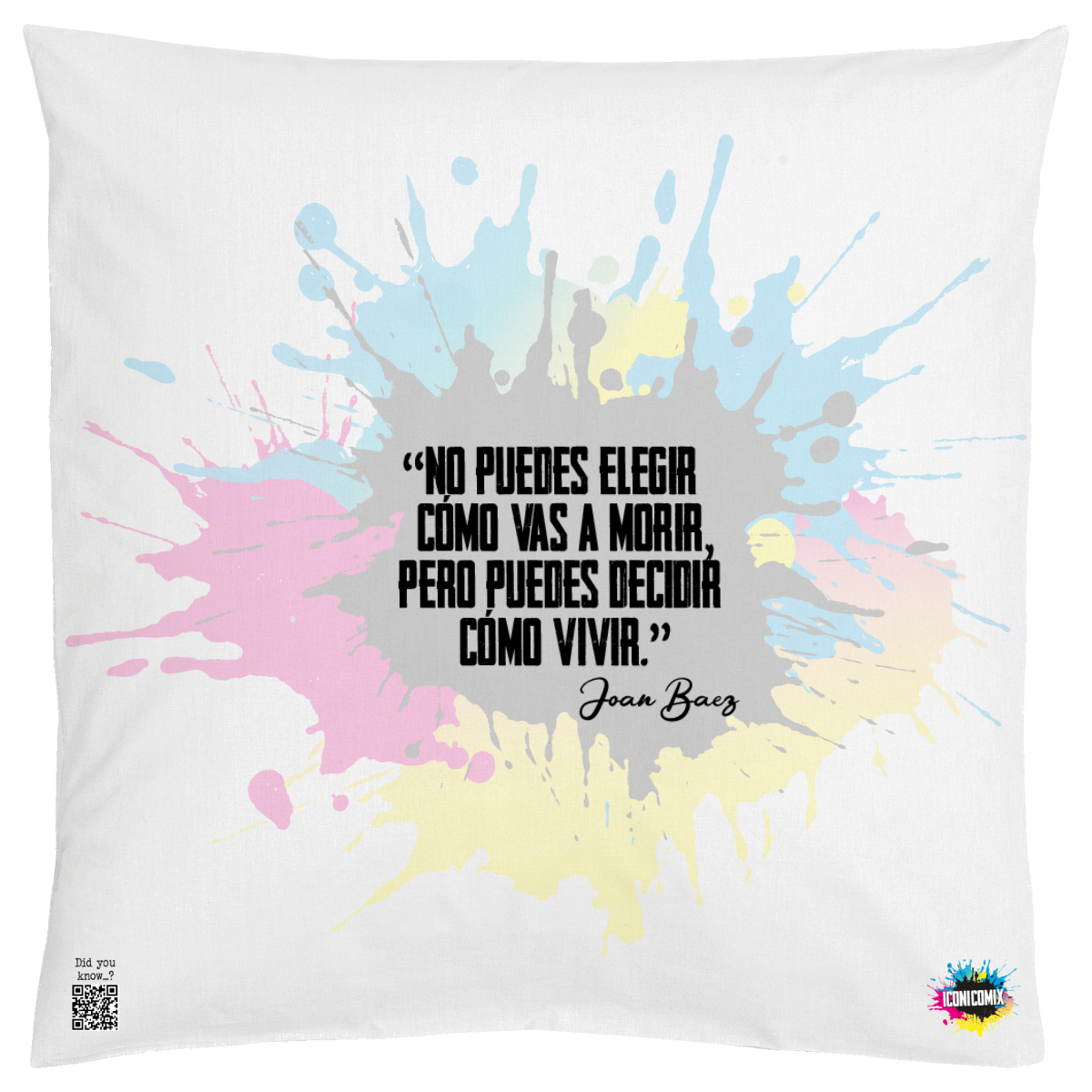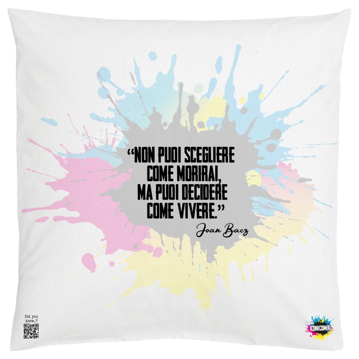 In ogni nostra grafica è presente anche un QR code che reindirizza al sito iconicomix.com, alla pagina ufficiale dell’icona che hai scelto. Una porta digitale che racconta la sua storia, le sue frasi e il suo mondo.
