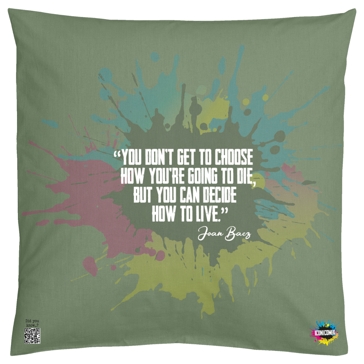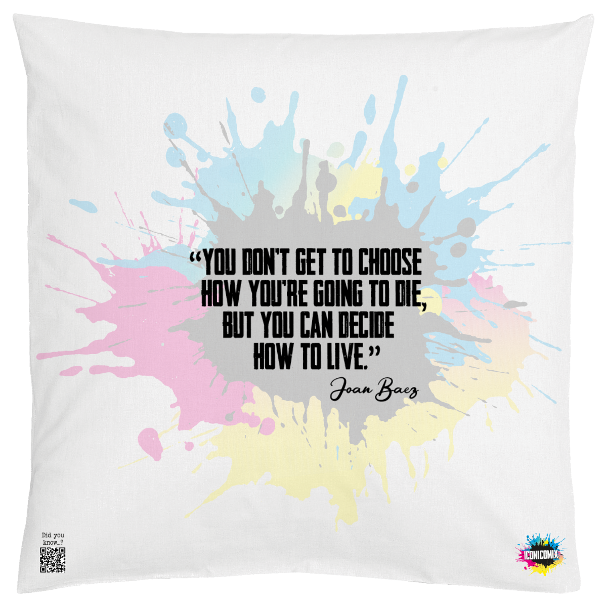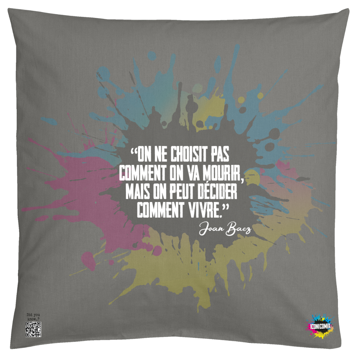 In ogni nostra grafica è presente anche un QR code che reindirizza al sito iconicomix.com, alla pagina ufficiale dell’icona che hai scelto. Una porta digitale che racconta la sua storia, le sue frasi e il suo mondo.