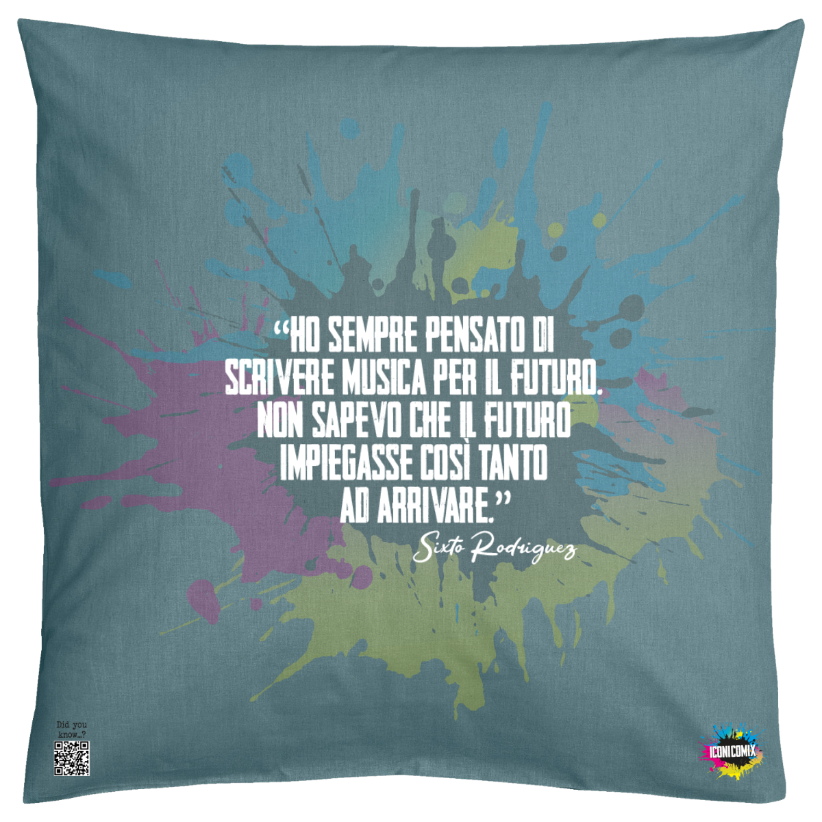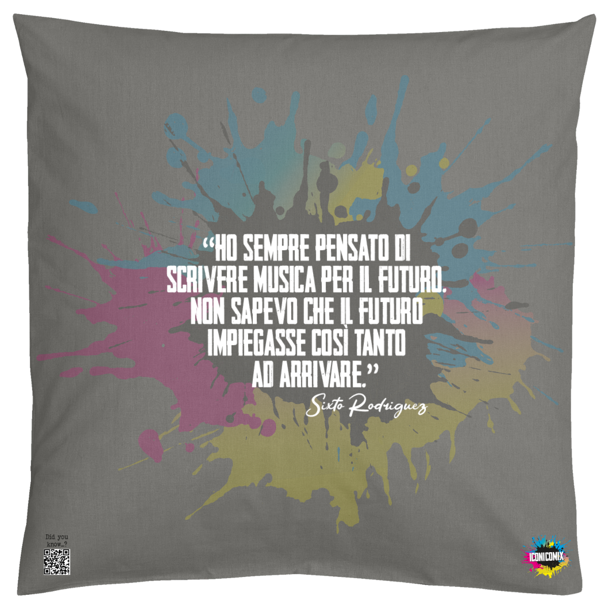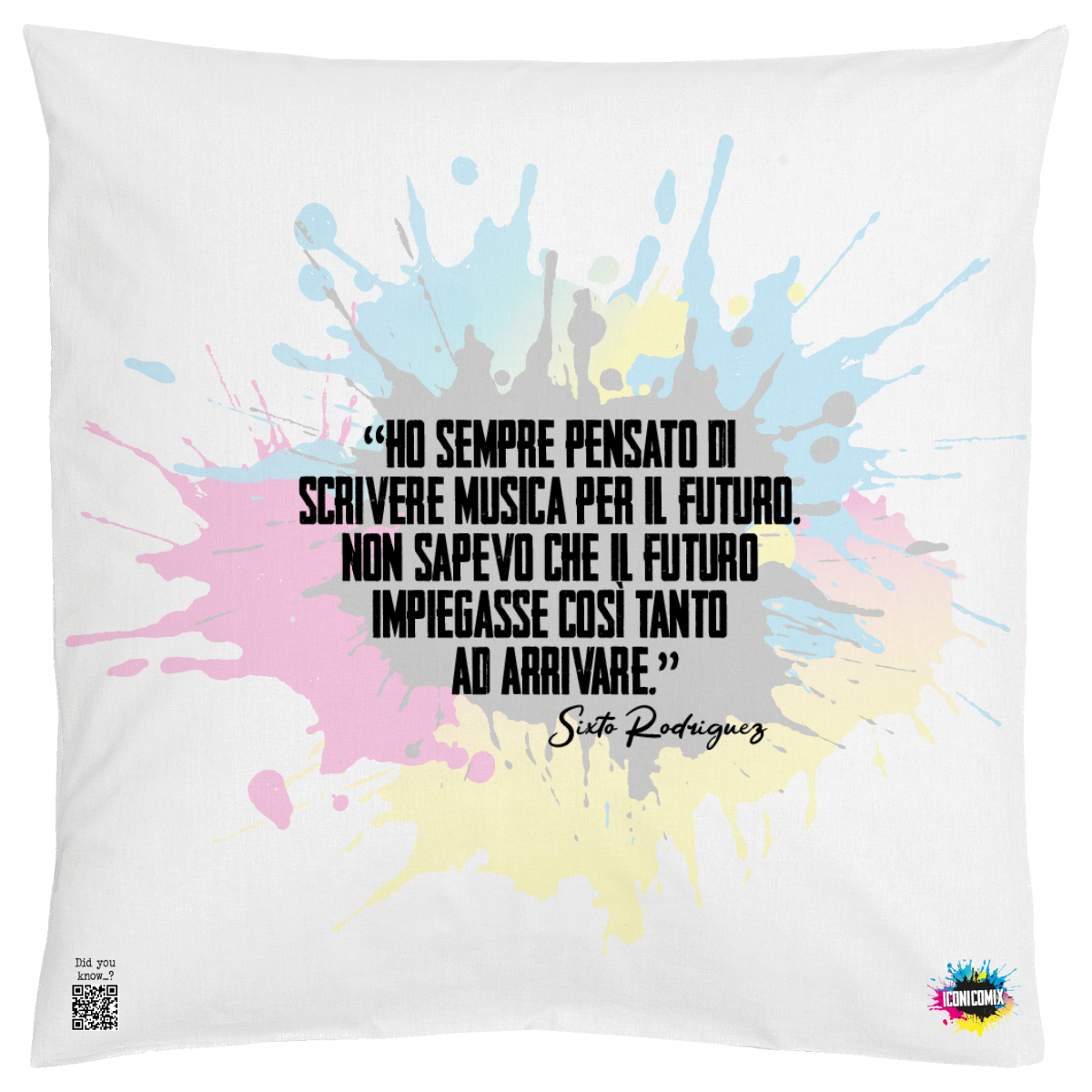 In ogni nostra grafica è presente anche un QR code che reindirizza al sito iconicomix.com, alla pagina ufficiale dell’icona che hai scelto. Una porta digitale che racconta la sua storia, le sue frasi e il suo mondo.