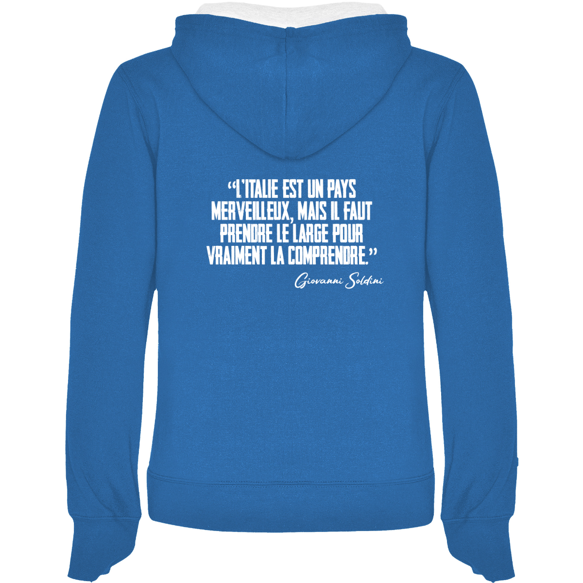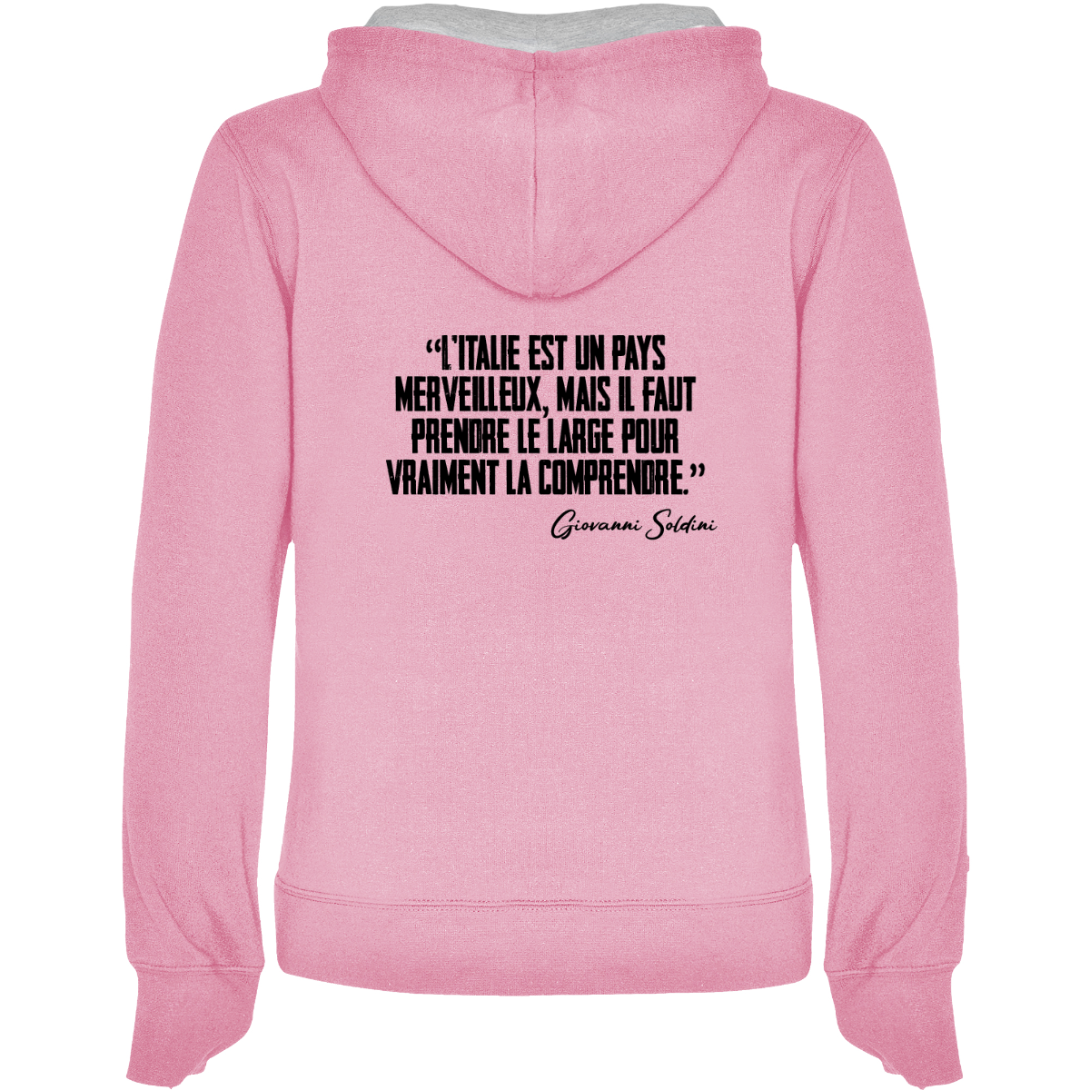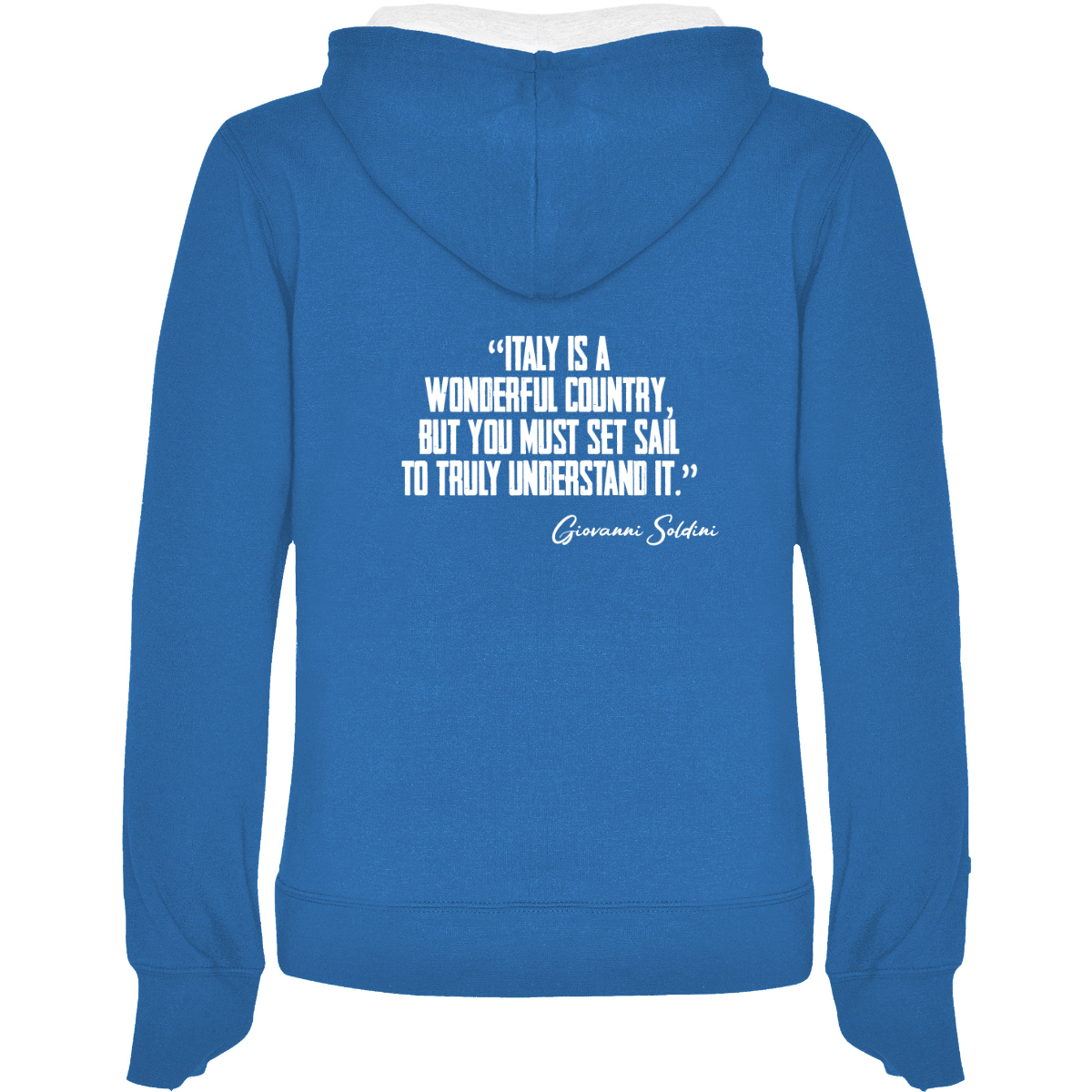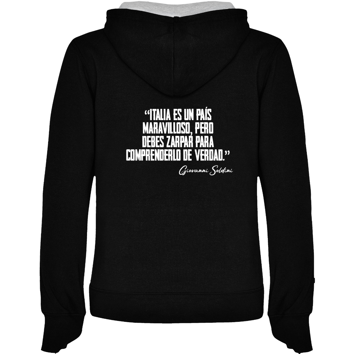 Felpa con cappuccio, anche  bicolore, tessuto doppio, con cordone regolabile. Tasca frontale. Costine 1x1 su polsini e girovita. 50% cotone / 50% poliestere, interno felpato, 280 g/m².