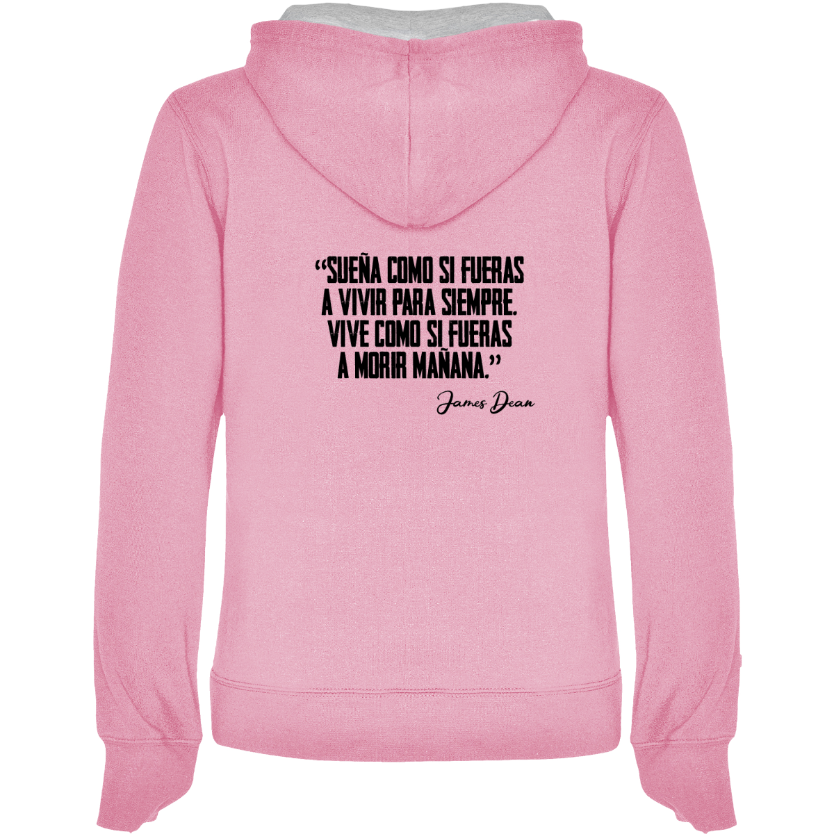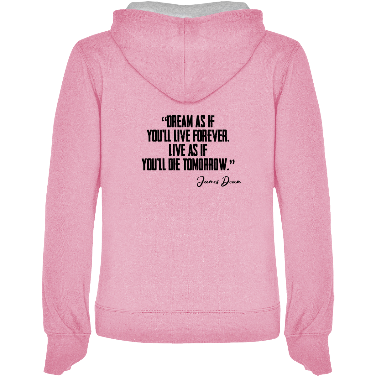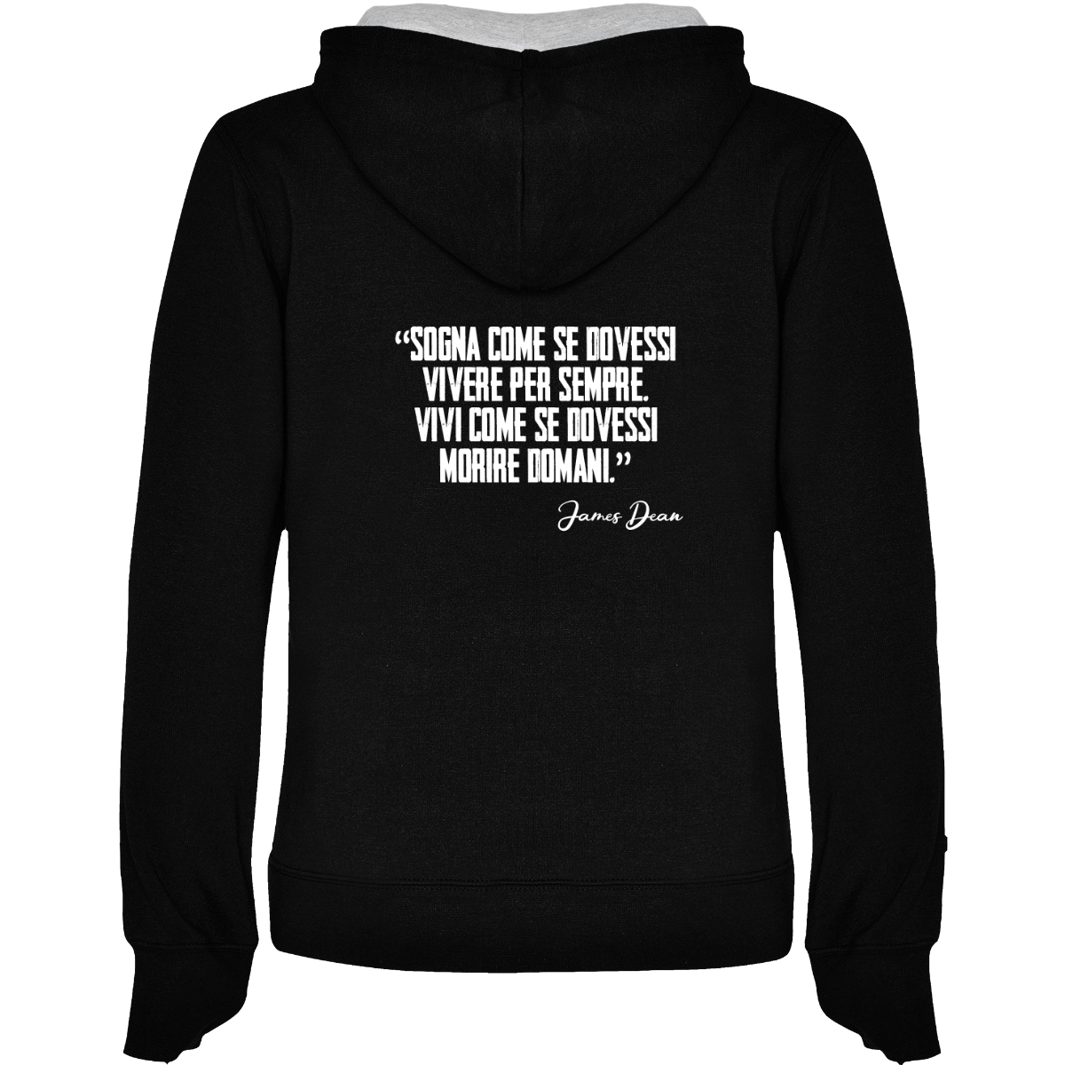 Felpa con cappuccio, anche  bicolore, tessuto doppio, con cordone regolabile. Tasca frontale. Costine 1x1 su polsini e girovita. 50% cotone / 50% poliestere, interno felpato, 280 g/m².