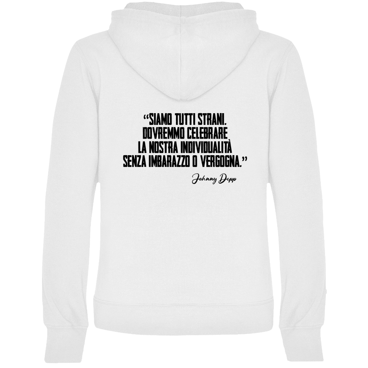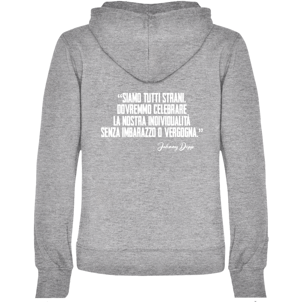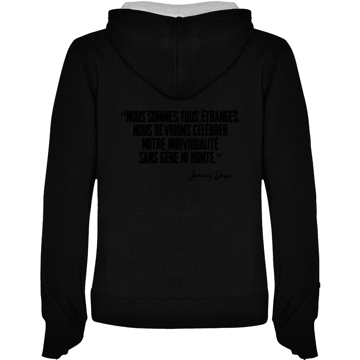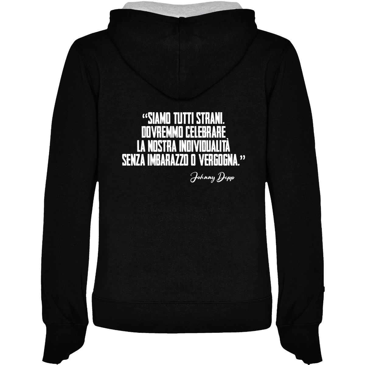 Felpa con cappuccio, anche  bicolore, tessuto doppio, con cordone regolabile. Tasca frontale. Costine 1x1 su polsini e girovita. 50% cotone / 50% poliestere, interno felpato, 280 g/m².