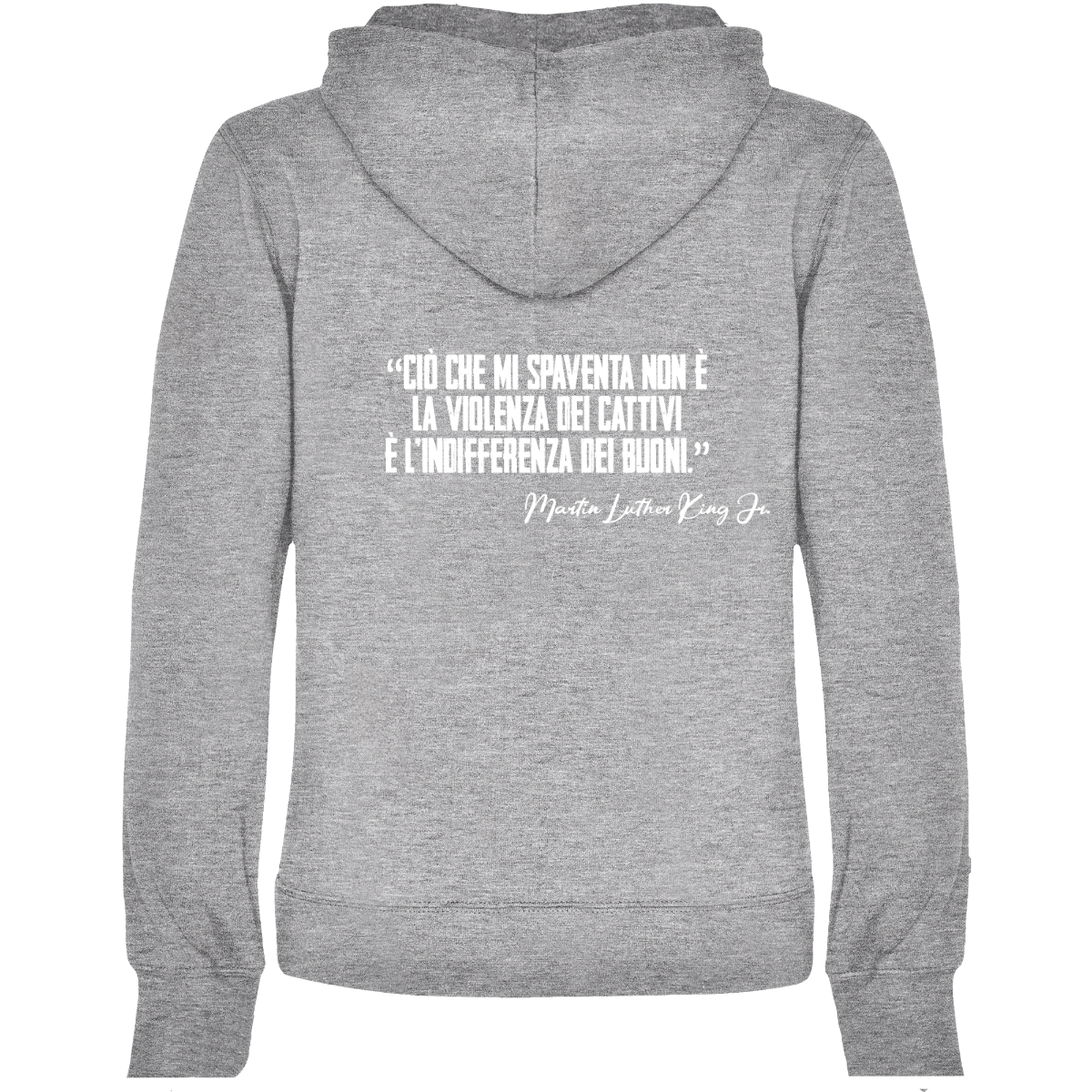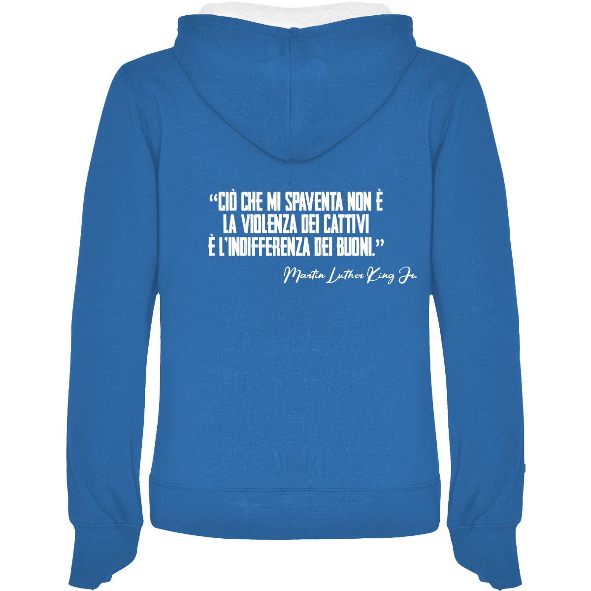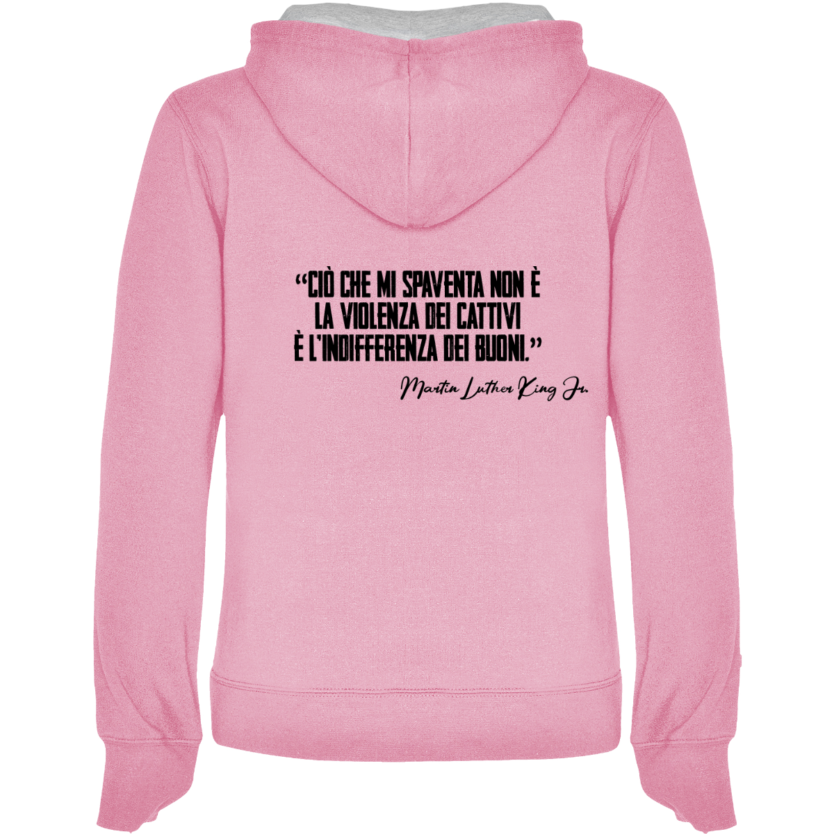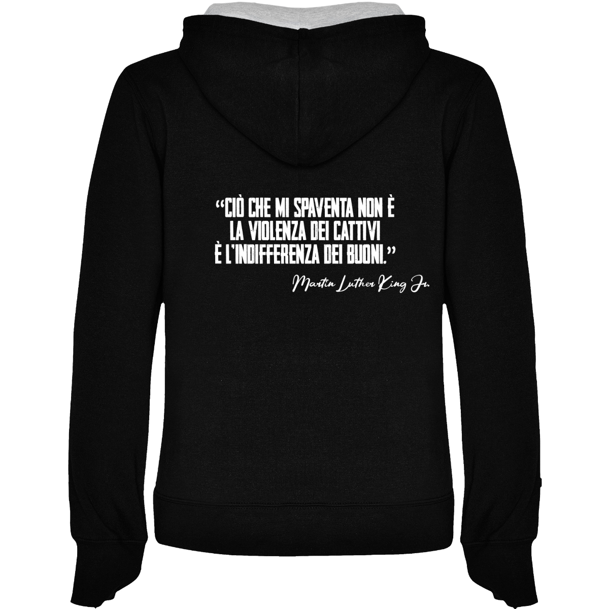 Felpa con cappuccio, anche  bicolore, tessuto doppio, con cordone regolabile. Tasca frontale. Costine 1x1 su polsini e girovita. 50% cotone / 50% poliestere, interno felpato, 280 g/m².