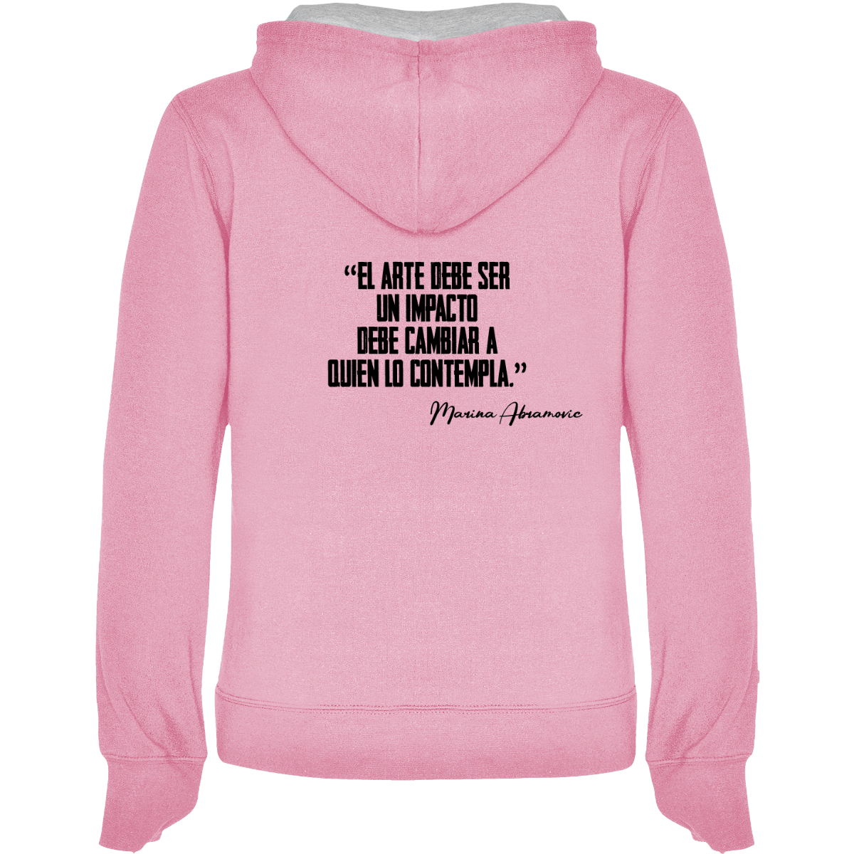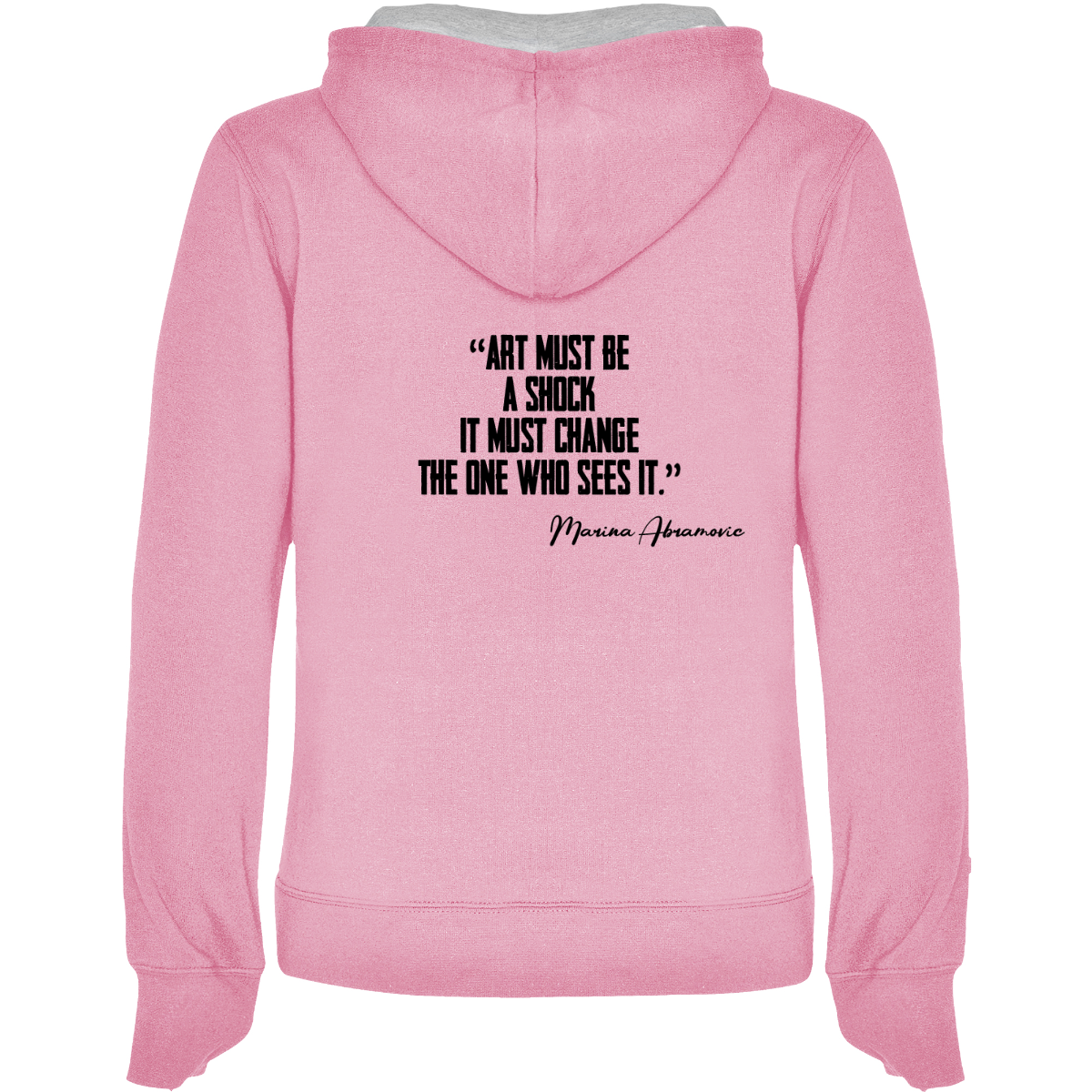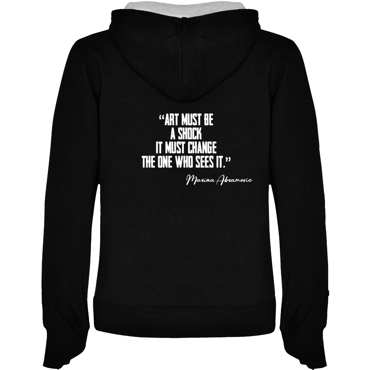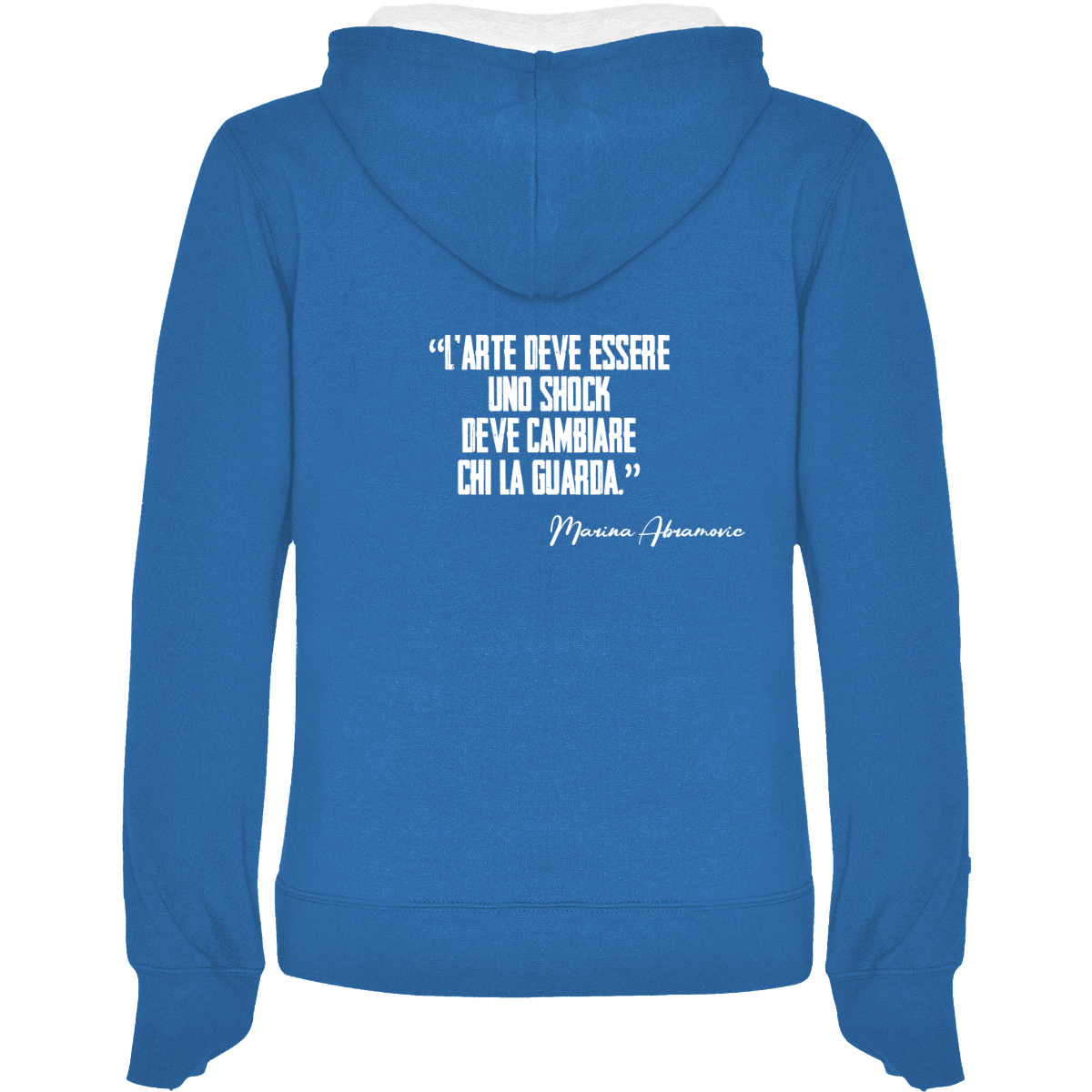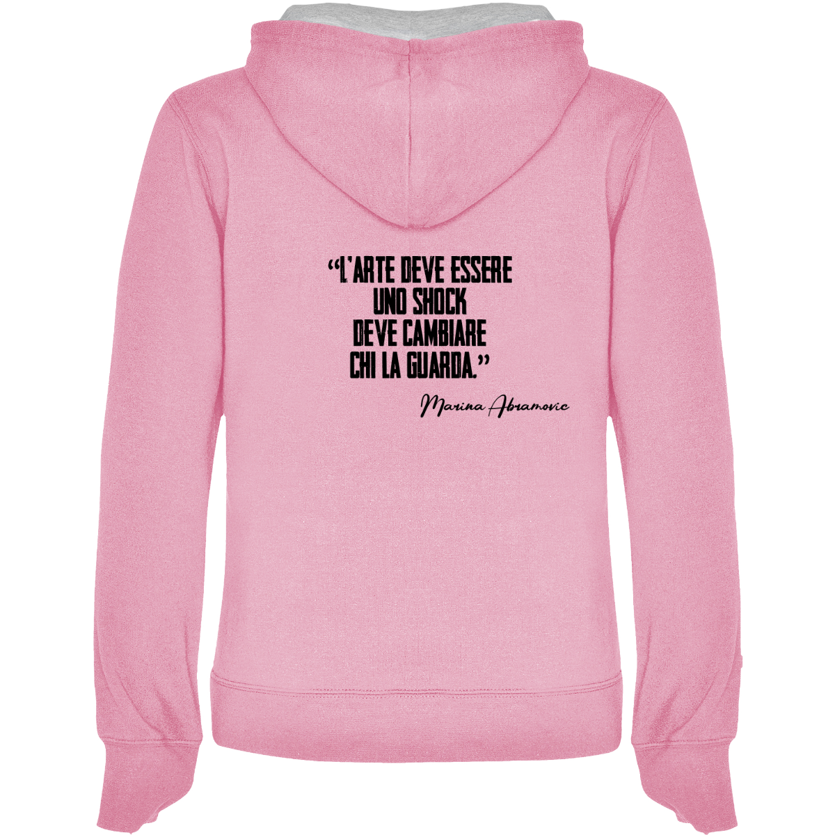 Felpa con cappuccio, anche  bicolore, tessuto doppio, con cordone regolabile. Tasca frontale. Costine 1x1 su polsini e girovita. 50% cotone / 50% poliestere, interno felpato, 280 g/m².