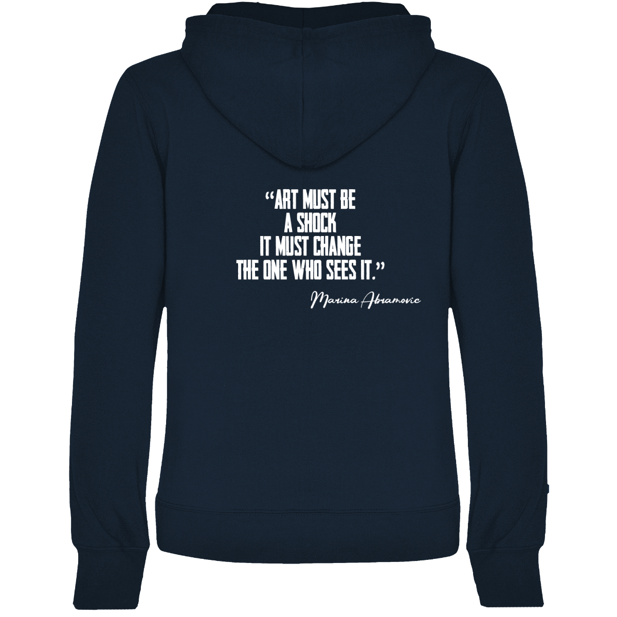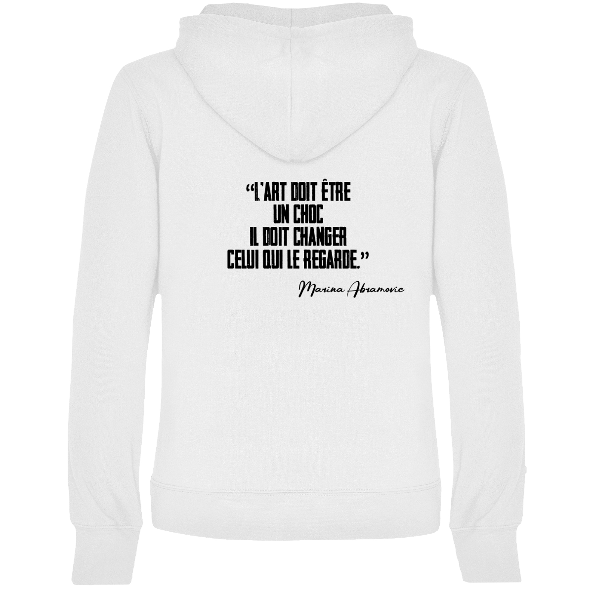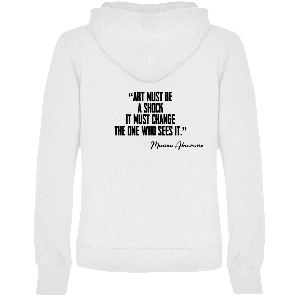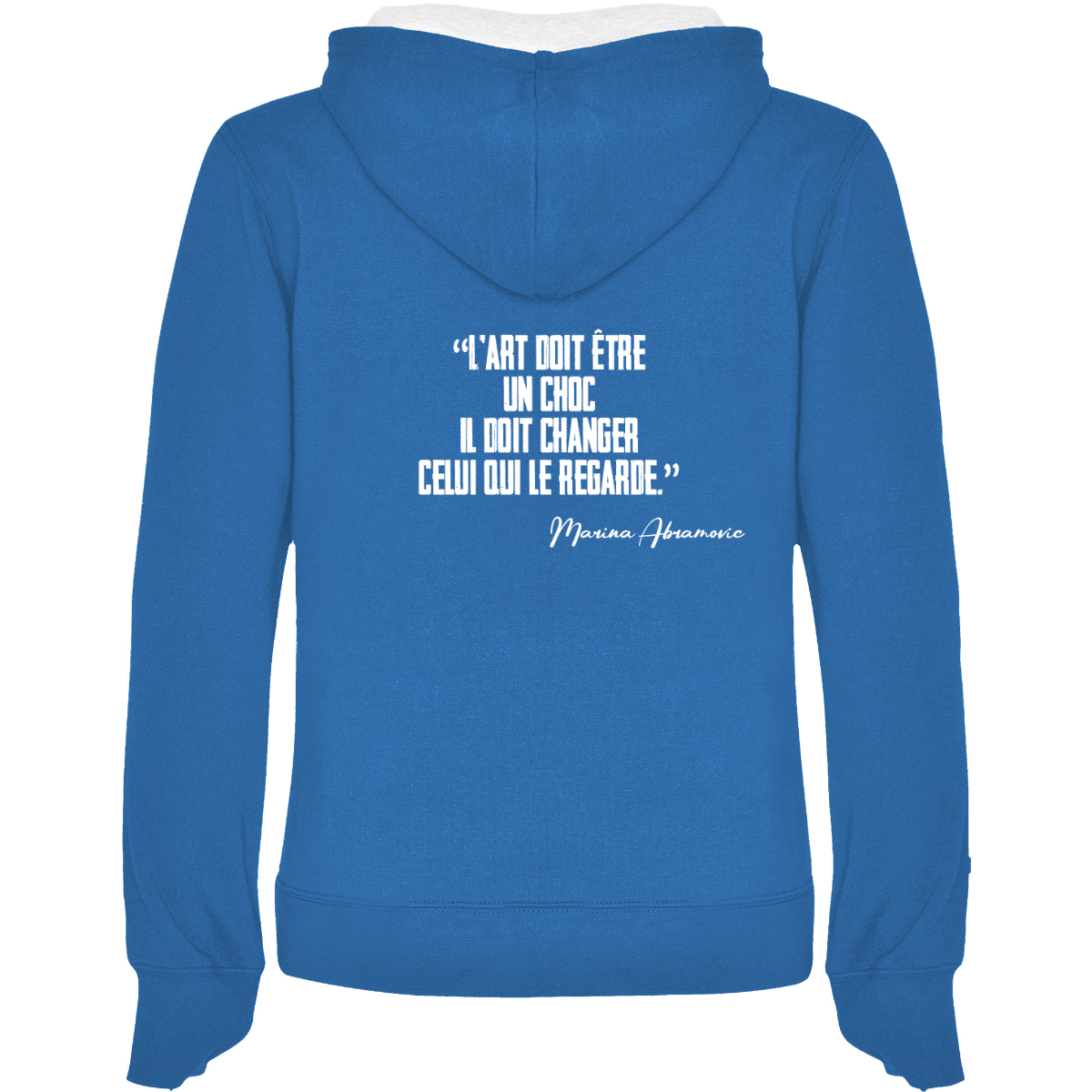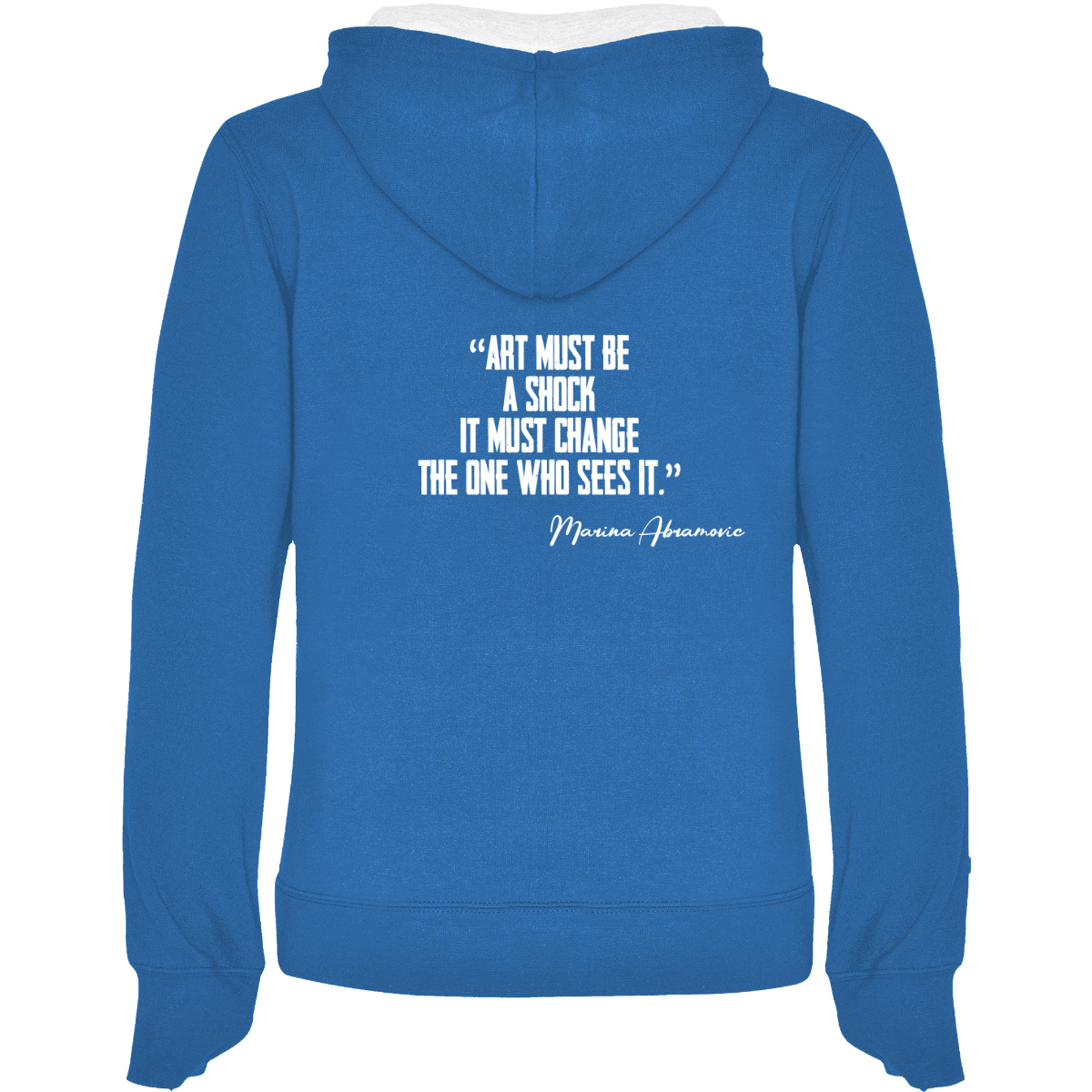 Felpa con cappuccio, anche  bicolore, tessuto doppio, con cordone regolabile. Tasca frontale. Costine 1x1 su polsini e girovita. 50% cotone / 50% poliestere, interno felpato, 280 g/m².