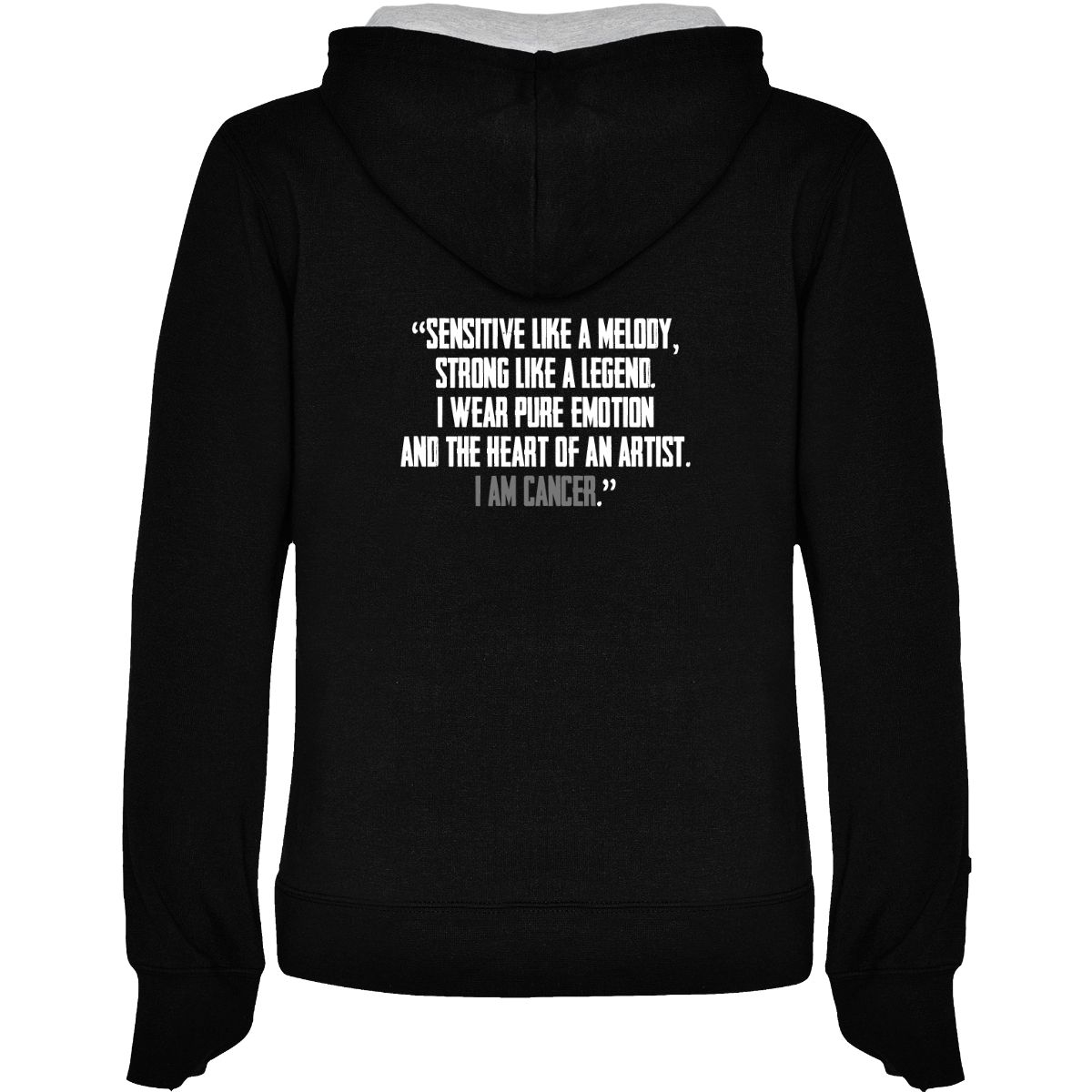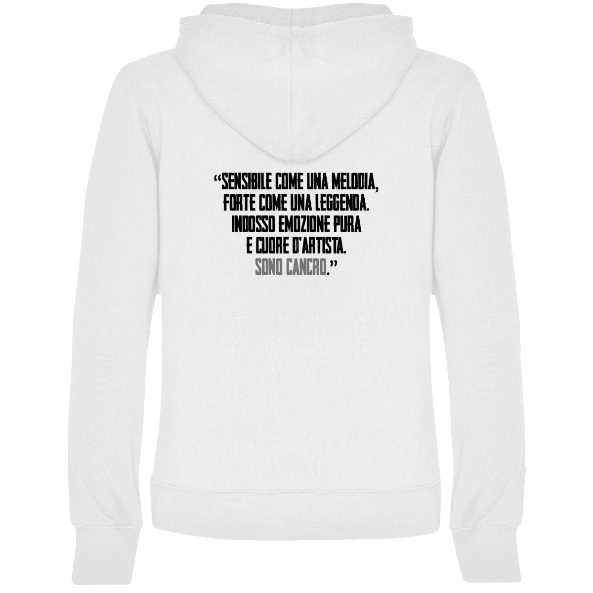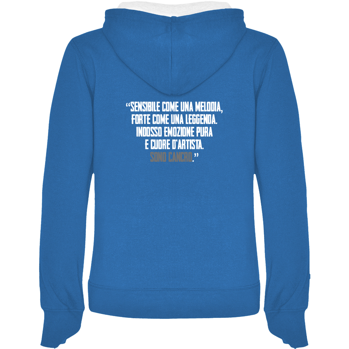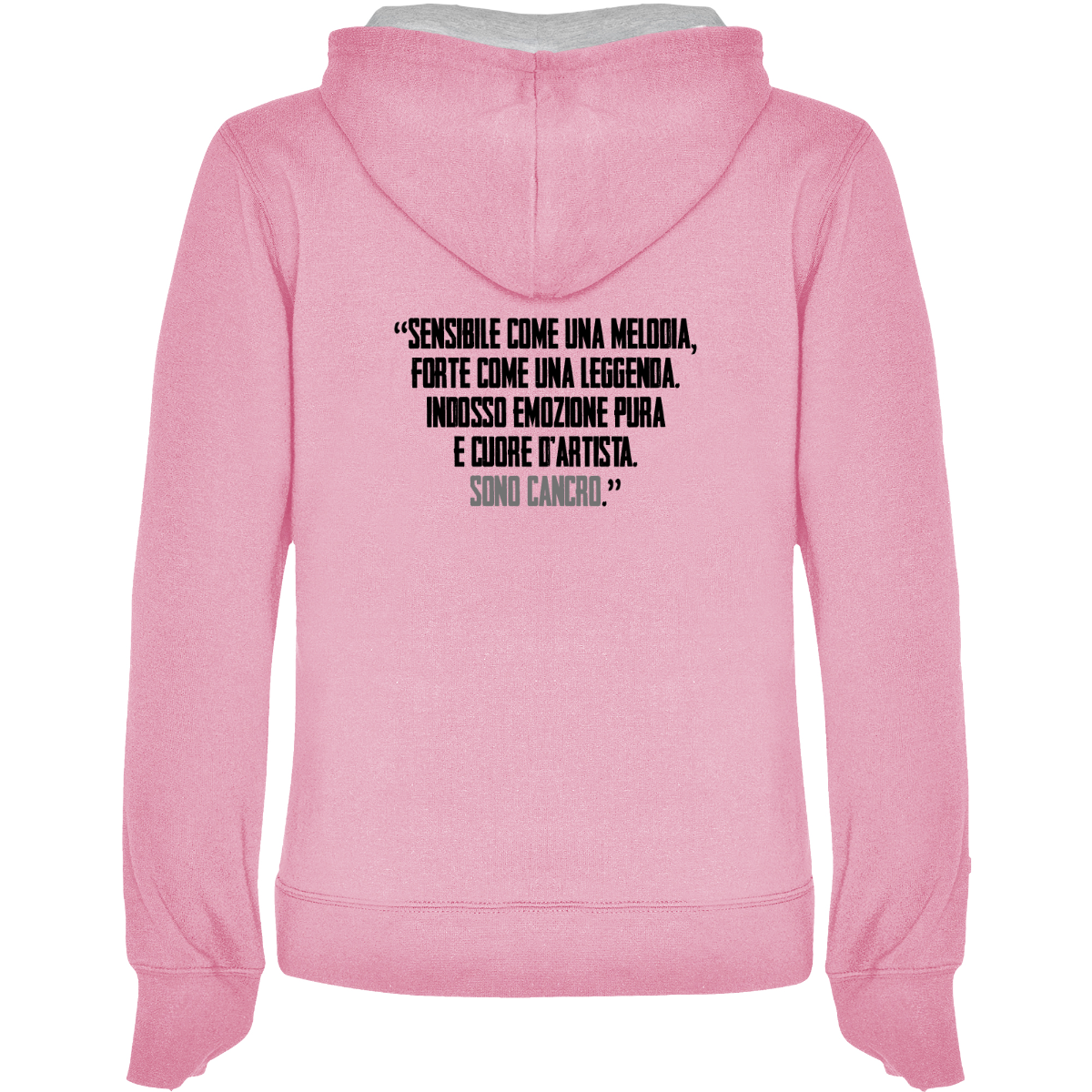 Felpa con cappuccio, anche  bicolore, tessuto doppio, con cordone regolabile. Tasca frontale. Costine 1x1 su polsini e girovita. 50% cotone / 50% poliestere, interno felpato, 280 g/m².