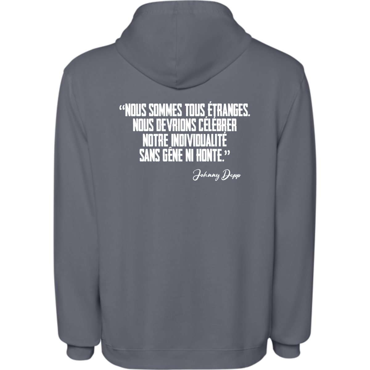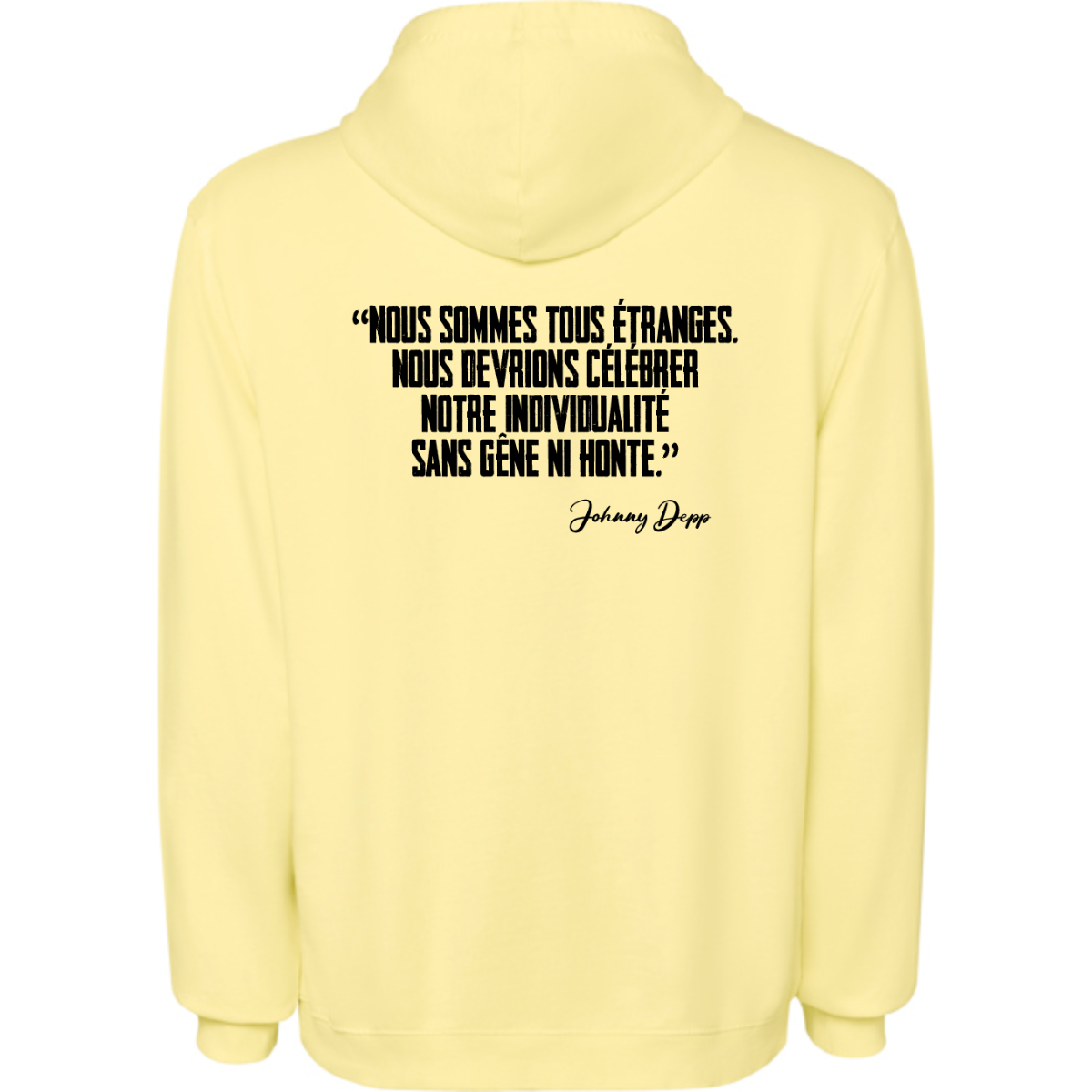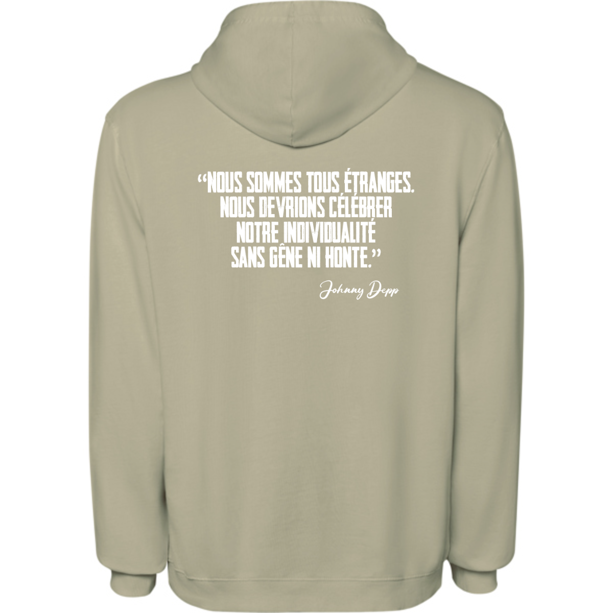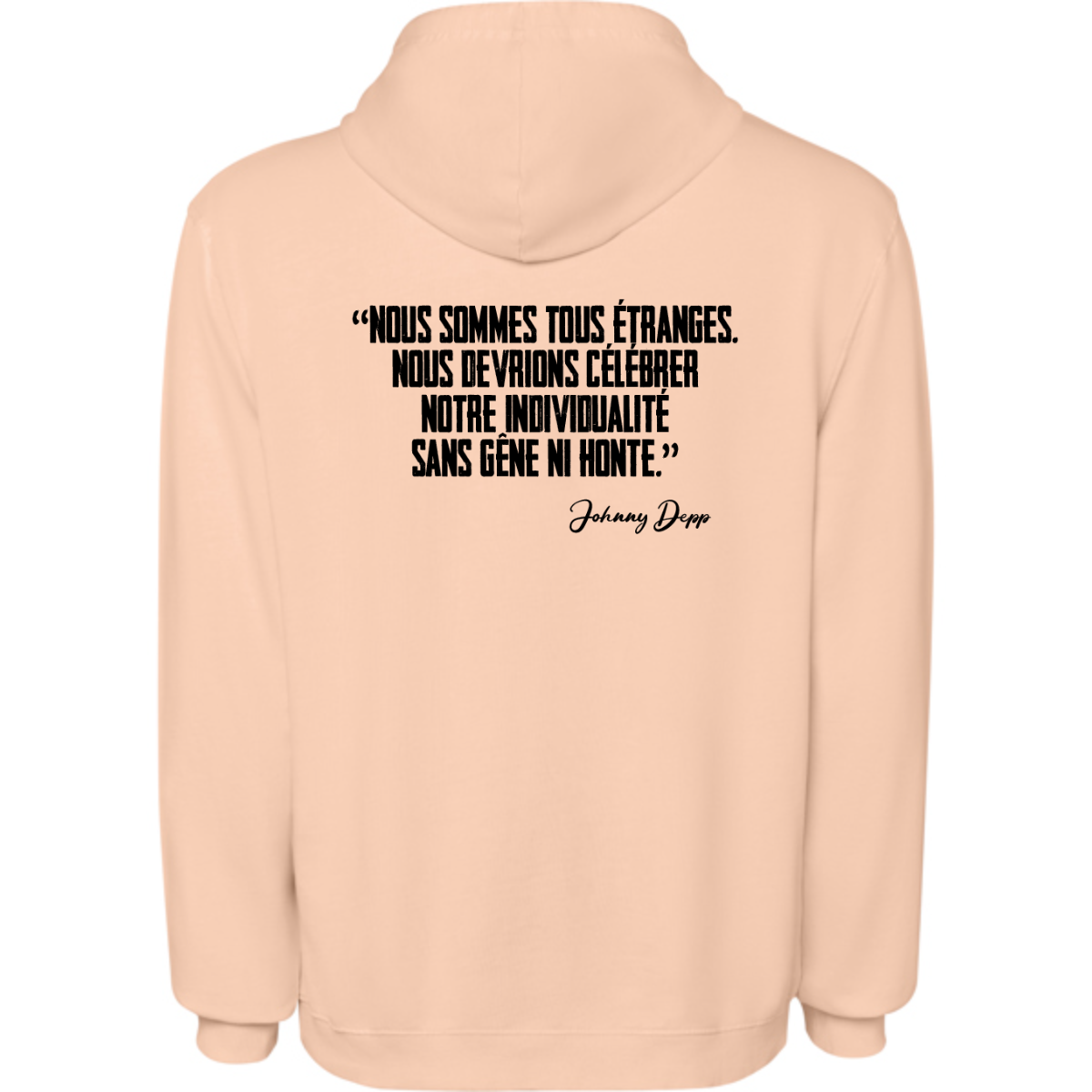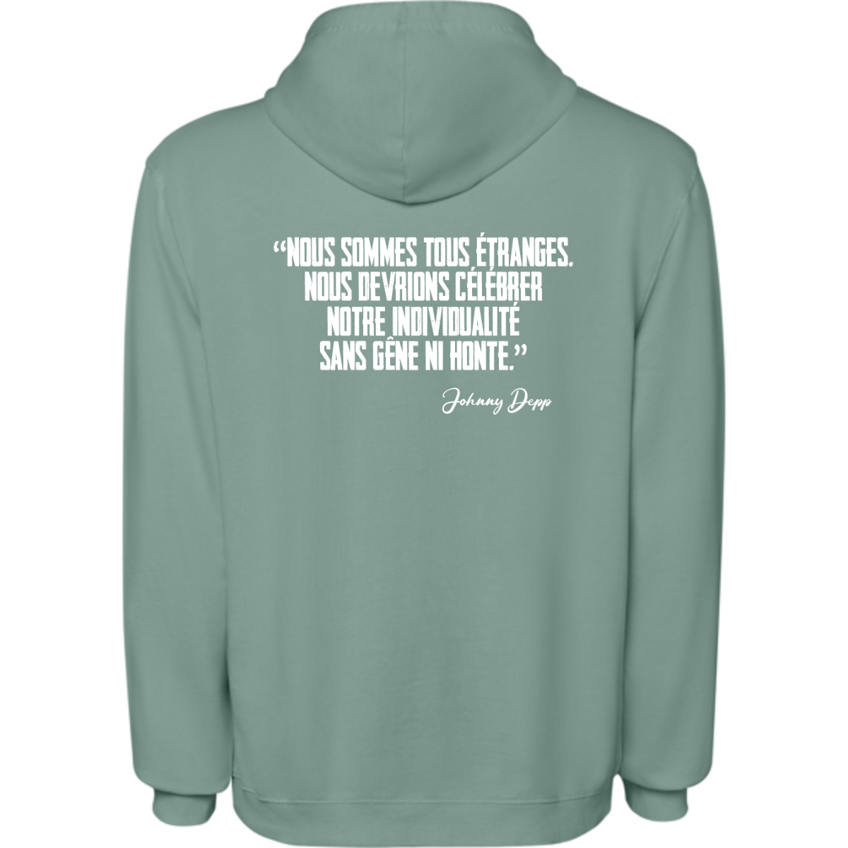 Felpa unisex con cappuccio foderato tono su tono, 100% cotone con finitura acid wash. Polsini e orlo in costina 2x1. Cordoni piatti tono su tono. Collo con copricuciture tono su tono. Tasca a canguro.