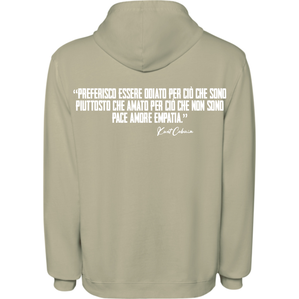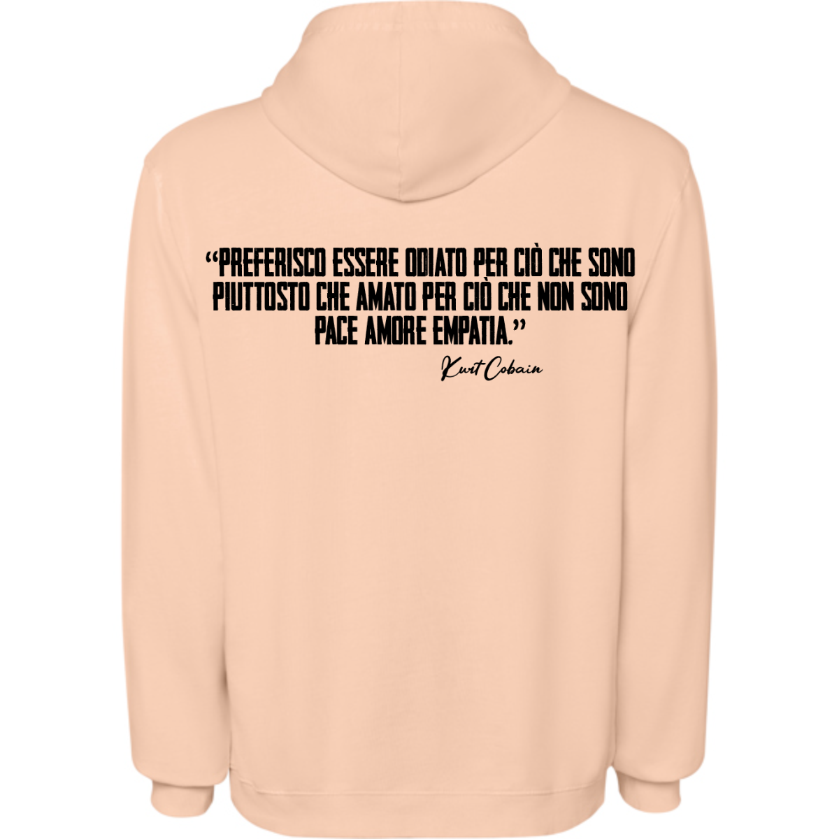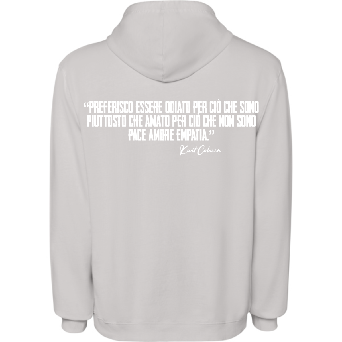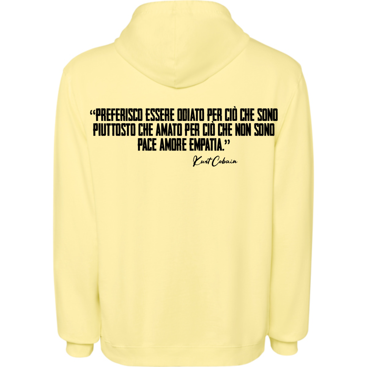Felpa unisex con cappuccio foderato tono su tono, 100% cotone con finitura acid wash. Polsini e orlo in costina 2x1. Cordoni piatti tono su tono. Collo con copricuciture tono su tono. Tasca a canguro.