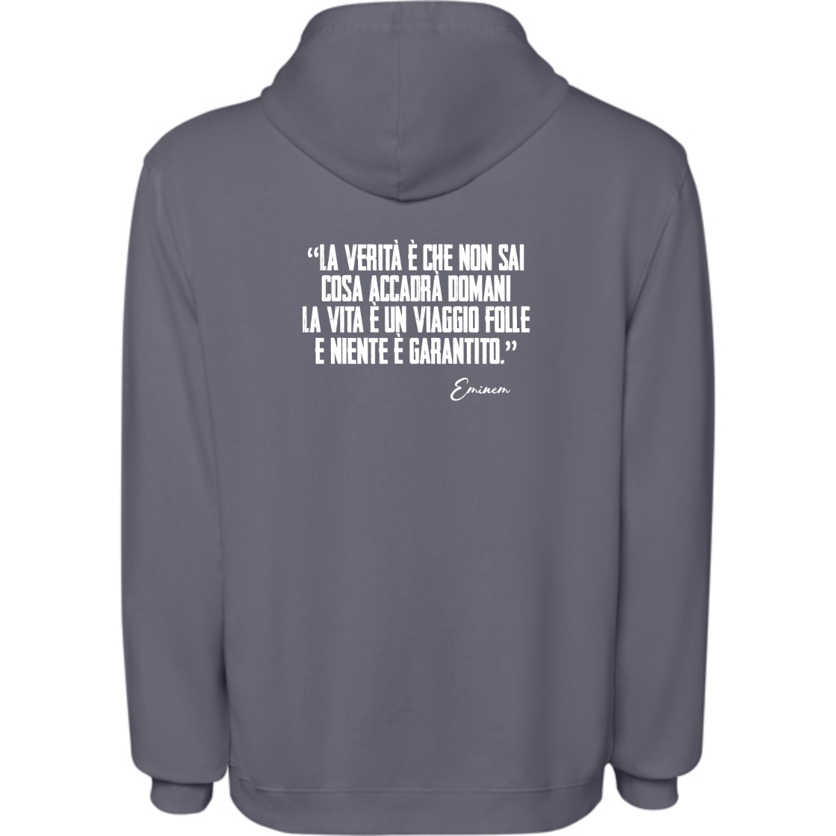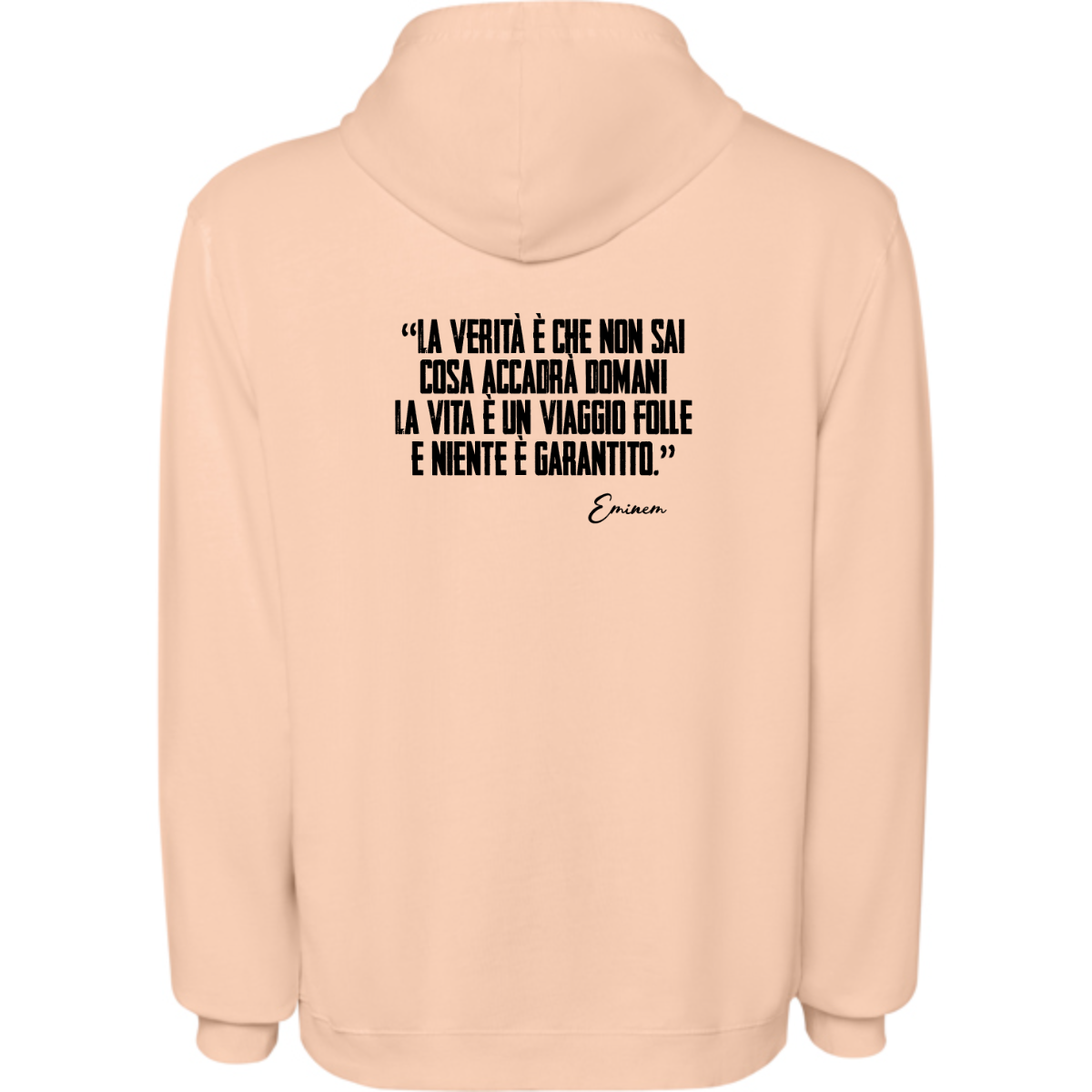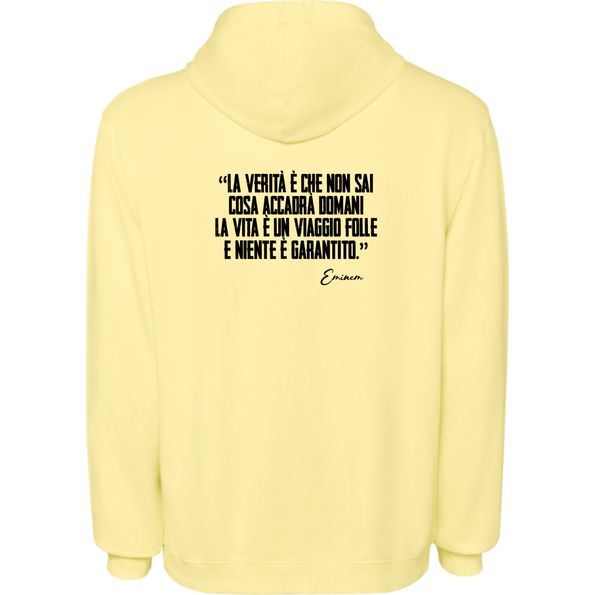 Felpa unisex con cappuccio foderato tono su tono, 100% cotone con finitura acid wash. Polsini e orlo in costina 2x1. Cordoni piatti tono su tono. Collo con copricuciture tono su tono. Tasca a canguro.