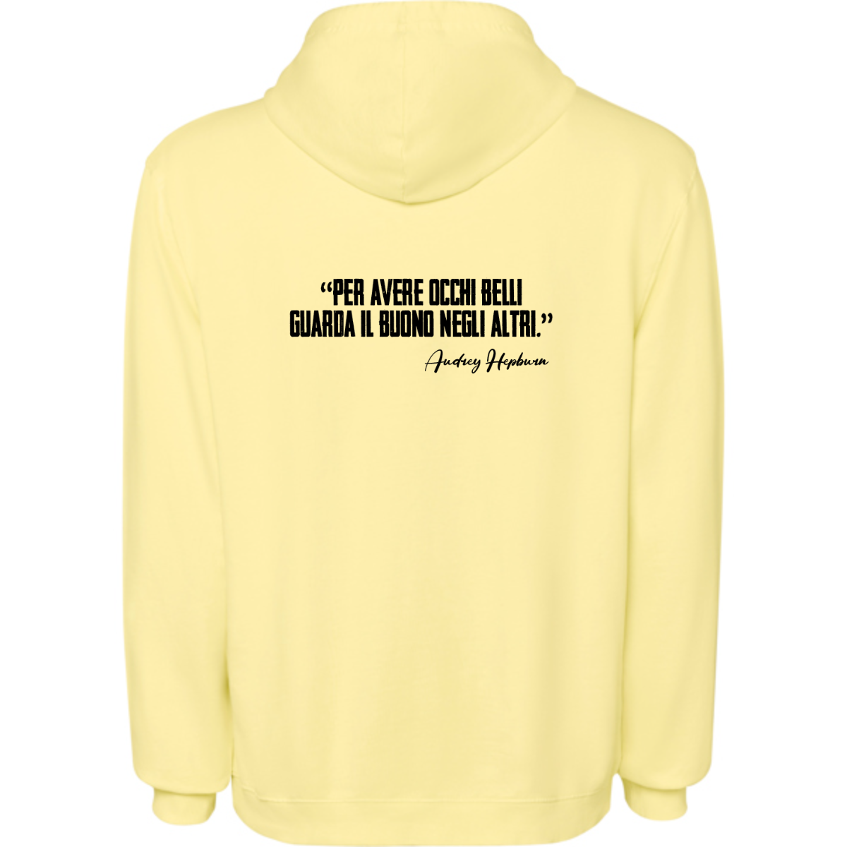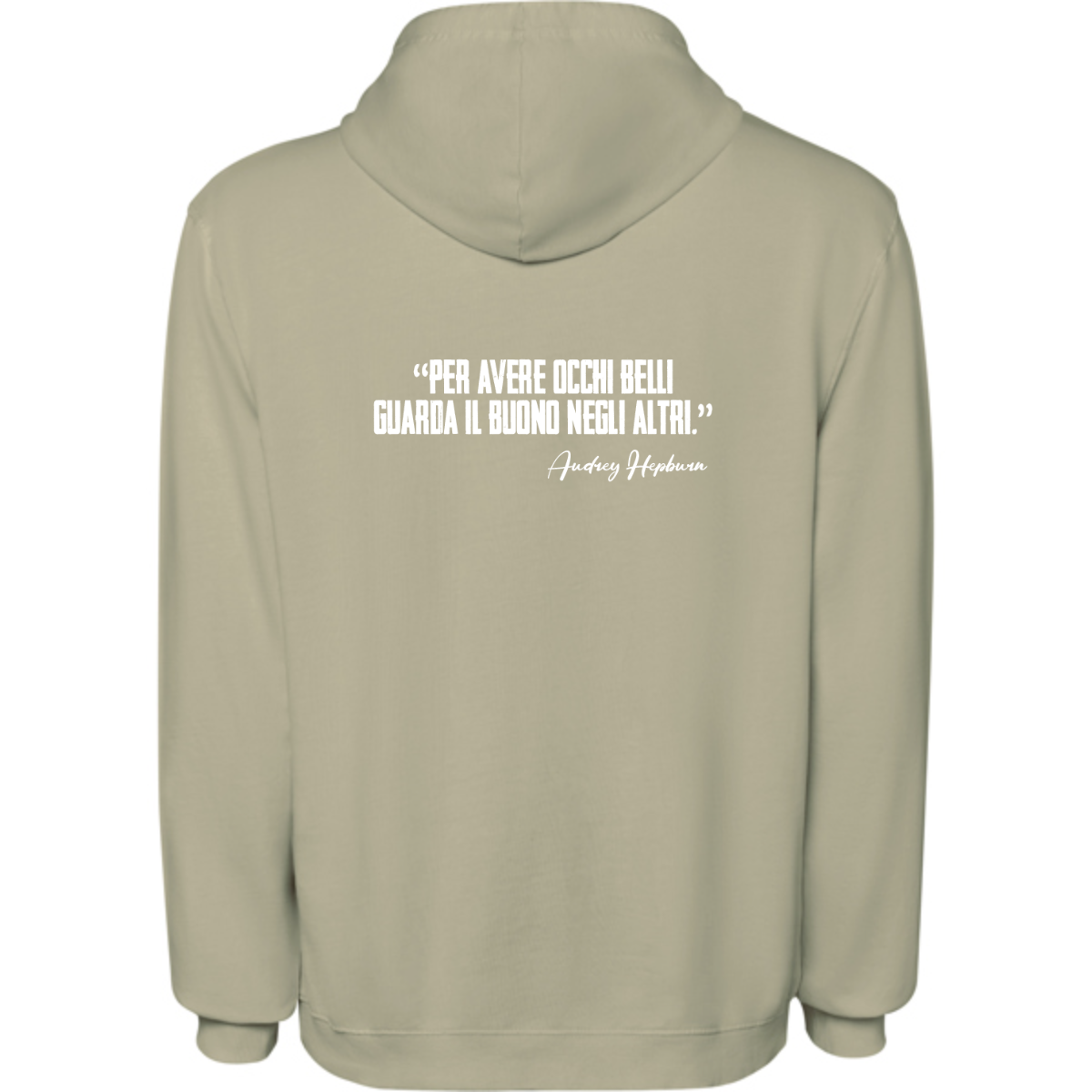 Felpa unisex con cappuccio, in cotone non garzato con effetto lavato. Tasca a marsupio. Polsini e vita a coste 2x1 con elastan. Coulisse piatta tono su tono con occhielli in metallo. Cuciture nastrate in tessuto coordinato. 100% cotone 250 g/m²