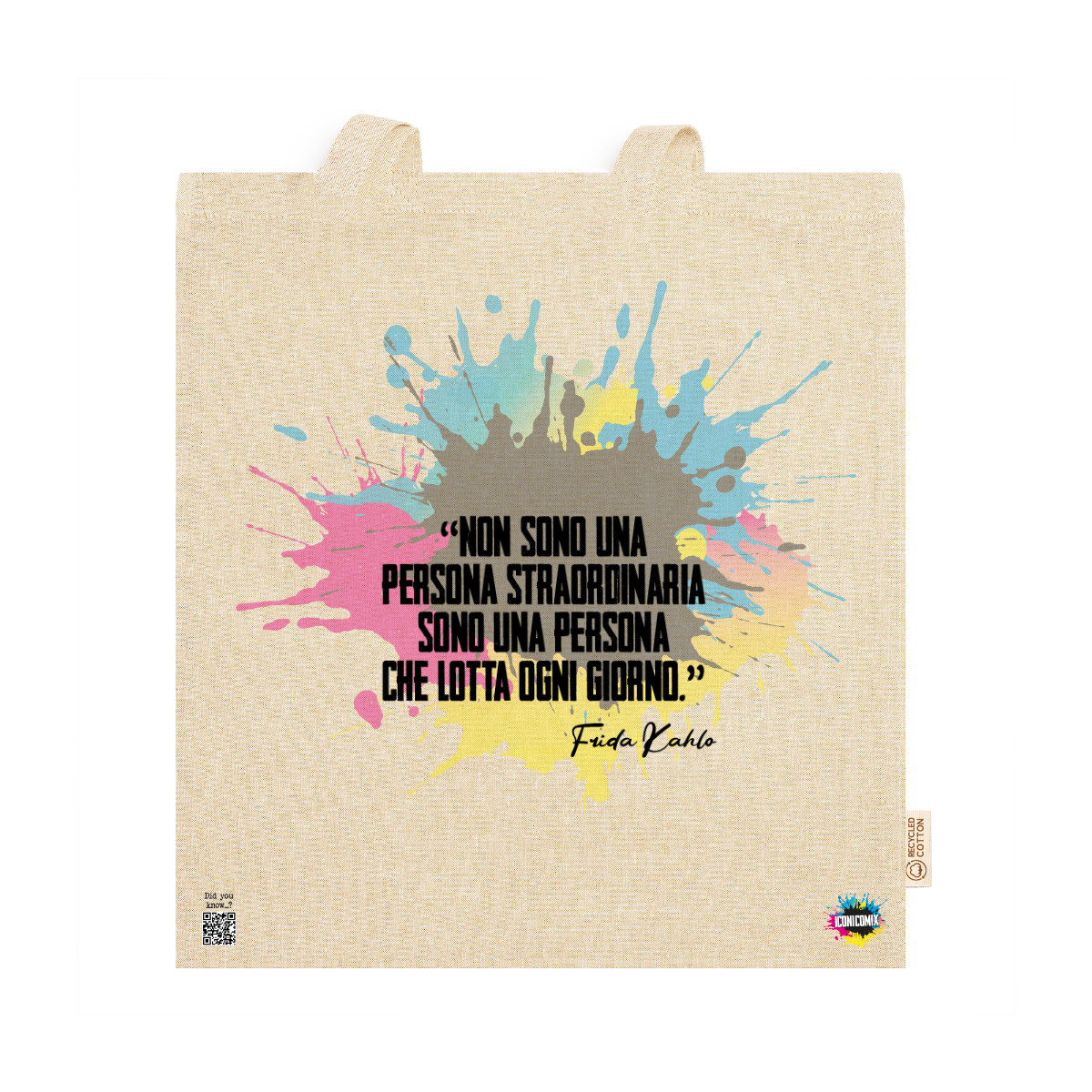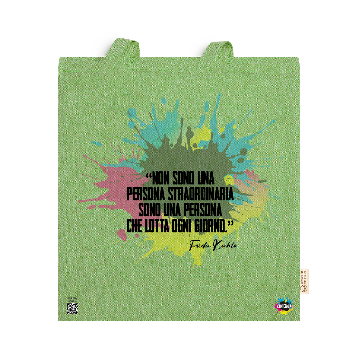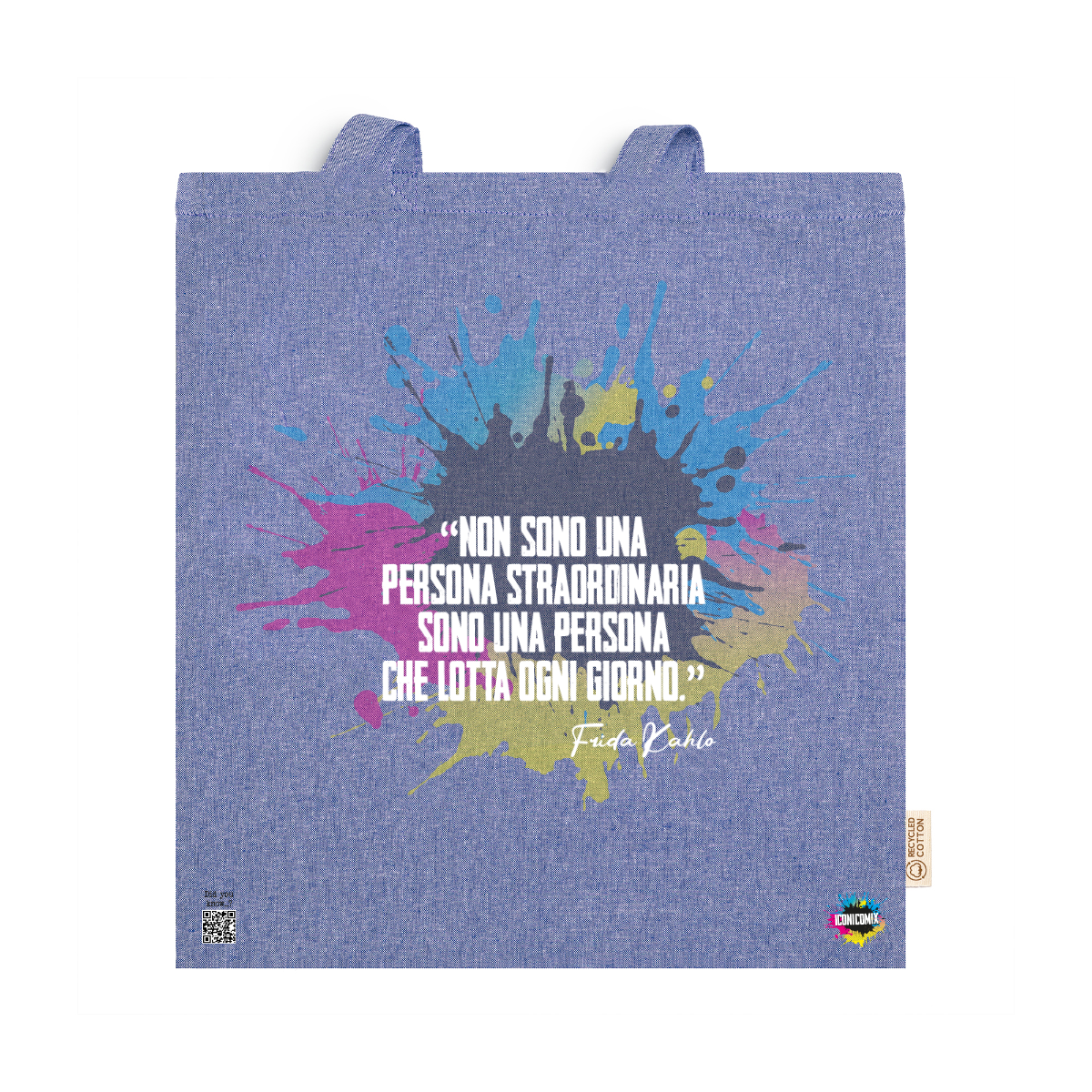 In ogni nostra grafica è presente anche un QR code che reindirizza al sito iconicomix.com, alla pagina ufficiale dell’icona che hai scelto. Una porta digitale che racconta la sua storia, le sue frasi e il suo mondo.