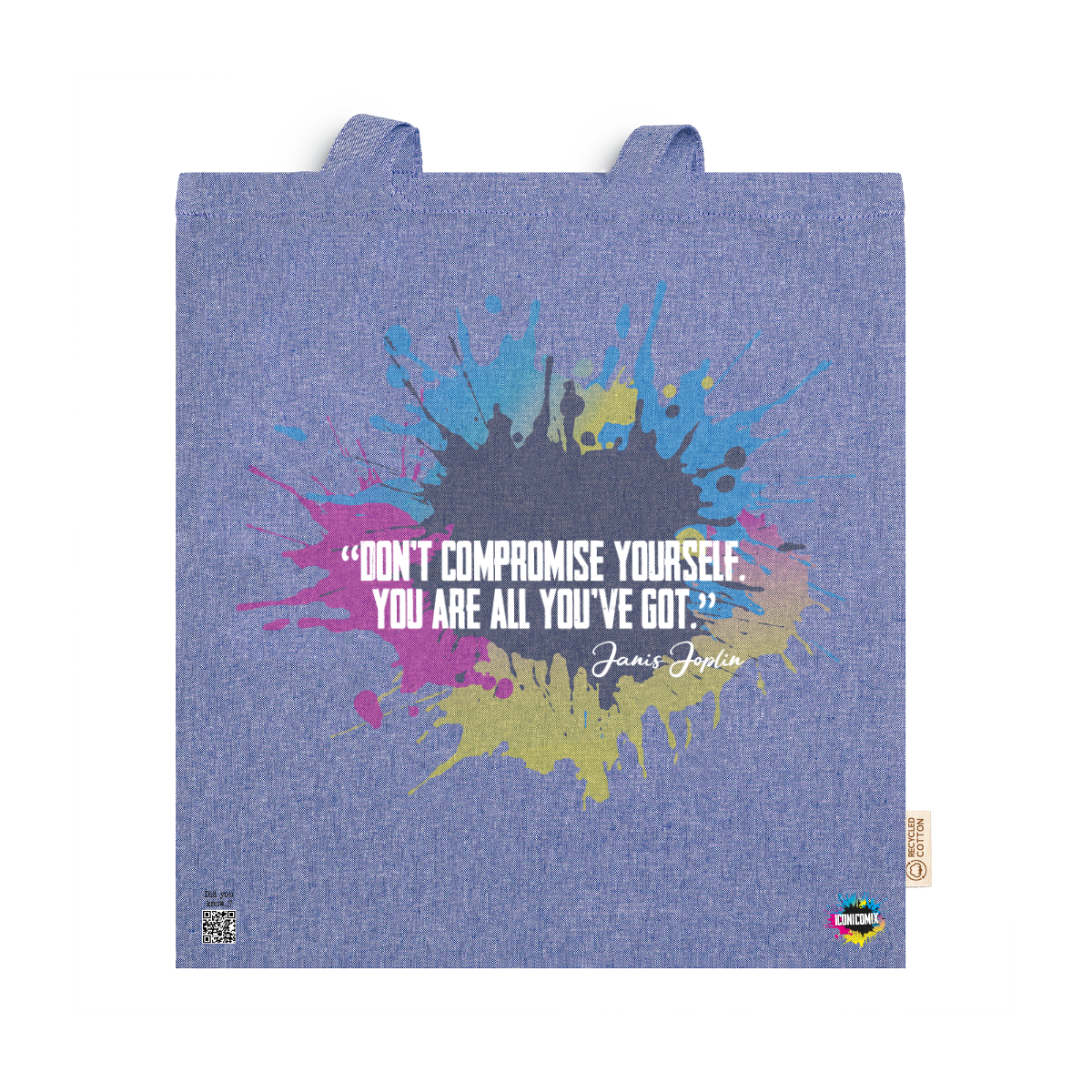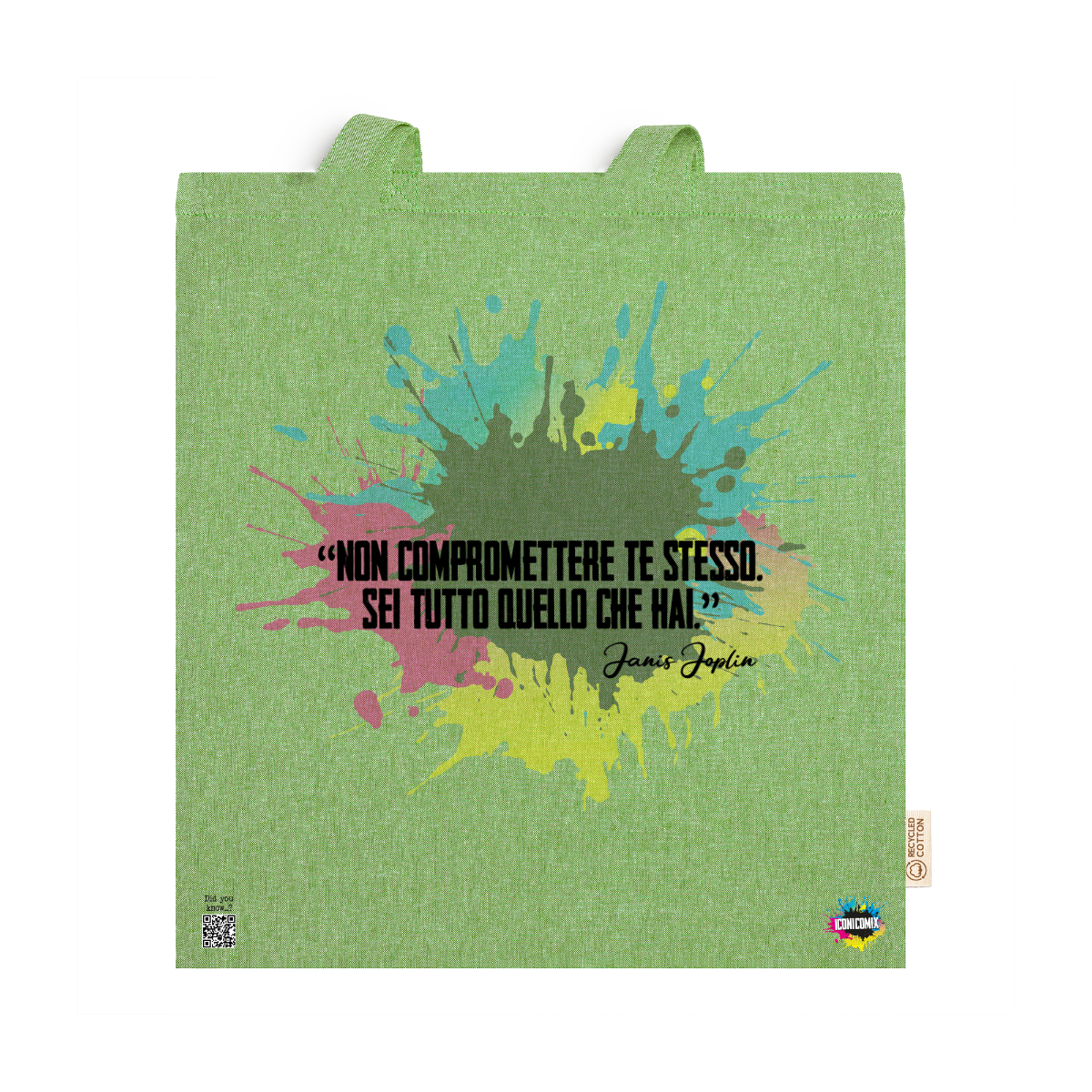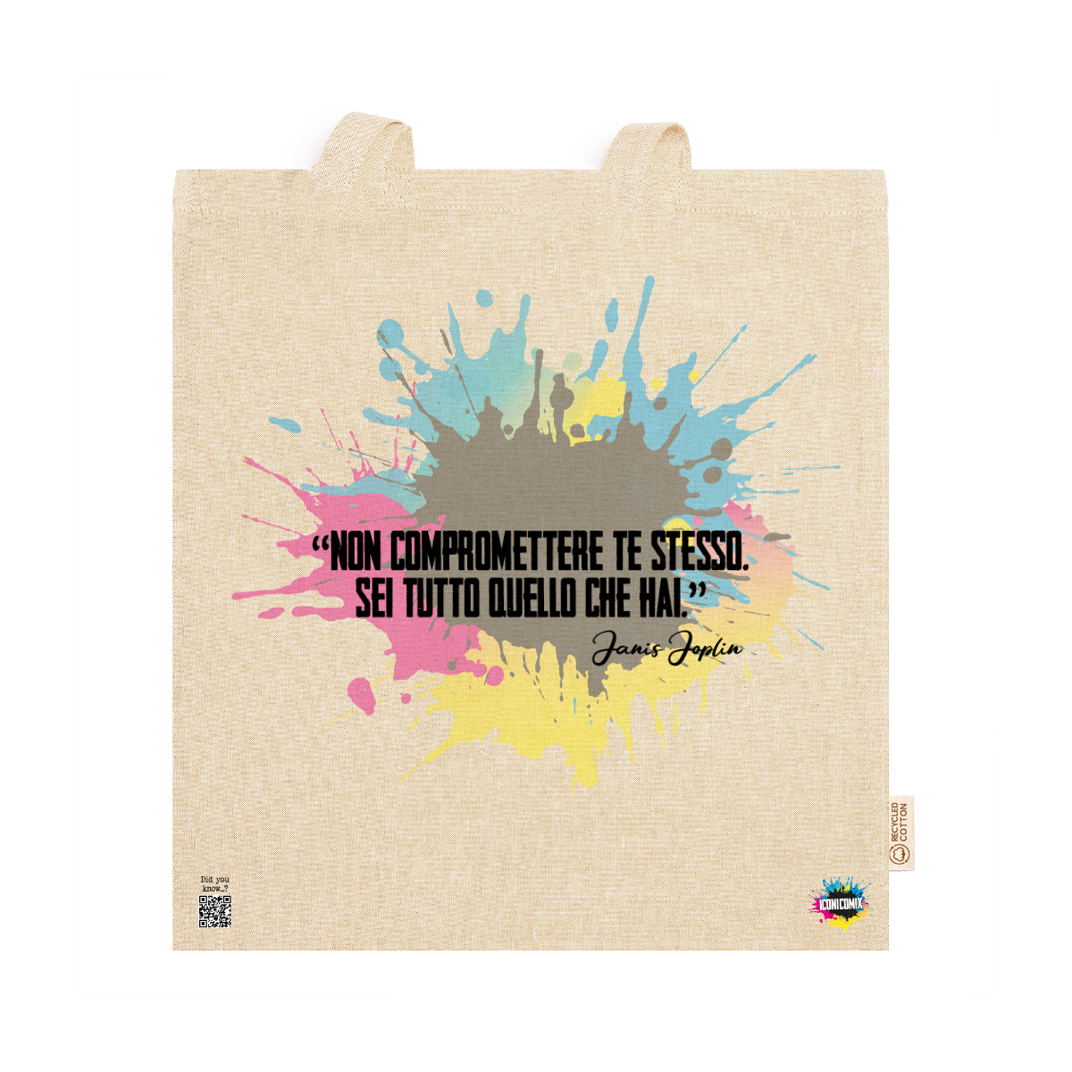 In ogni nostra grafica è presente anche un QR code che reindirizza al sito iconicomix.com, alla pagina ufficiale dell’icona che hai scelto. Una porta digitale che racconta la sua storia, le sue frasi e il suo mondo.