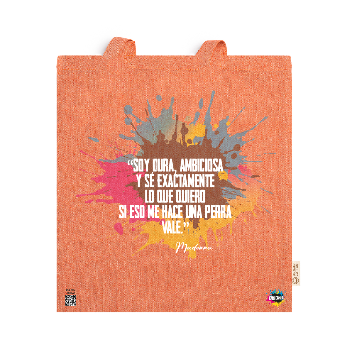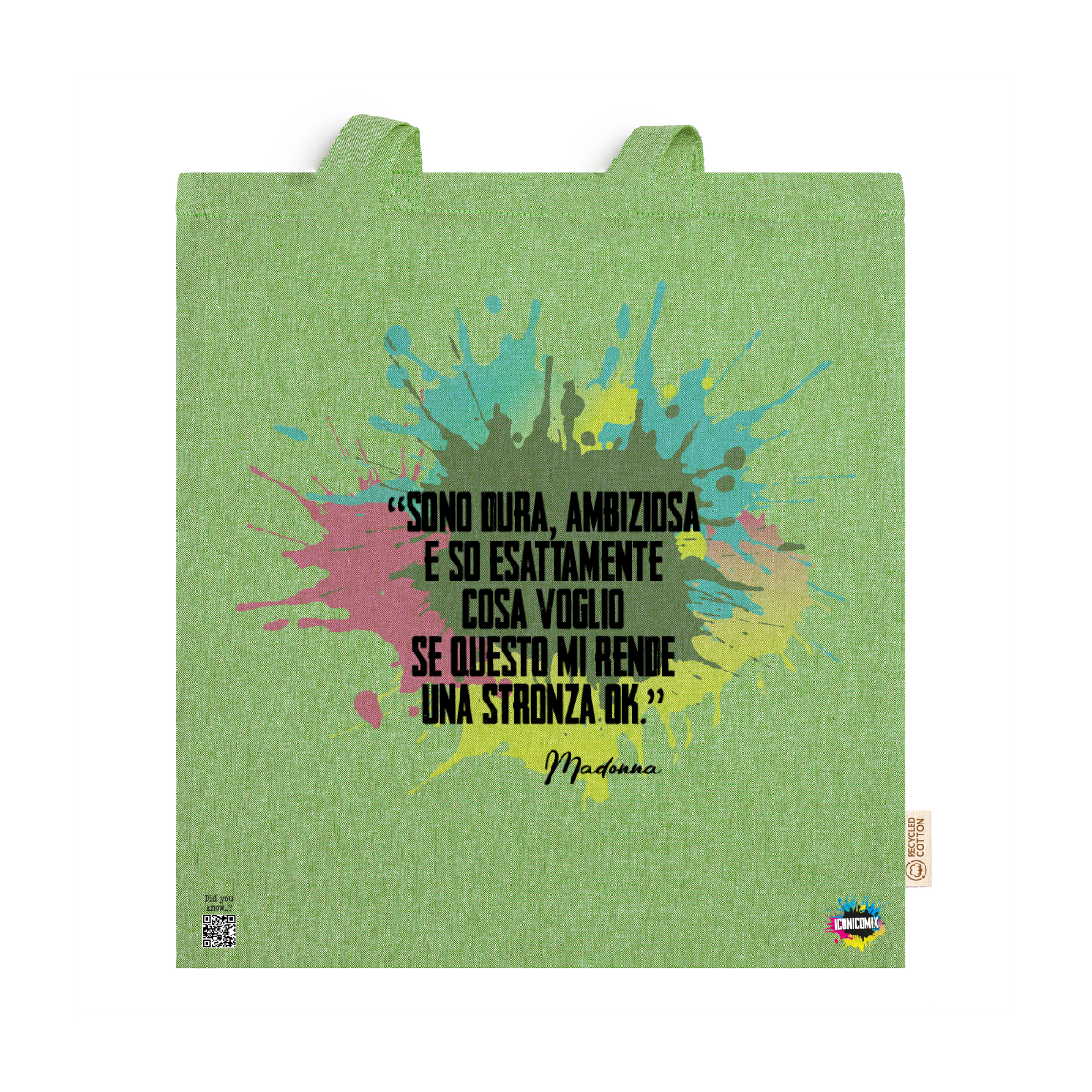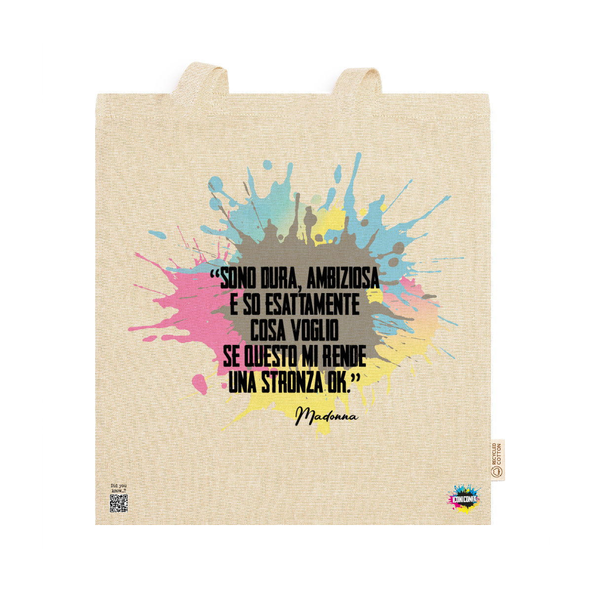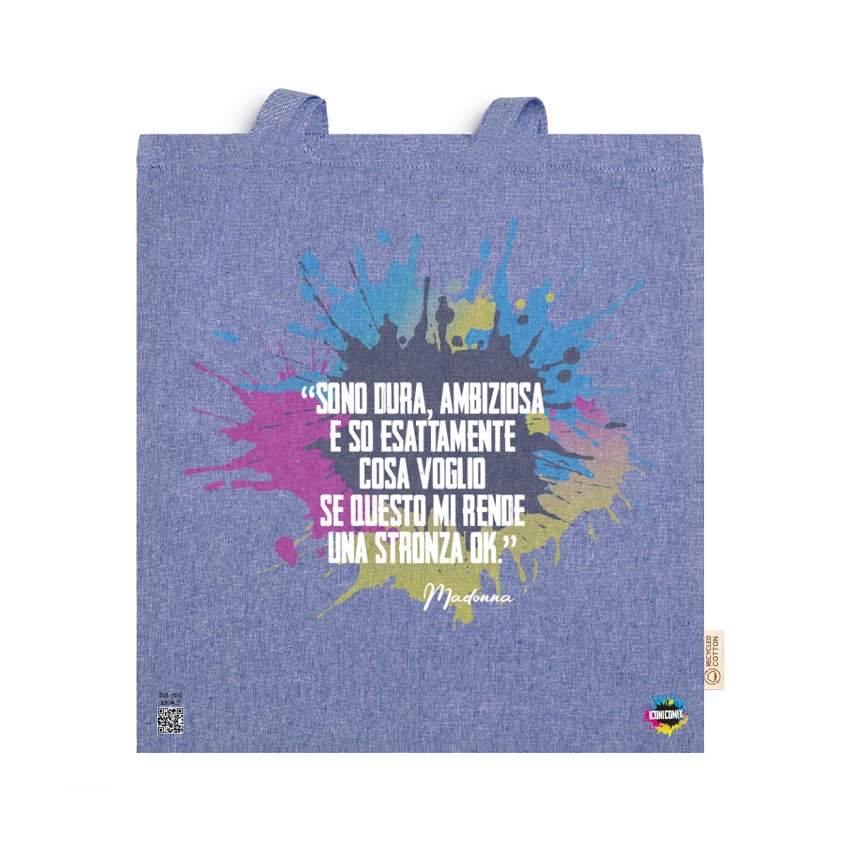 In ogni nostra grafica è presente anche un QR code che reindirizza al sito iconicomix.com, alla pagina ufficiale dell’icona che hai scelto. Una porta digitale che racconta la sua storia, le sue frasi e il suo mondo.