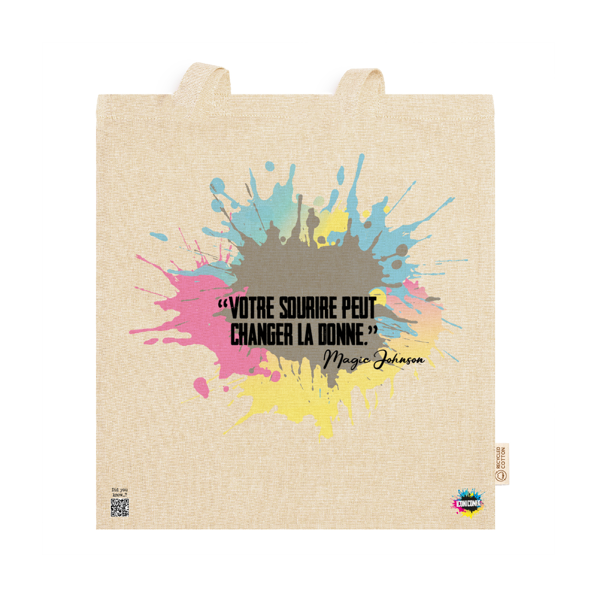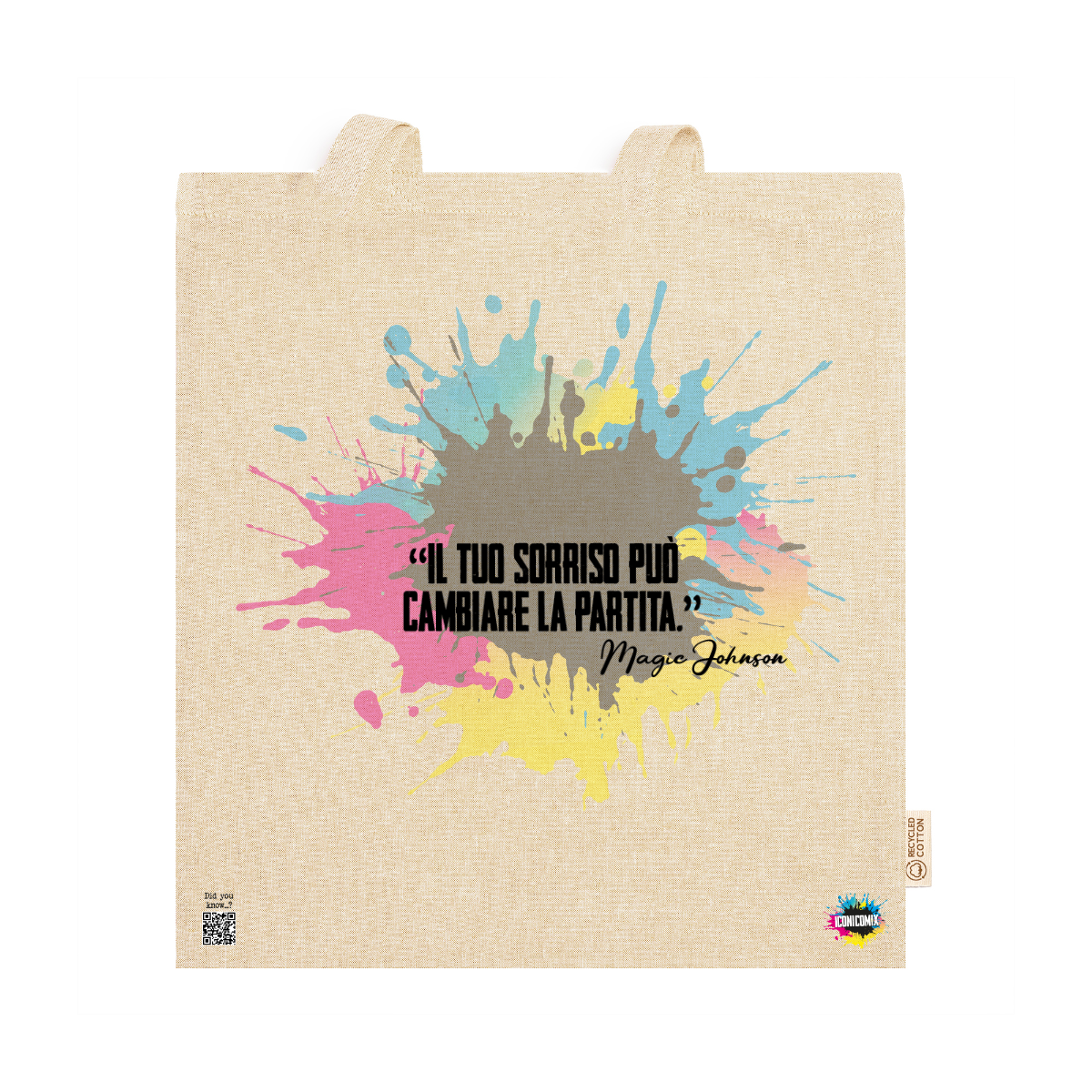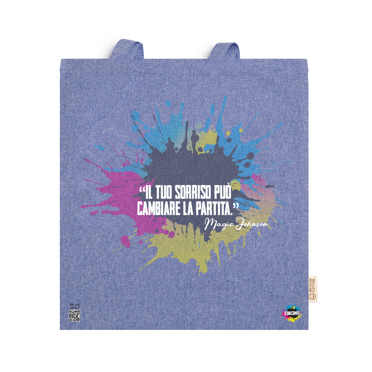 In ogni nostra grafica è presente anche un QR code che reindirizza al sito iconicomix.com, alla pagina ufficiale dell’icona che hai scelto. Una porta digitale che racconta la sua storia, le sue frasi e il suo mondo.