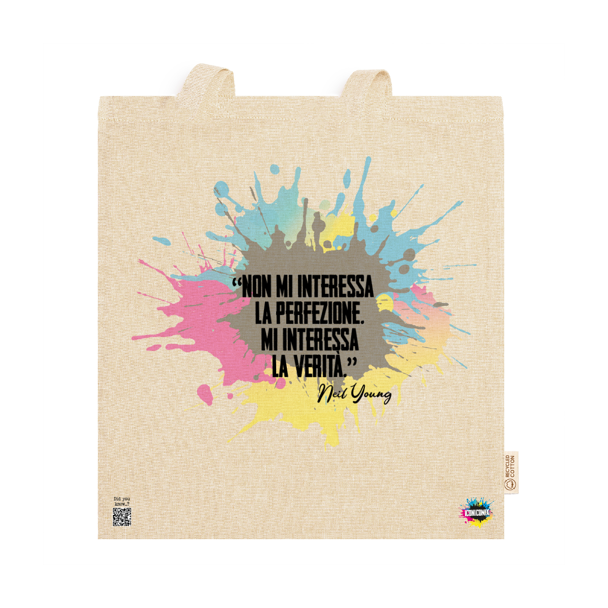 In ogni nostra grafica è presente anche un QR code che reindirizza al sito iconicomix.com, alla pagina ufficiale dell’icona che hai scelto. Una porta digitale che racconta la sua storia, le sue frasi e il suo mondo.