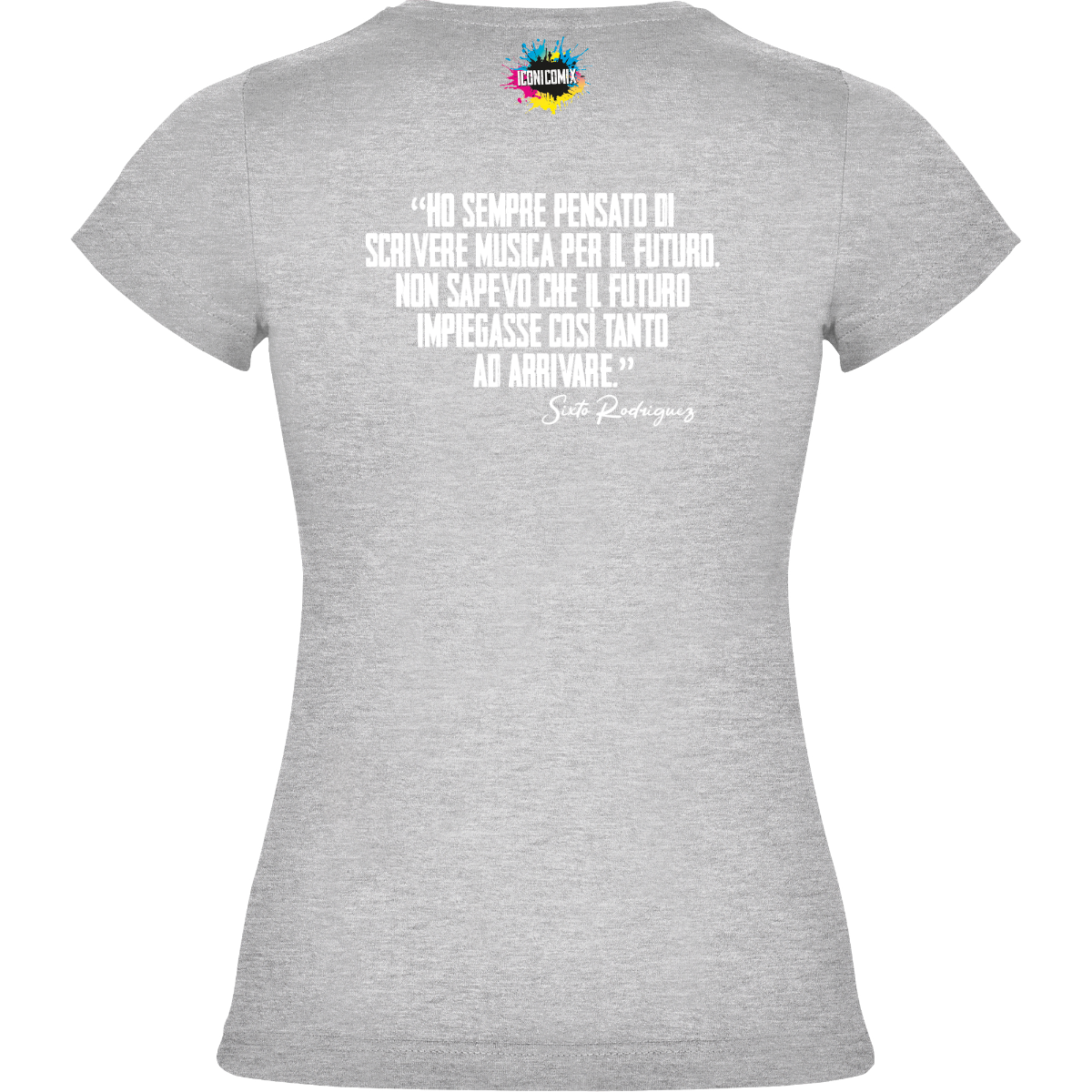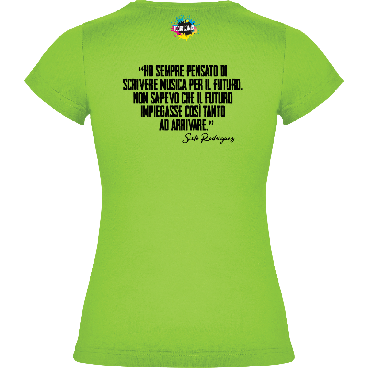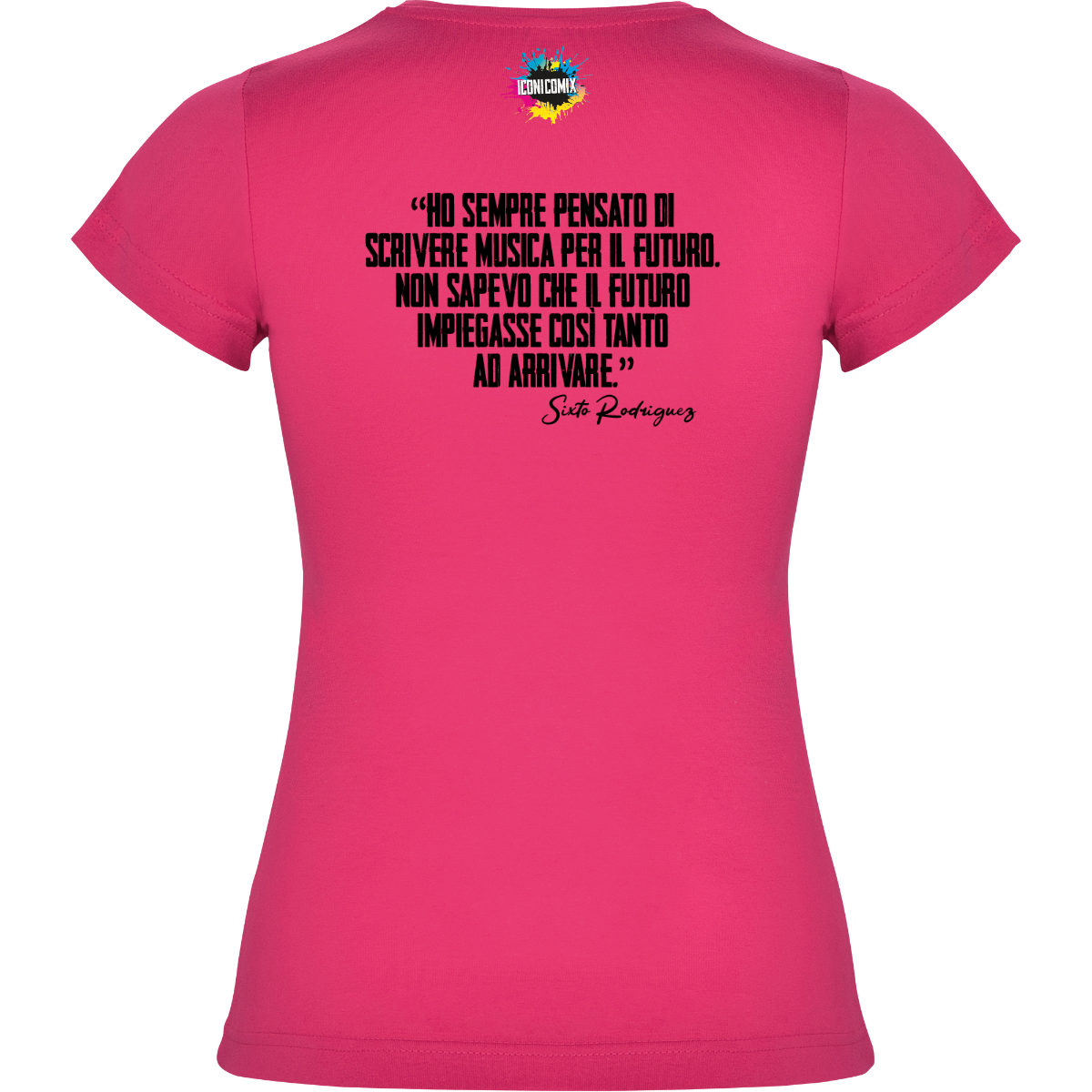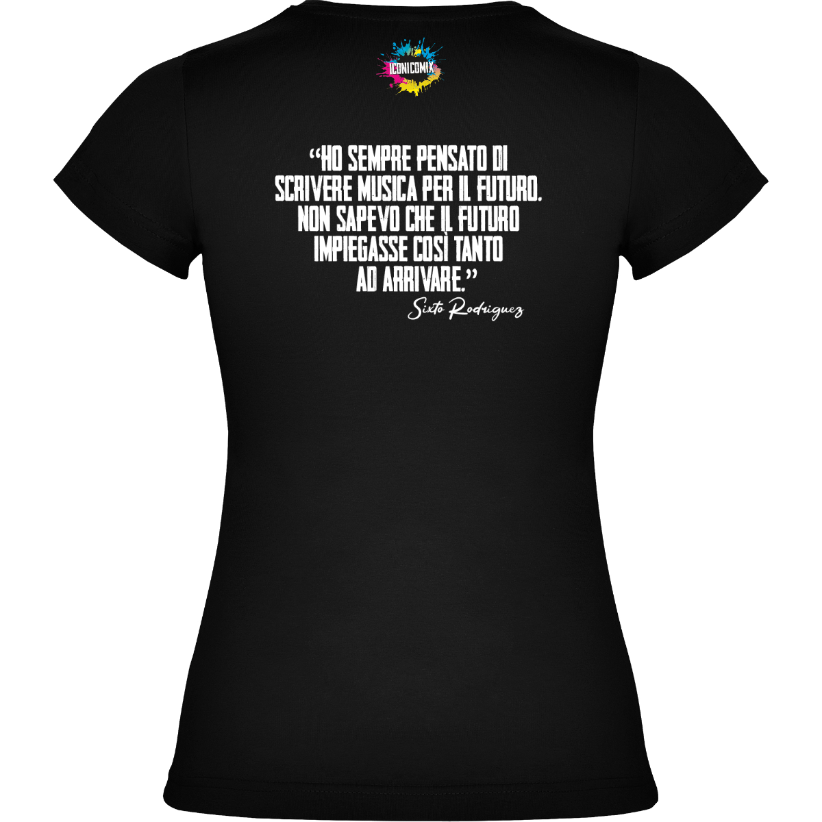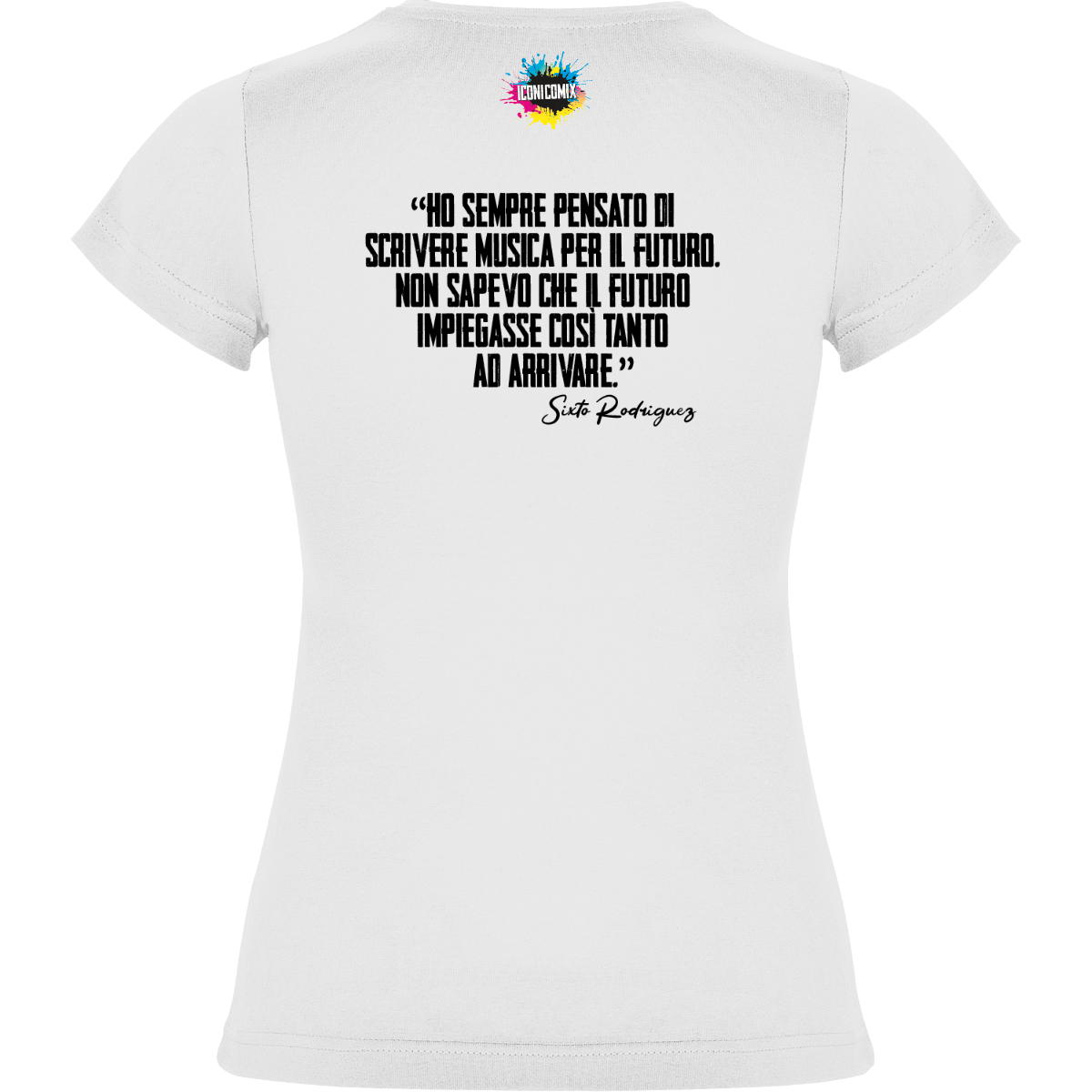 In ogni nostra grafica è presente anche un QR code che reindirizza al sito iconicomix.com, alla pagina ufficiale dell’icona che hai scelto. Una porta digitale che racconta la sua storia, le sue frasi e il suo mondo.