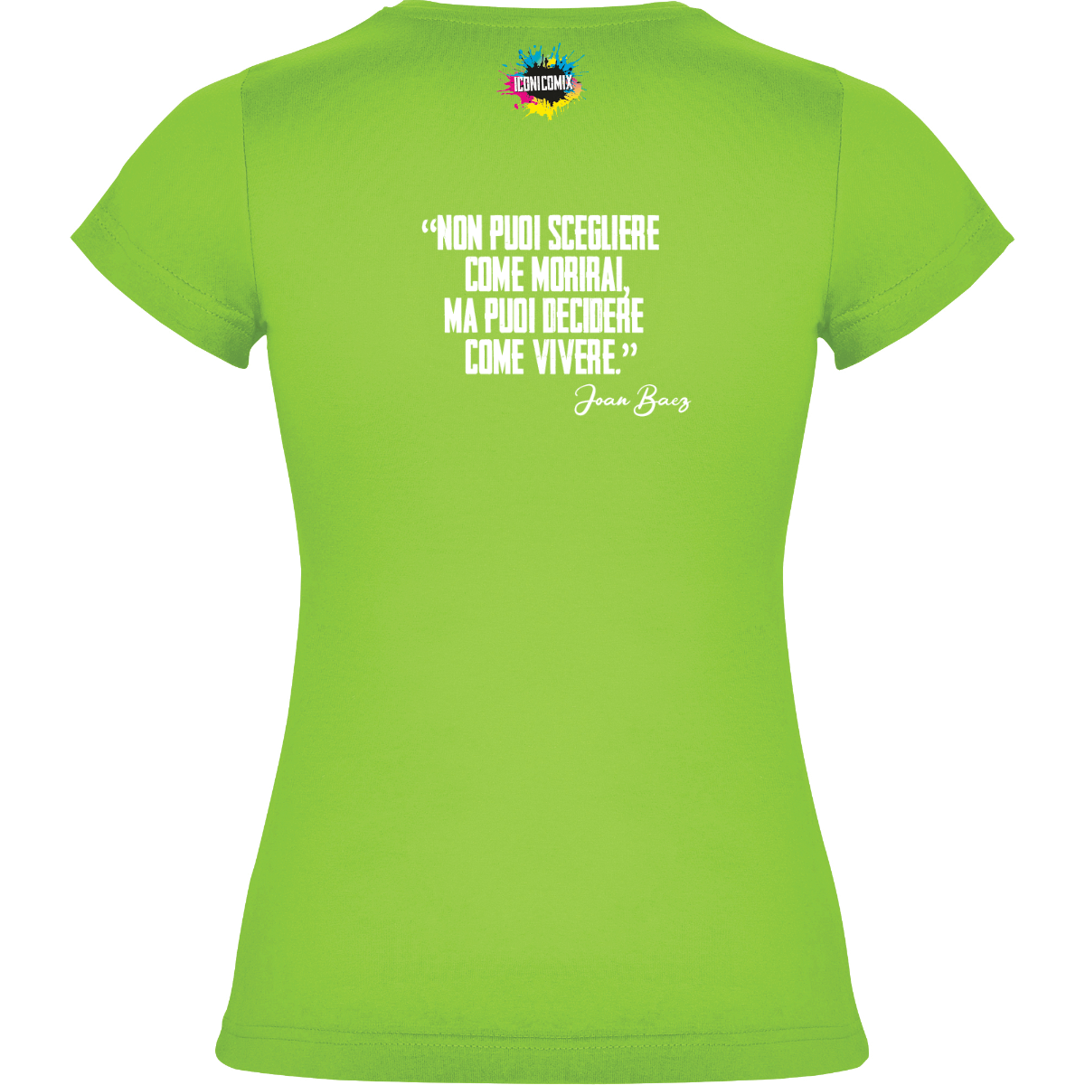 In ogni nostra grafica è presente anche un QR code che reindirizza al sito iconicomix.com, alla pagina ufficiale dell’icona che hai scelto. Una porta digitale che racconta la sua storia, le sue frasi e il suo mondo.