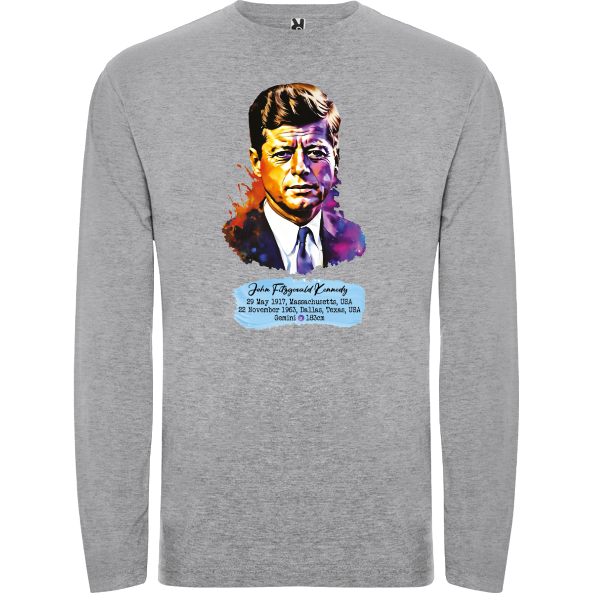 Camiseta de manga larga, tejido tubular, cuello redondo de 4 capas. Costuras reforzadas en cuello y hombros. Sin puños. 100 % algodón, punto liso, 160 g/m². Gris: 85 % algodón / 15 % viscosa.