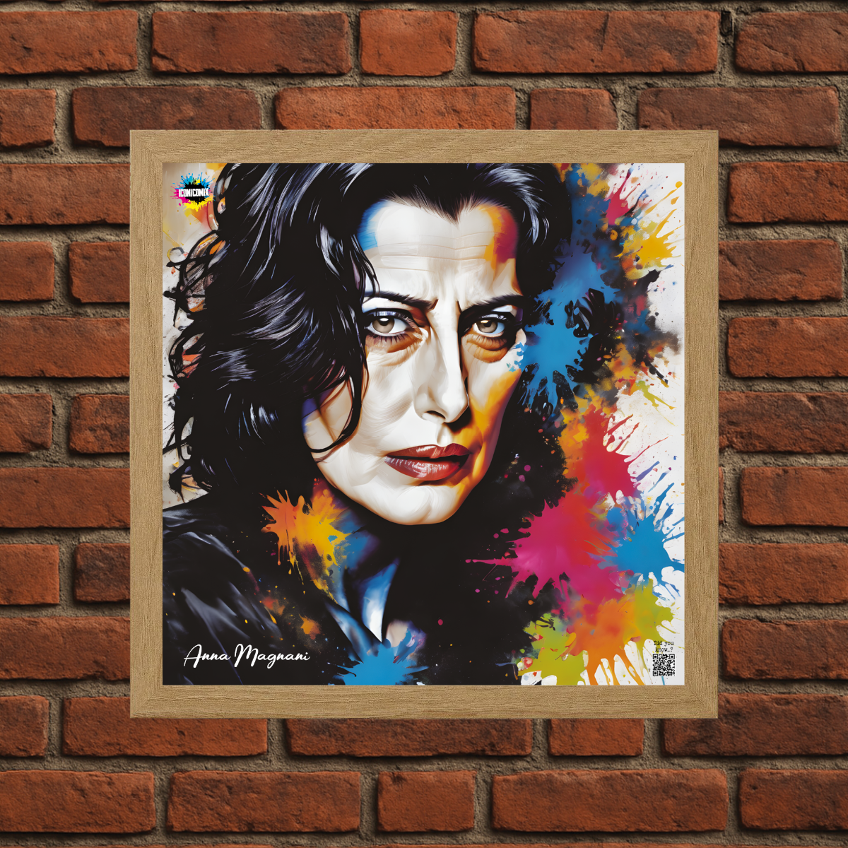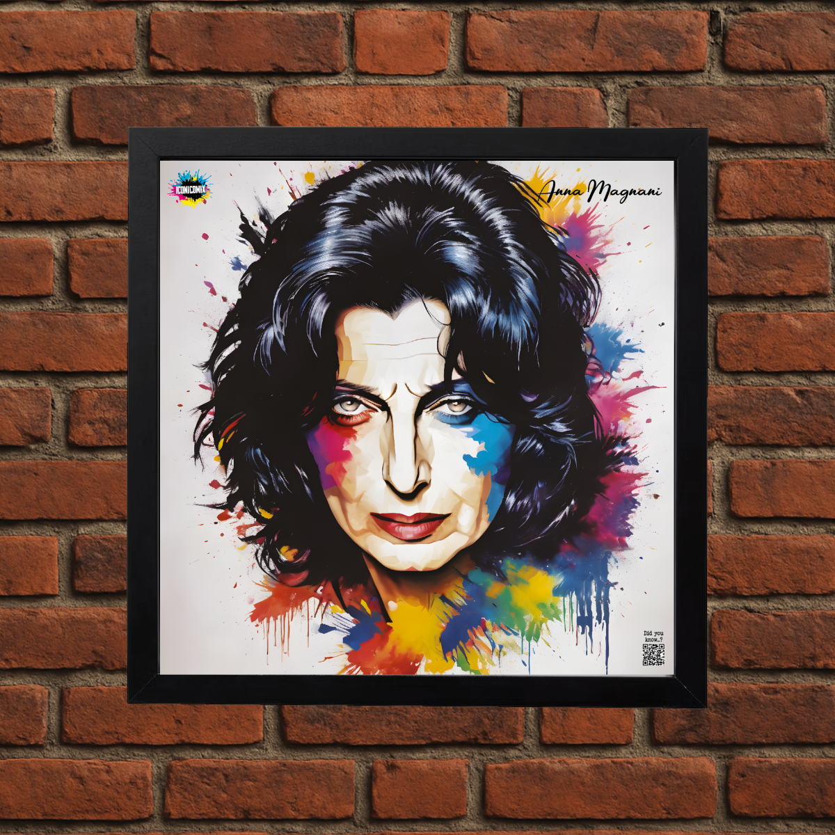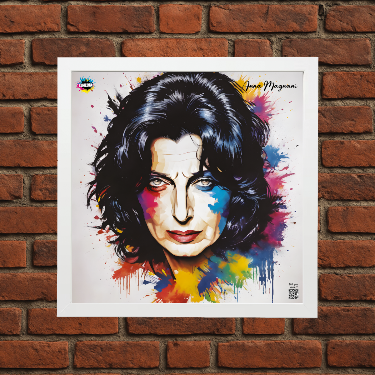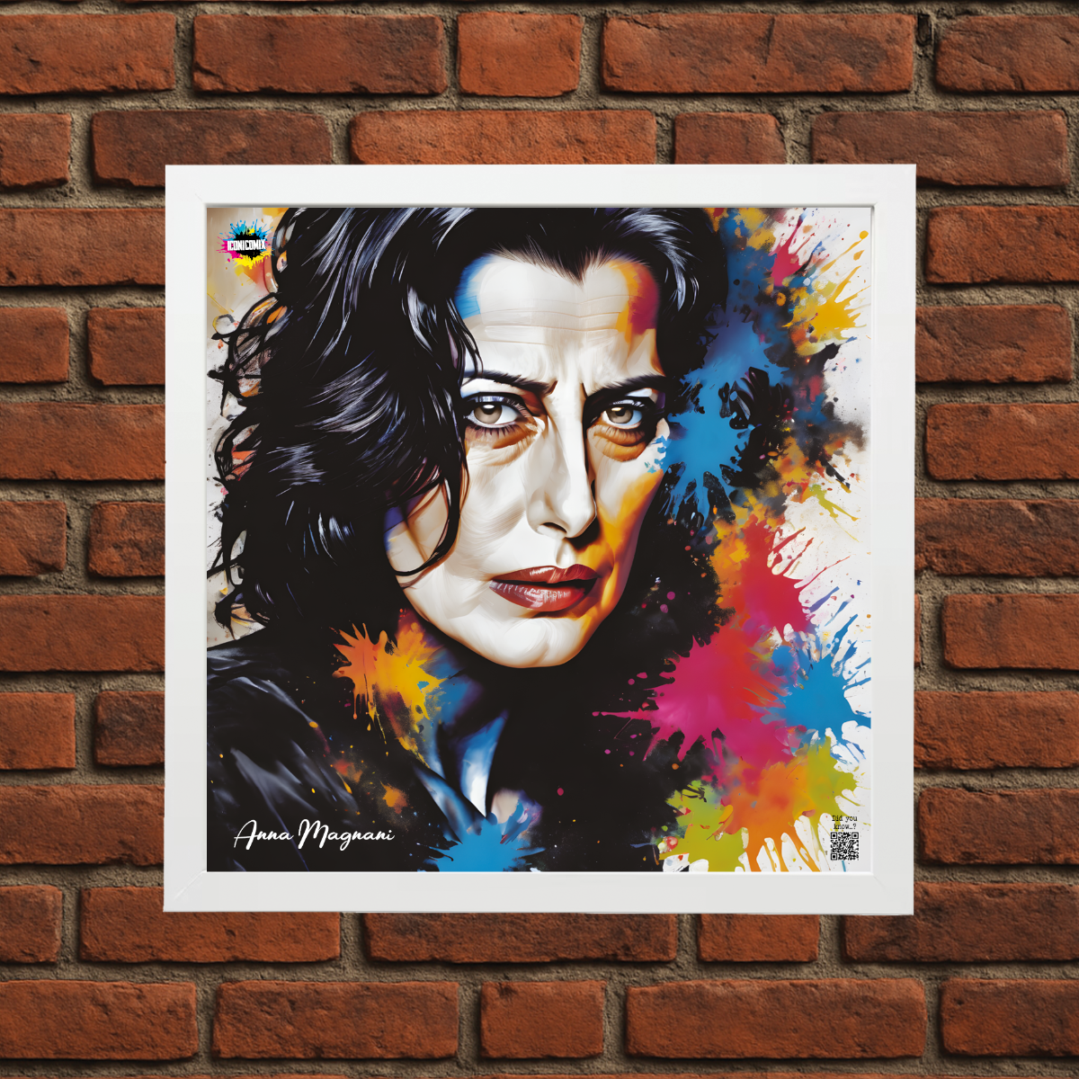In ogni nostra grafica è presente anche un QR code che reindirizza al sito iconicomix.com, alla pagina ufficiale dell’icona che hai scelto. Una porta digitale che racconta la sua storia, le sue frasi e il suo mondo.