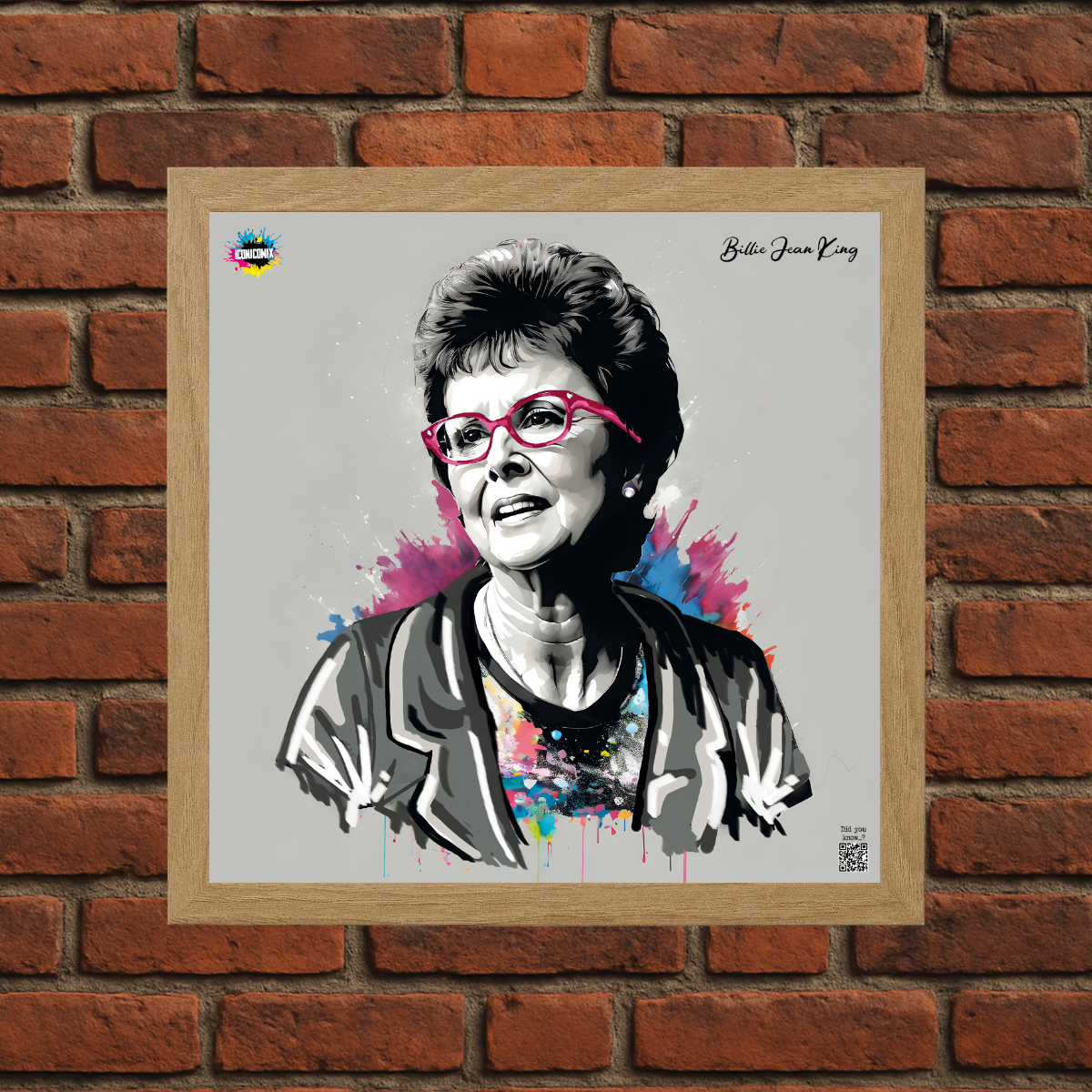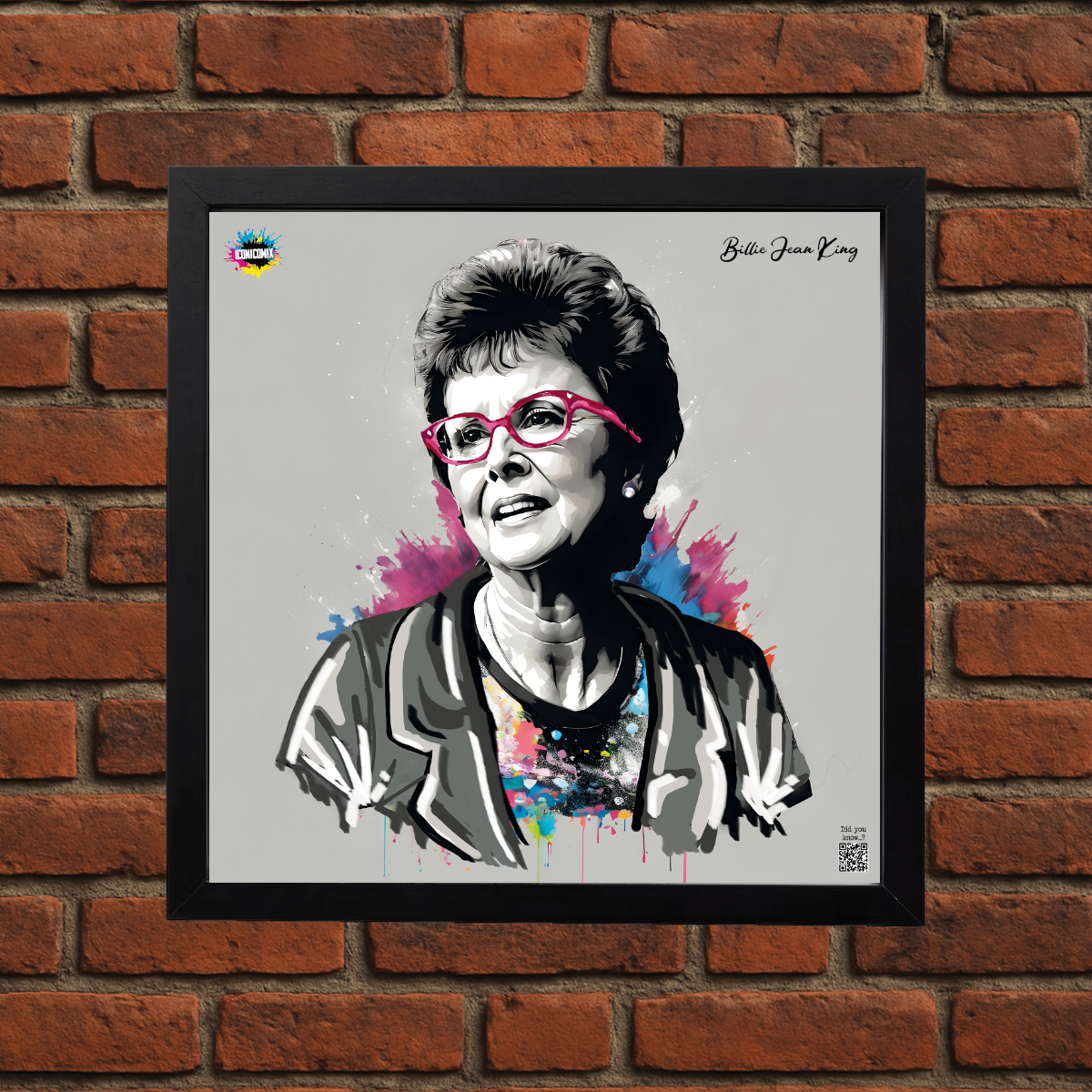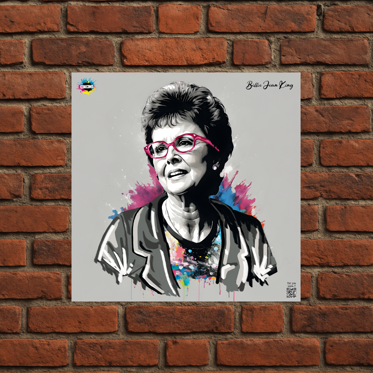 In ogni nostra grafica è presente anche un QR code che reindirizza al sito iconicomix.com, alla pagina ufficiale dell’icona che hai scelto. Una porta digitale che racconta la sua storia, le sue frasi e il suo mondo.