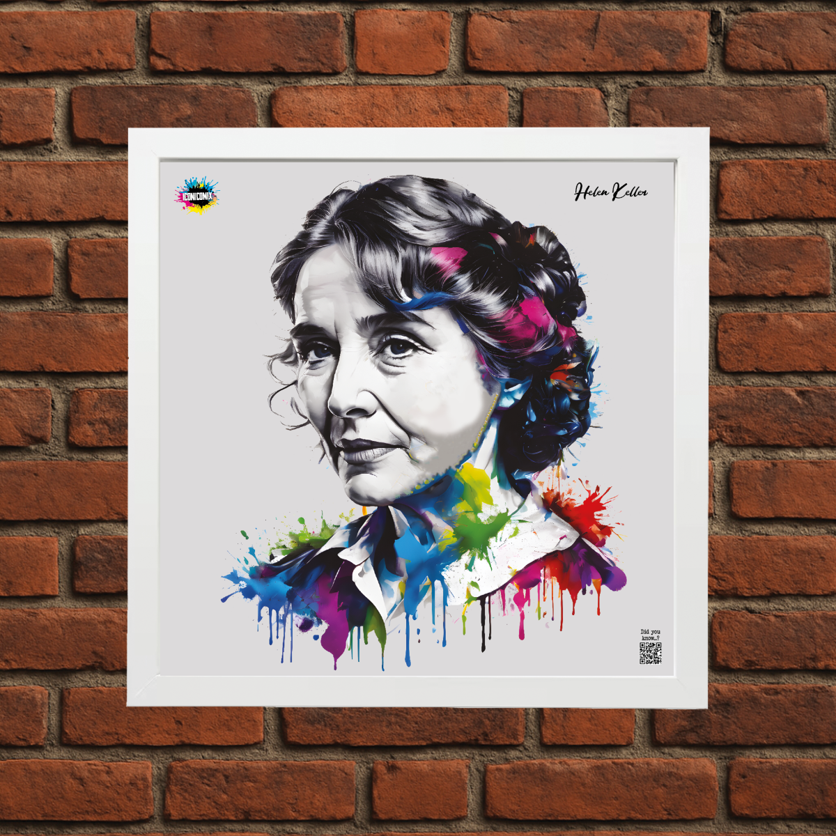 In ogni nostra grafica è presente anche un QR code che reindirizza al sito iconicomix.com, alla pagina ufficiale dell’icona che hai scelto. Una porta digitale che racconta la sua storia, le sue frasi e il suo mondo.