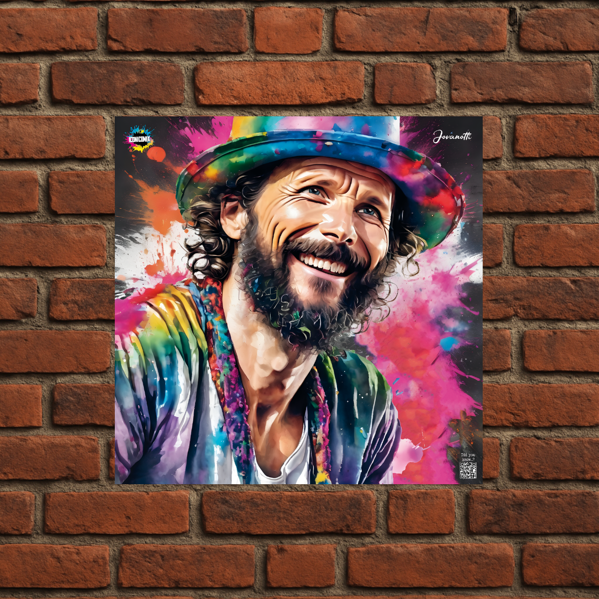 In ogni nostra grafica è presente anche un QR code che reindirizza al sito iconicomix.com, alla pagina ufficiale dell’icona che hai scelto. Una porta digitale che racconta la sua storia, le sue frasi e il suo mondo.