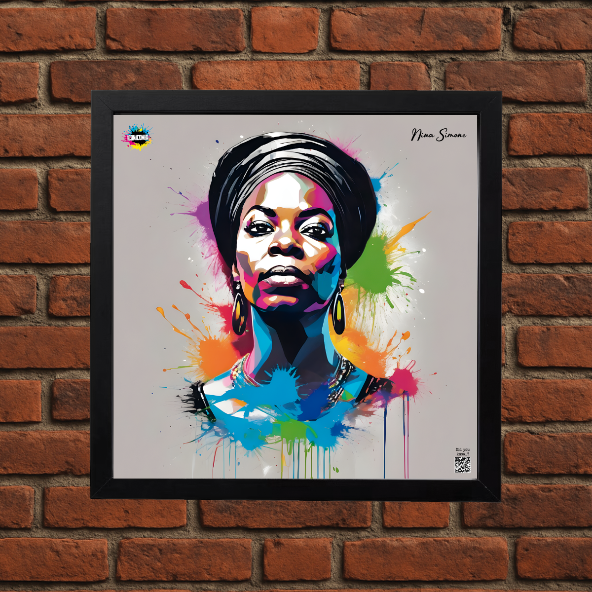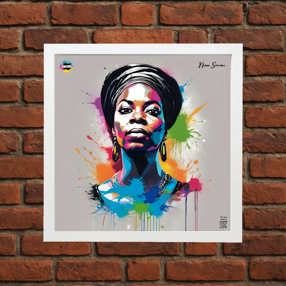 In ogni nostra grafica è presente anche un QR code che reindirizza al sito iconicomix.com, alla pagina ufficiale dell’icona che hai scelto. Una porta digitale che racconta la sua storia, le sue frasi e il suo mondo.