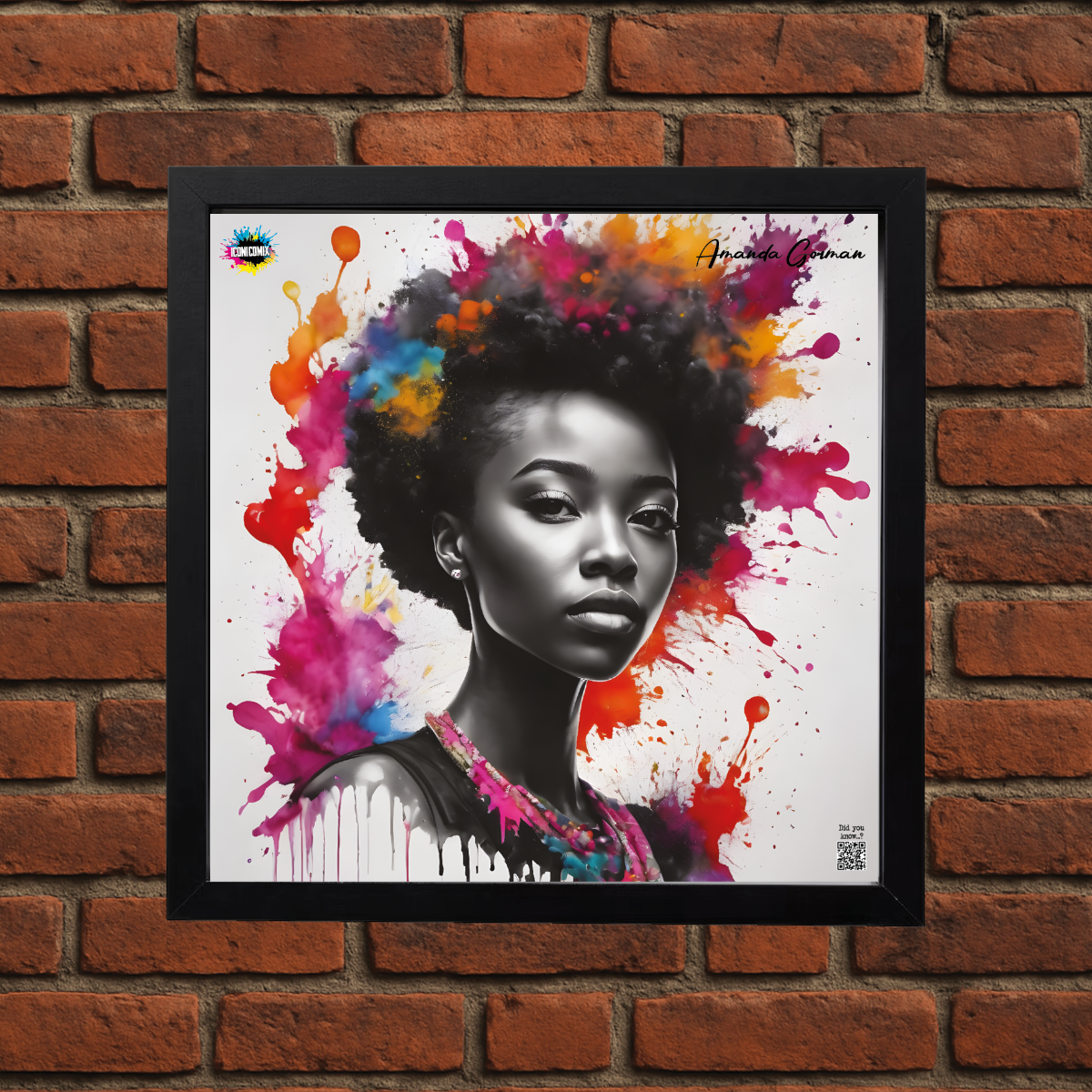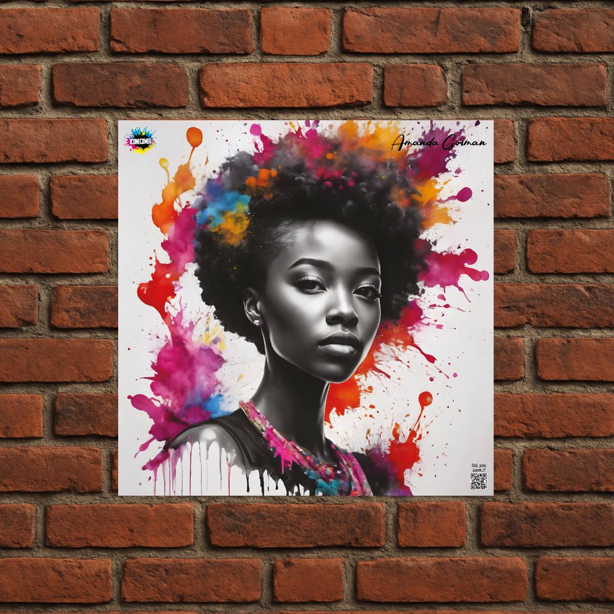 In ogni nostra grafica è presente anche un QR code che reindirizza al sito iconicomix.com, alla pagina ufficiale dell’icona che hai scelto. Una porta digitale che racconta la sua storia, le sue frasi e il suo mondo.