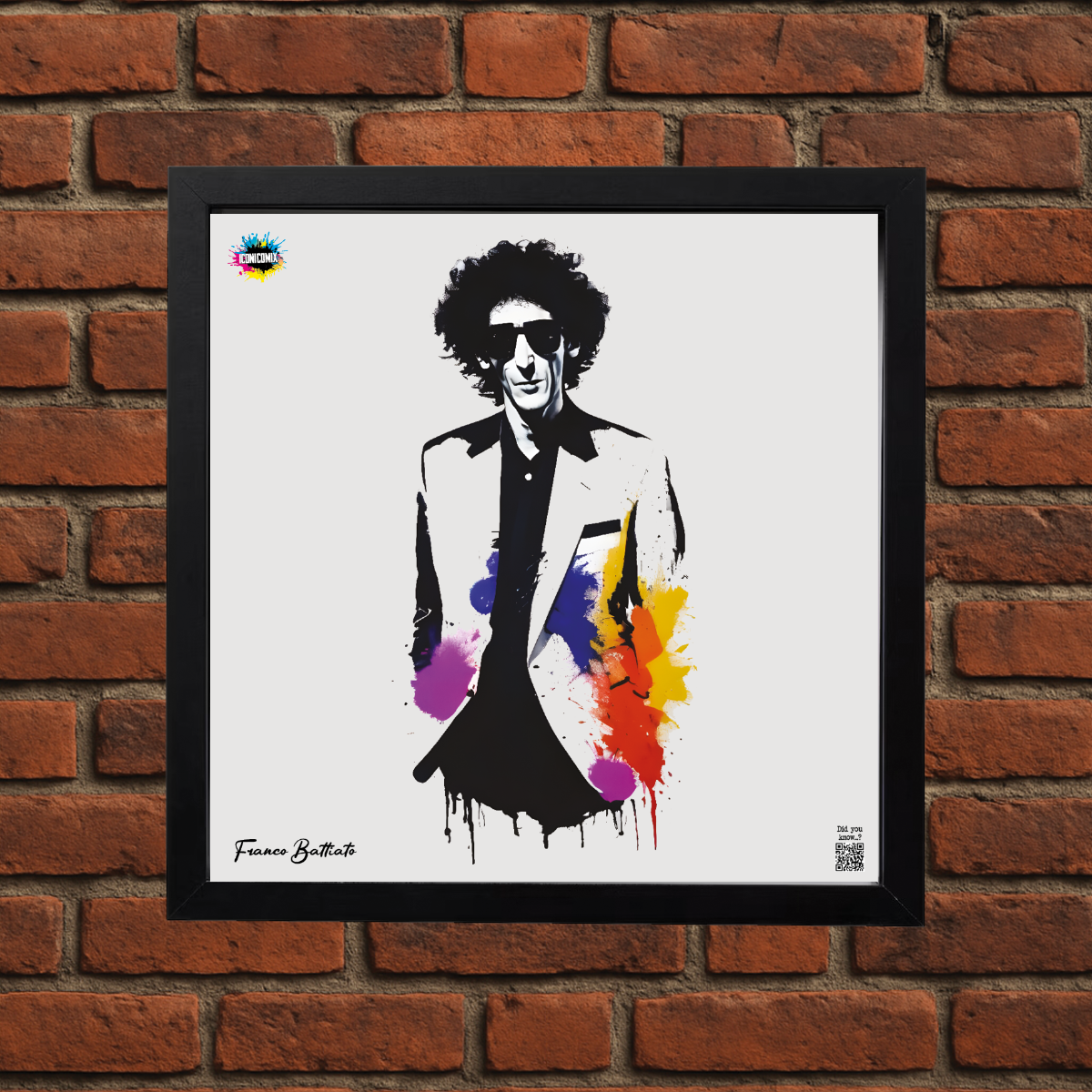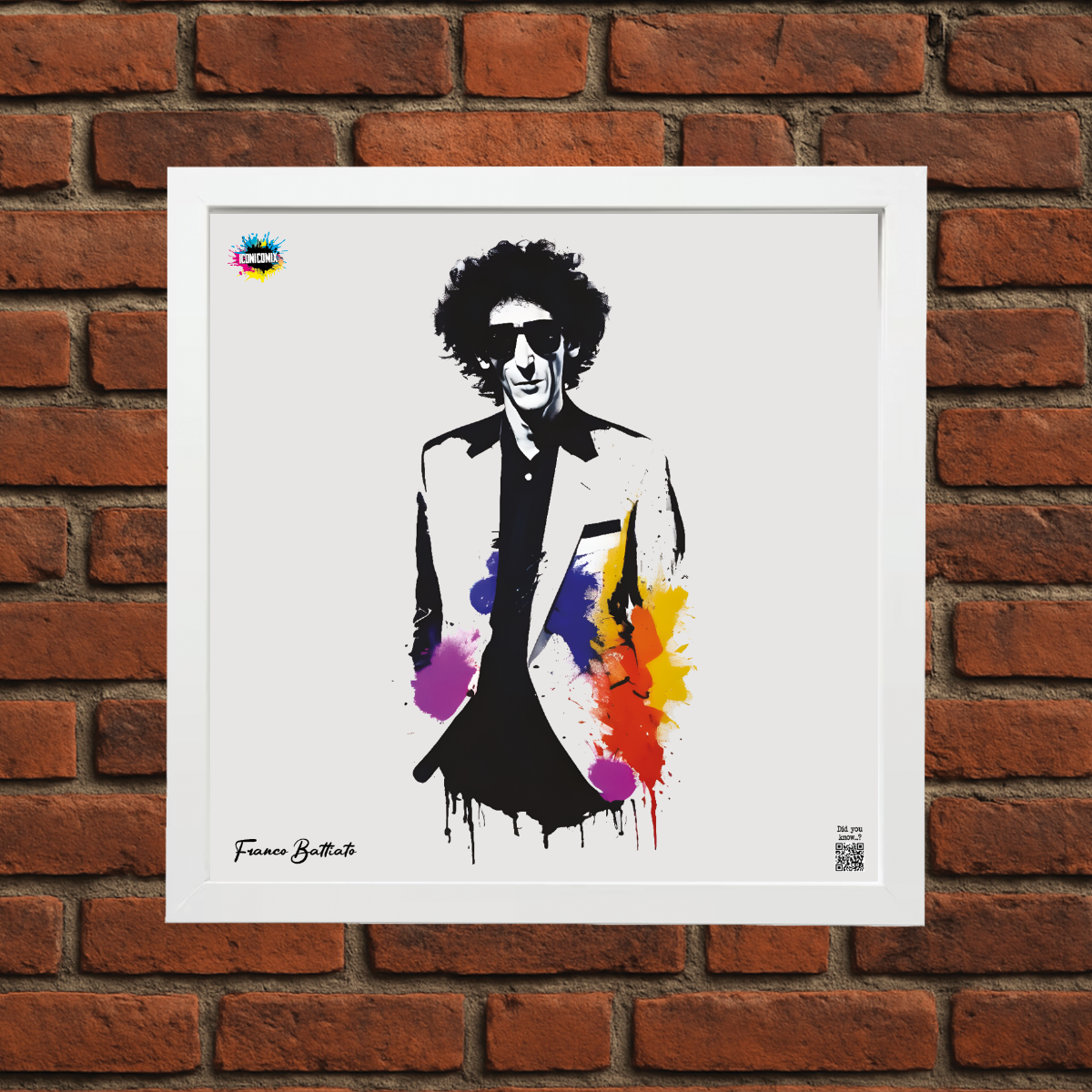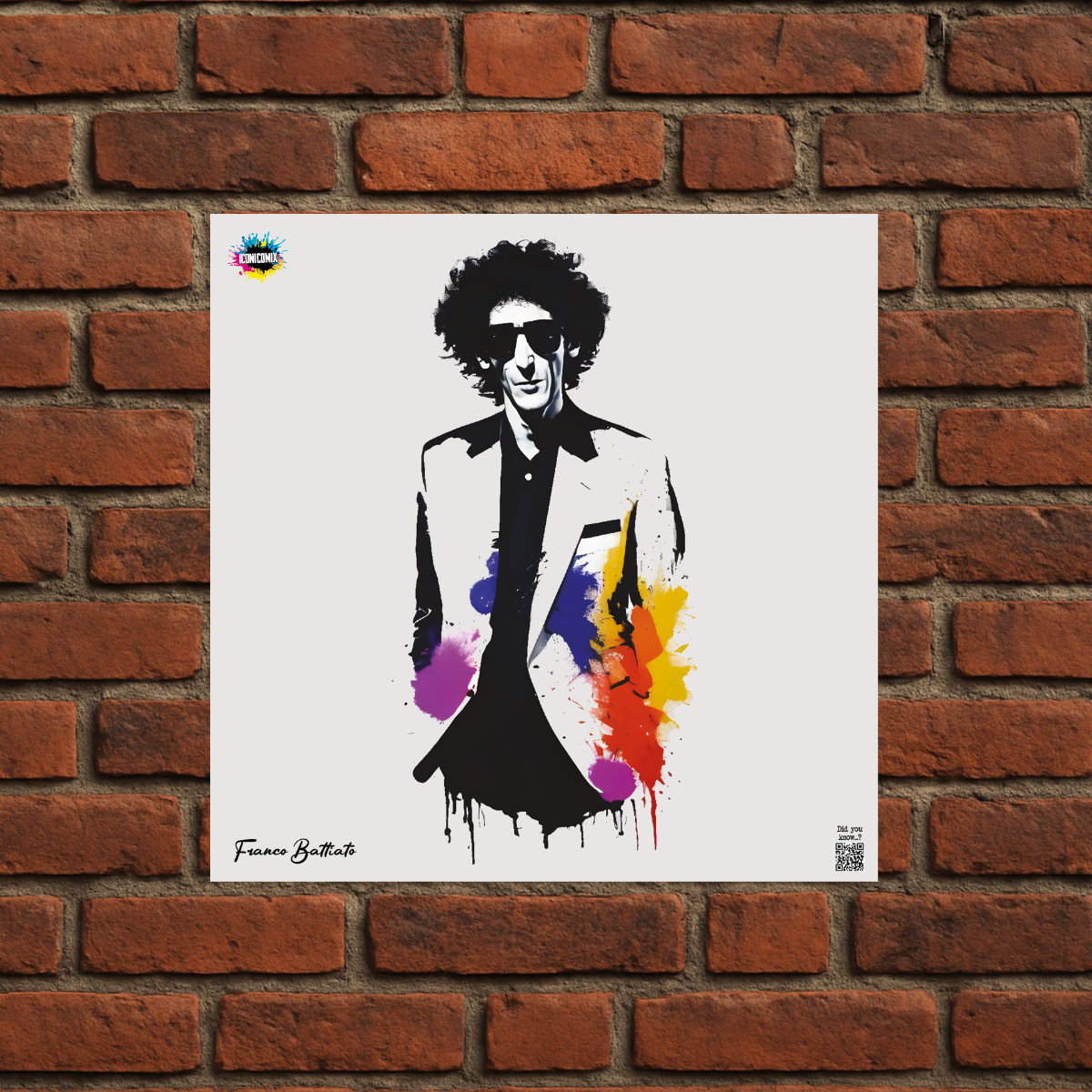 In ogni nostra grafica è presente anche un QR code che reindirizza al sito iconicomix.com, alla pagina ufficiale dell’icona che hai scelto. Una porta digitale che racconta la sua storia, le sue frasi e il suo mondo.