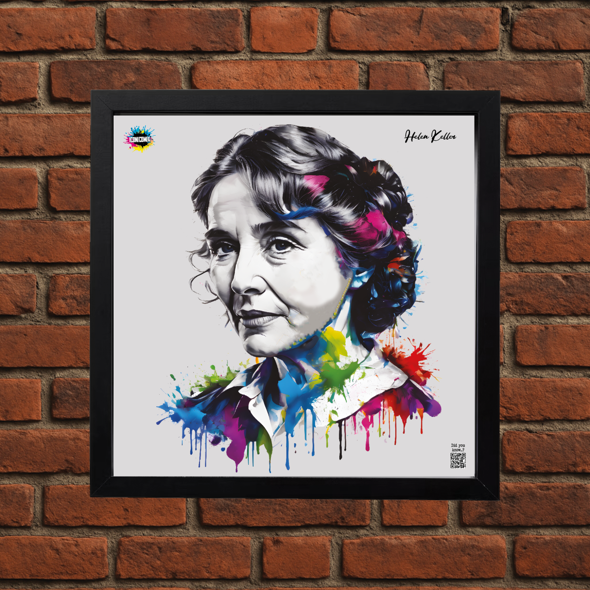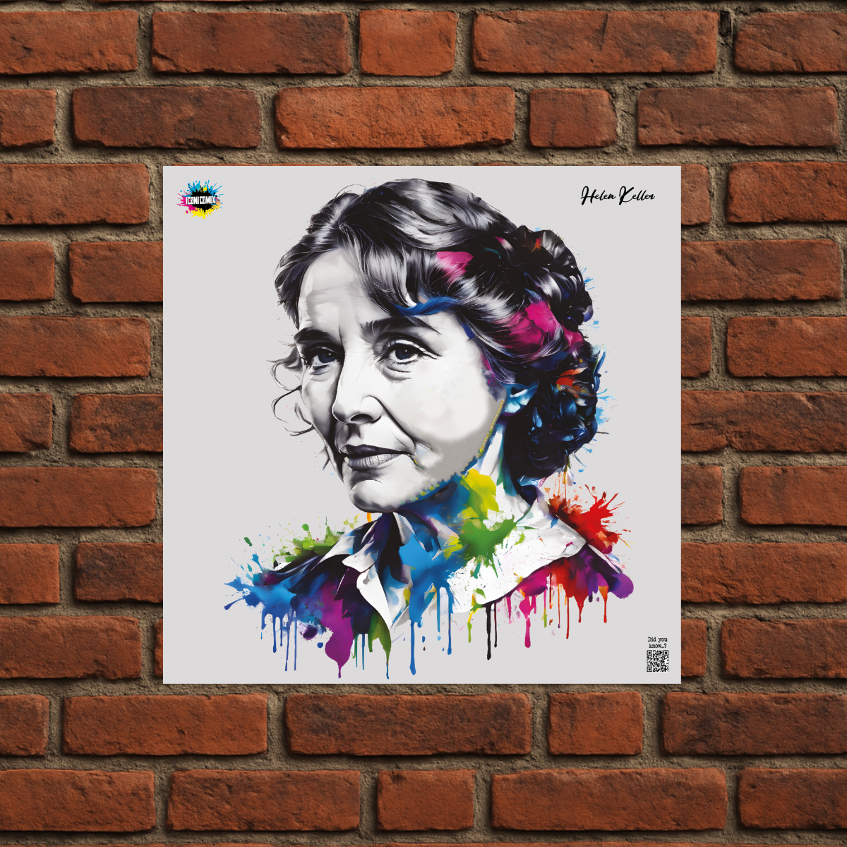 In ogni nostra grafica è presente anche un QR code che reindirizza al sito iconicomix.com, alla pagina ufficiale dell’icona che hai scelto. Una porta digitale che racconta la sua storia, le sue frasi e il suo mondo.