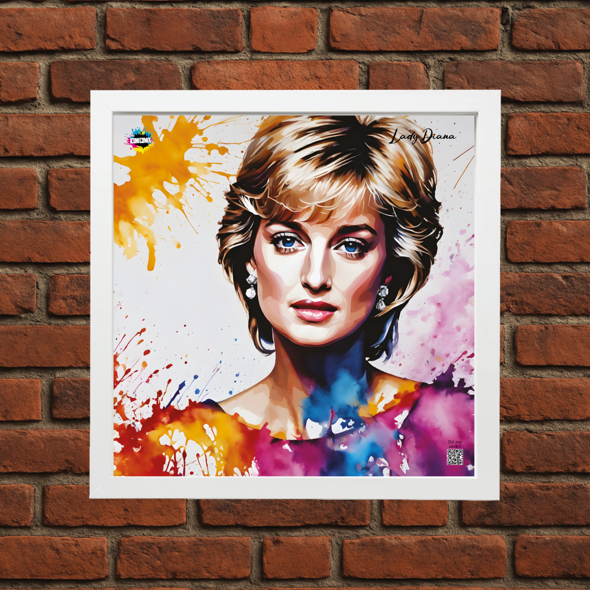 In ogni nostra grafica è presente anche un QR code che reindirizza al sito iconicomix.com, alla pagina ufficiale dell’icona che hai scelto. Una porta digitale che racconta la sua storia, le sue frasi e il suo mondo.