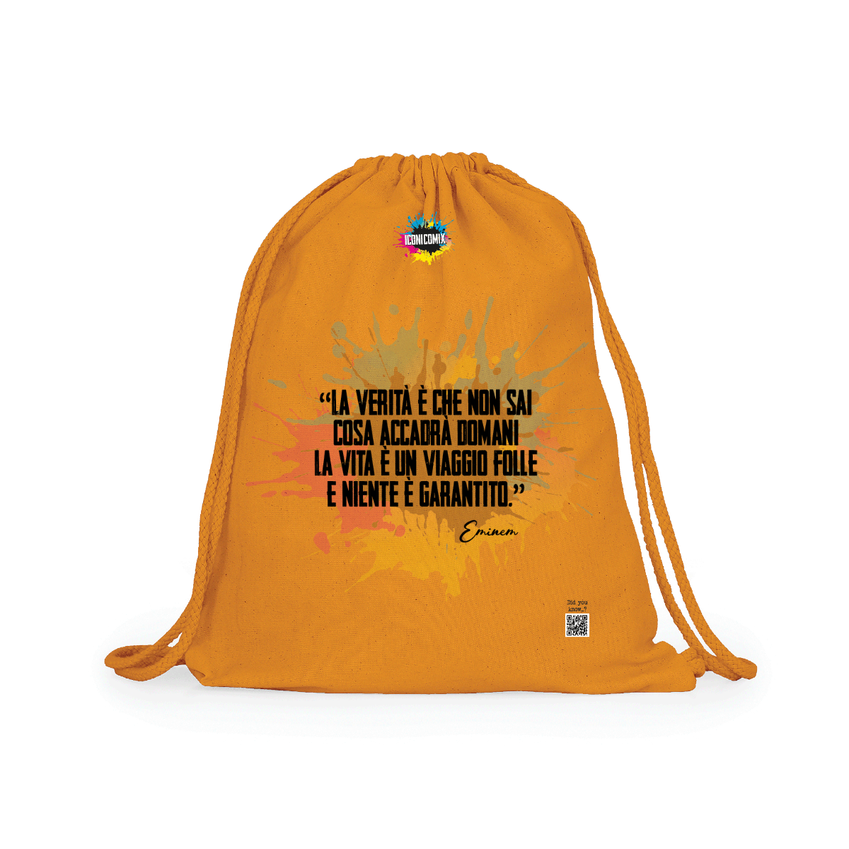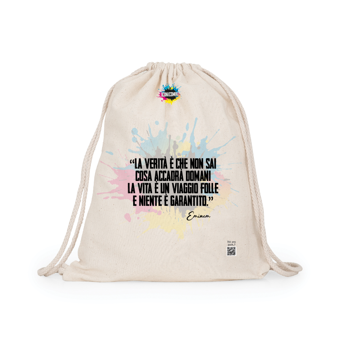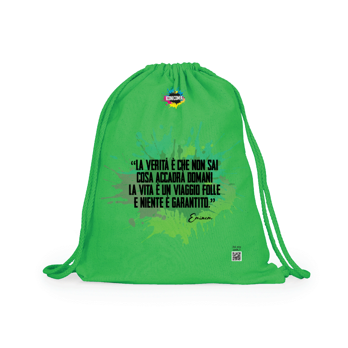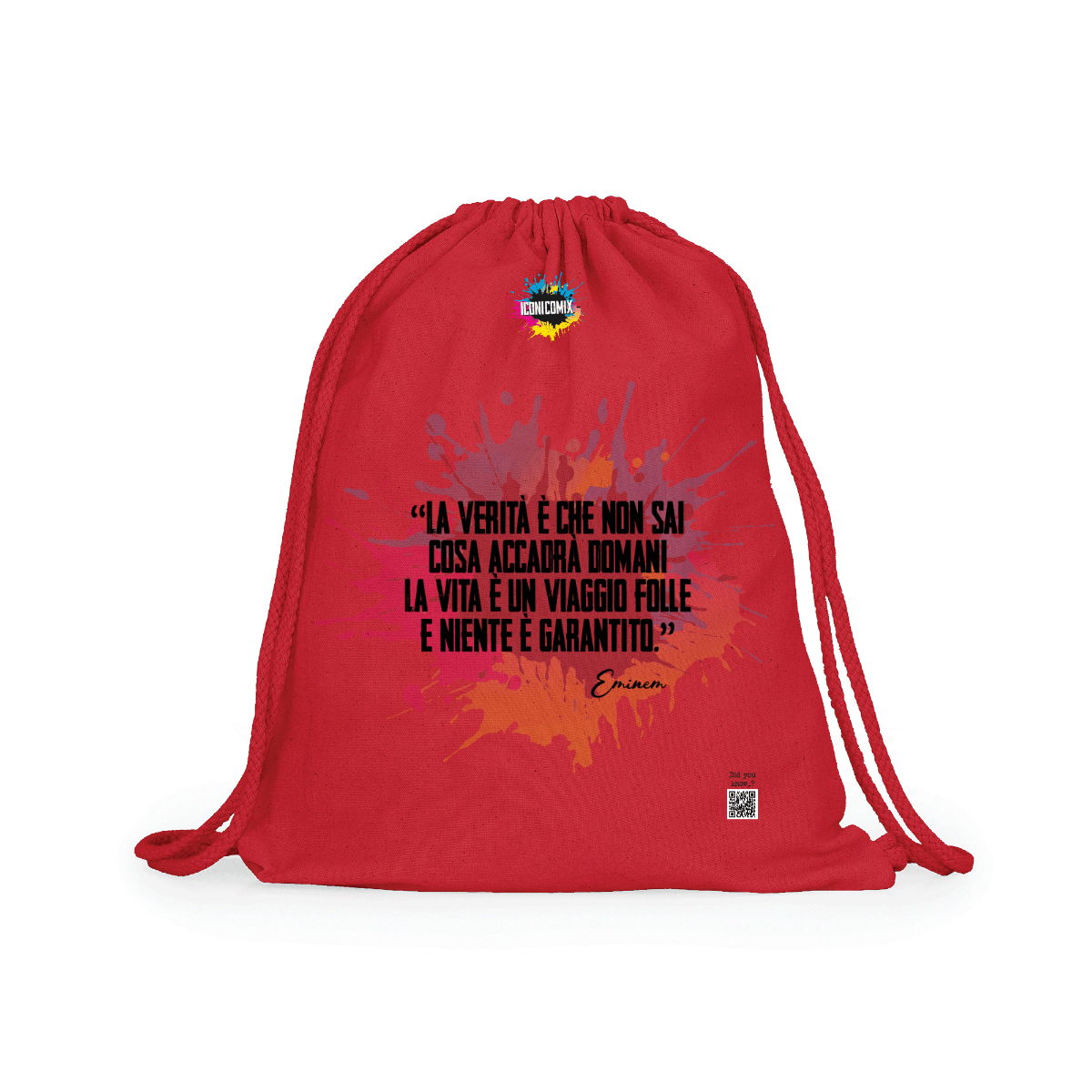 In ogni nostra grafica è presente anche un QR code che reindirizza al sito iconicomix.com, alla pagina ufficiale dell’icona che hai scelto. Una porta digitale che racconta la sua storia, le sue frasi e il suo mondo.