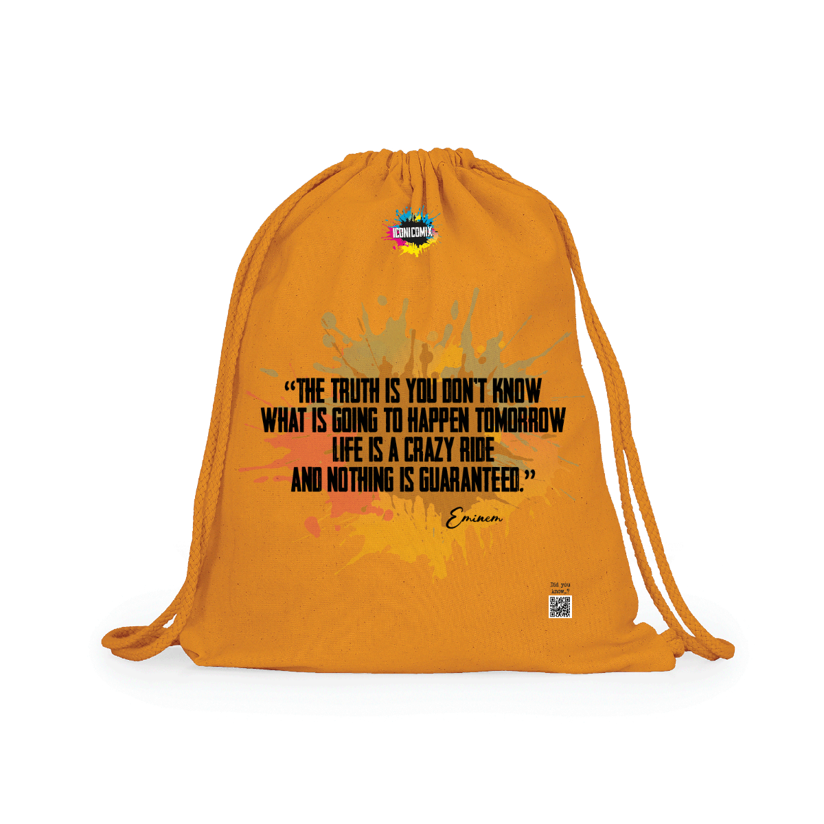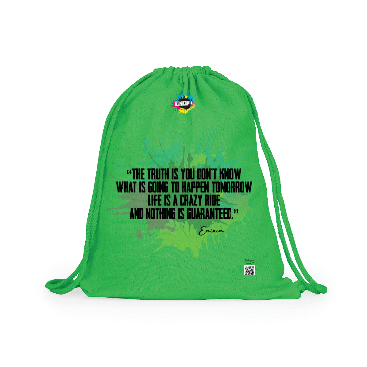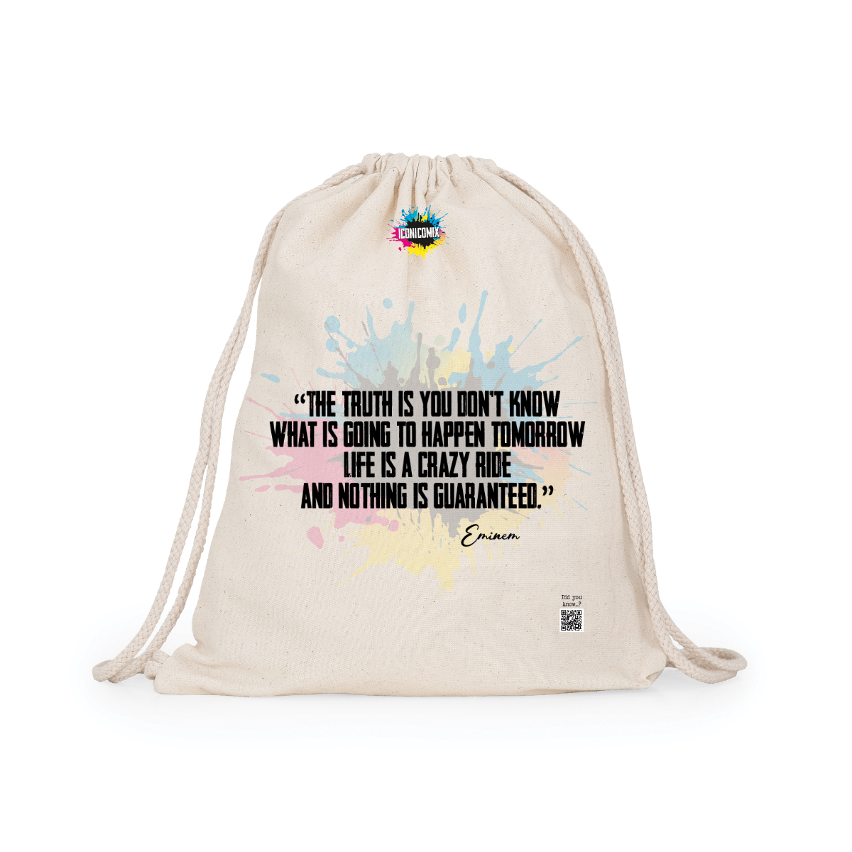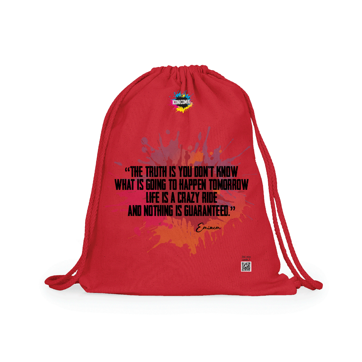 In ogni nostra grafica è presente anche un QR code che reindirizza al sito iconicomix.com, alla pagina ufficiale dell’icona che hai scelto. Una porta digitale che racconta la sua storia, le sue frasi e il suo mondo.