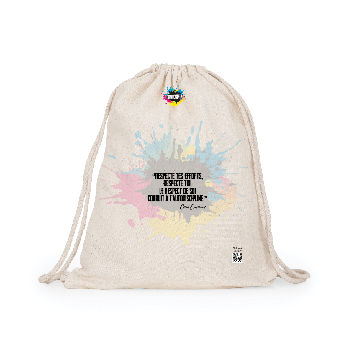 Sac à dos polyvalent en coton. Cordons réglables assortis à l'arrière, d'une épaisseur de 8 mm. 100 % coton, 140 g/m².  Dimensions 37 cm / 41 cm