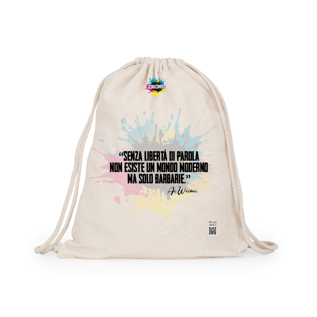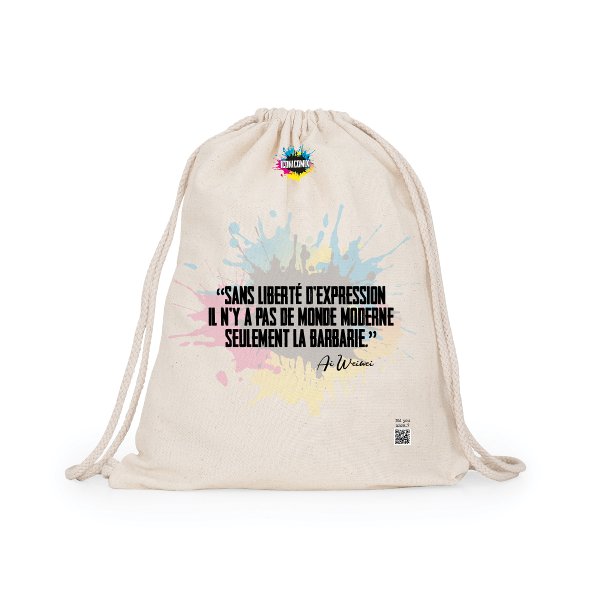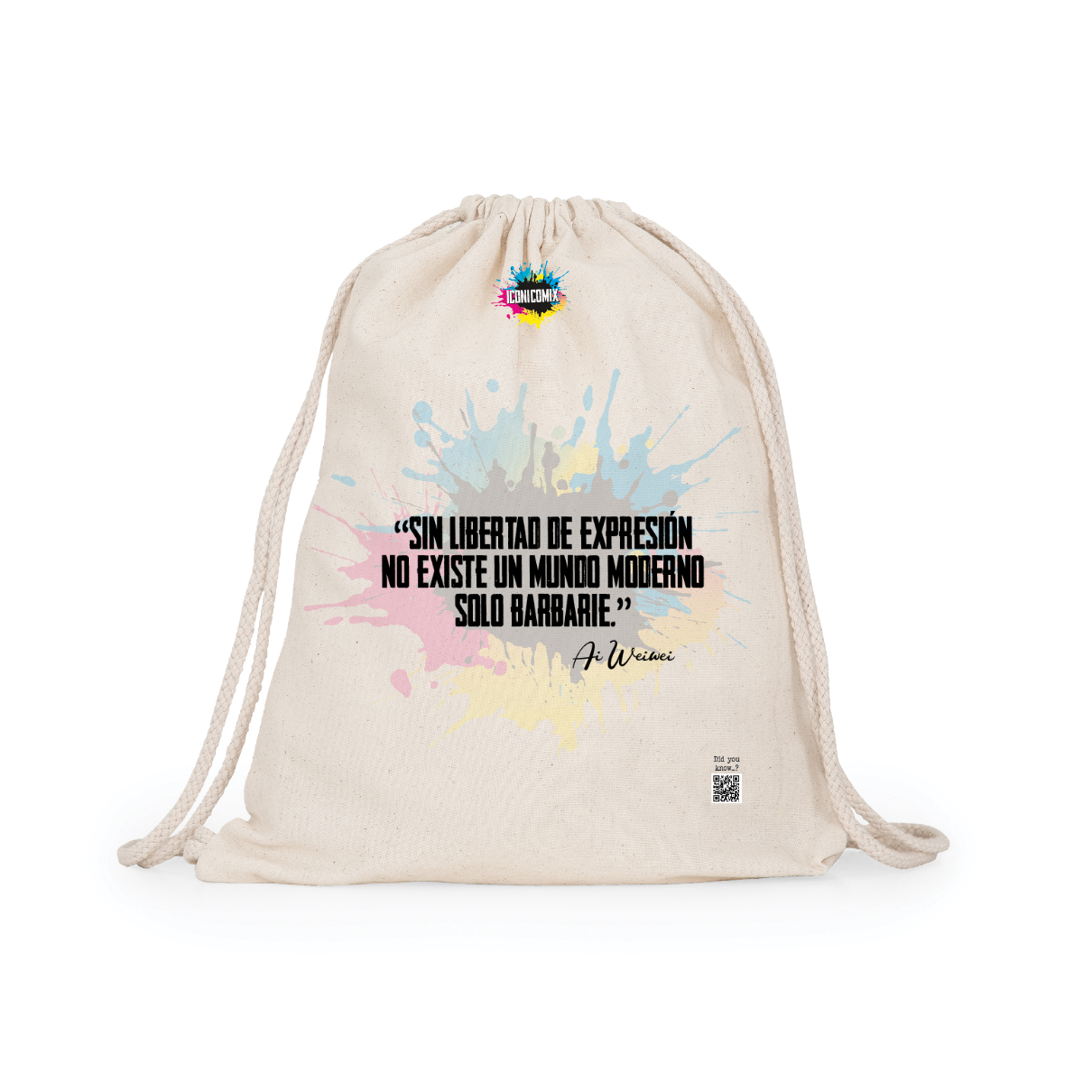 Multipurpose cotton backpack. Adjustable matching drawstrings on the back, 8 mm thick. 100% cotton, 140 g/m².  Measures 37cm / 41cm