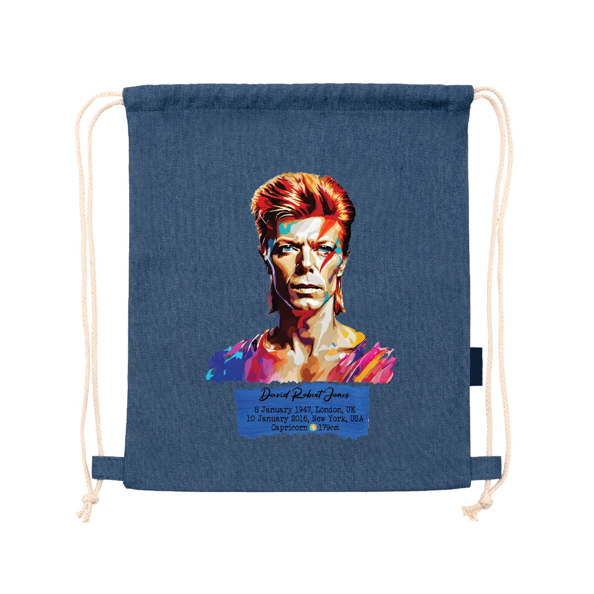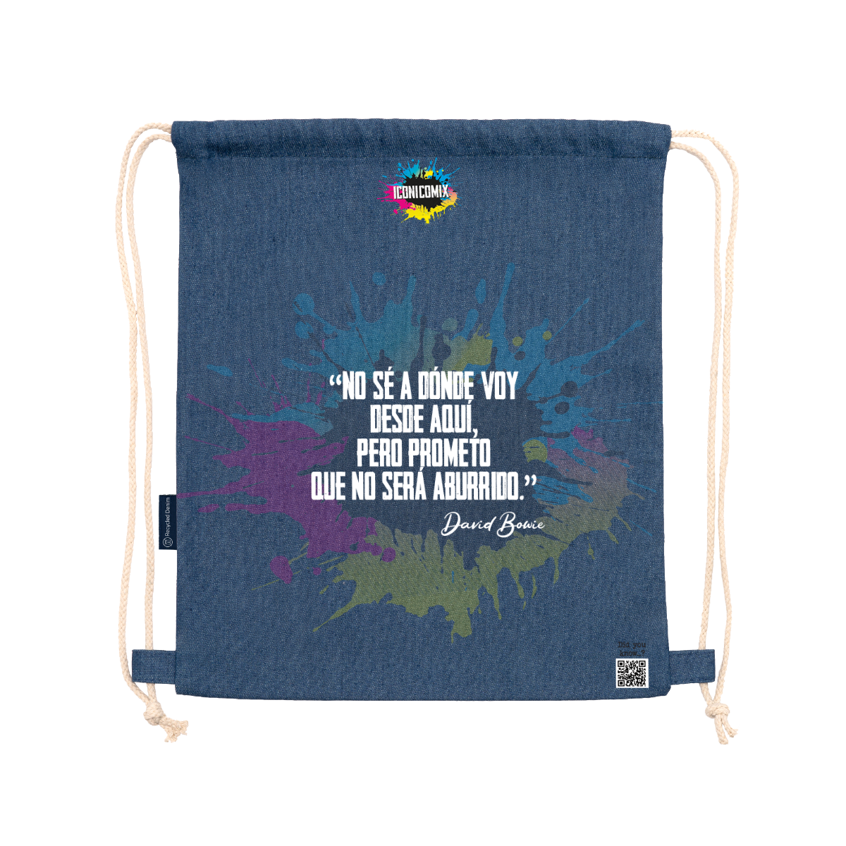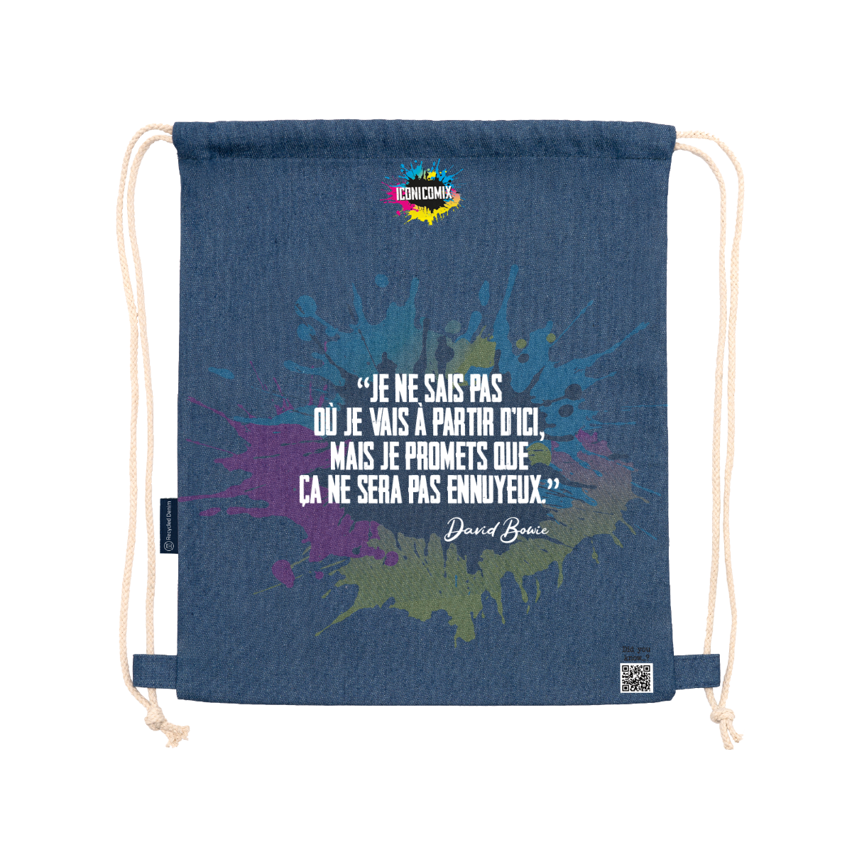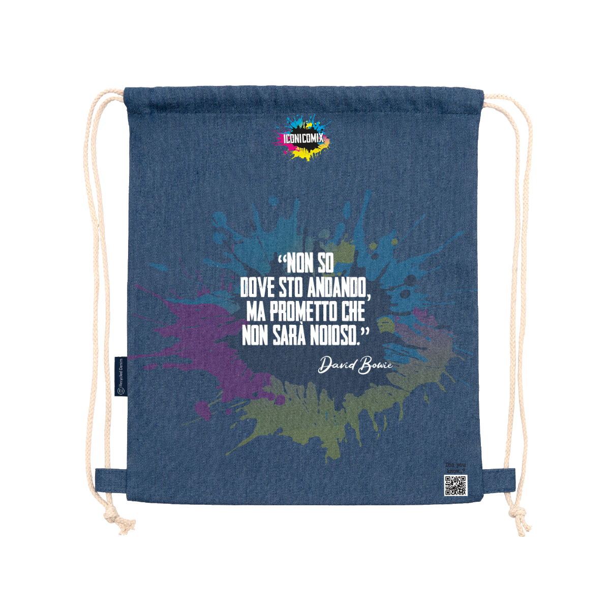 Zaino multiuso realizzato in denim riciclato. Cordoncini regolabili abbinati sul retro, spessore 8 mm. 100% denim, 320 g/m². Dimensioni: 36 cm / 42 cm .