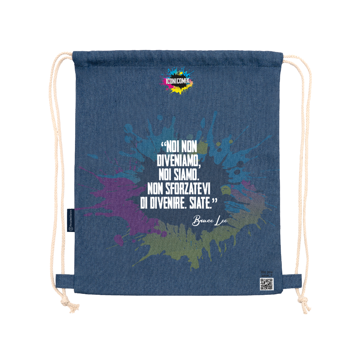 Sac à dos polyvalent en denim recyclé. Cordons de serrage réglables assortis à l'arrière, épaisseur 8 mm. 100 % denim, 320 g/m². Dimensions : 36 cm / 42 cm.