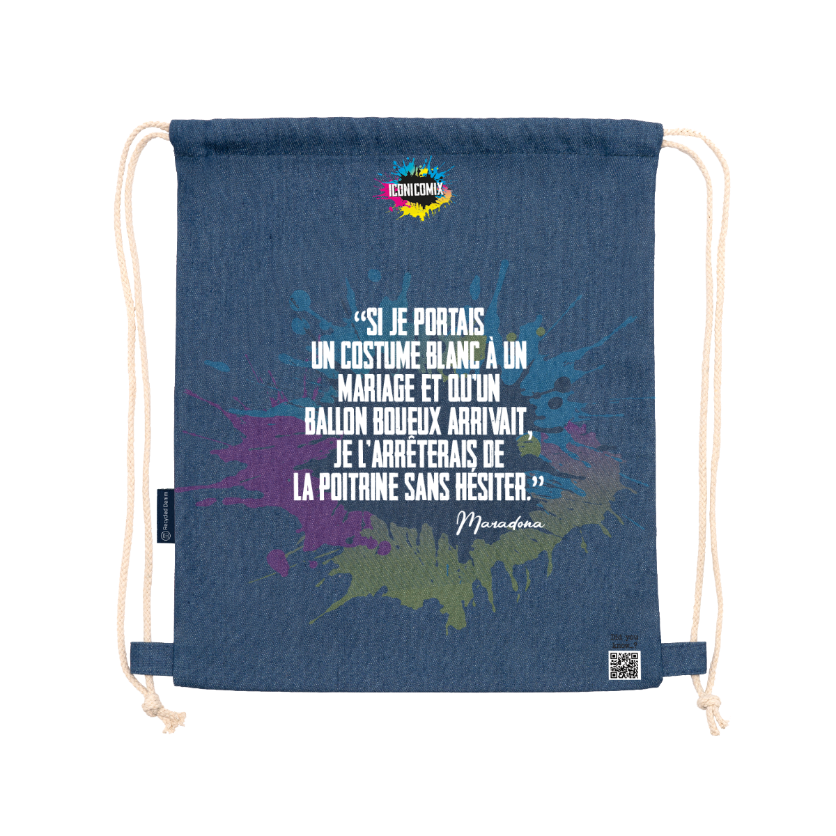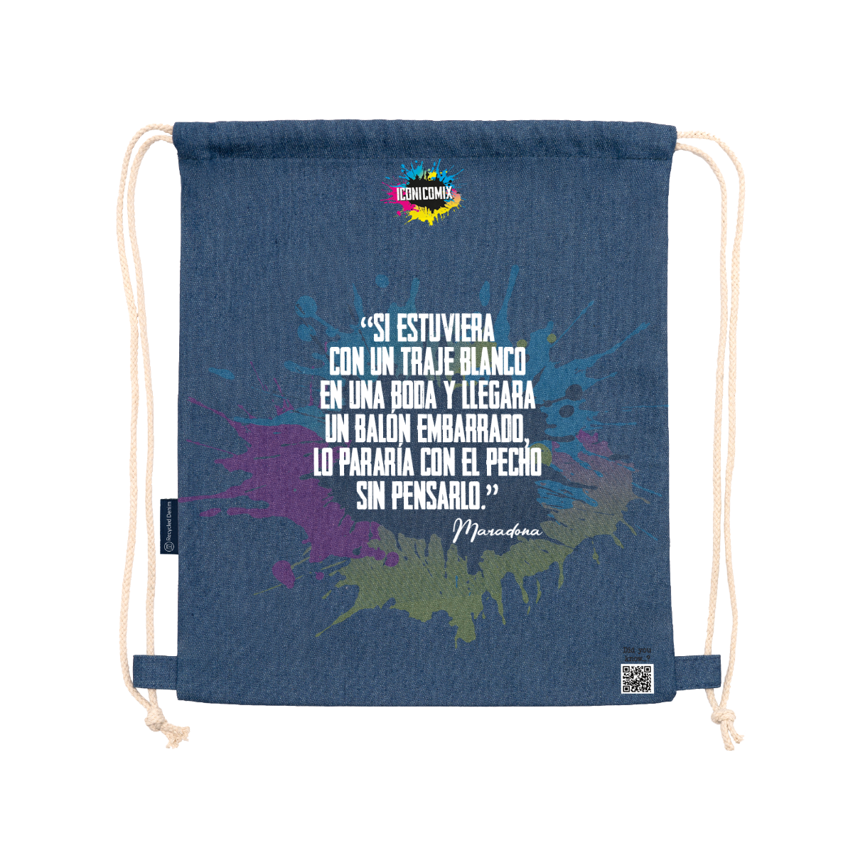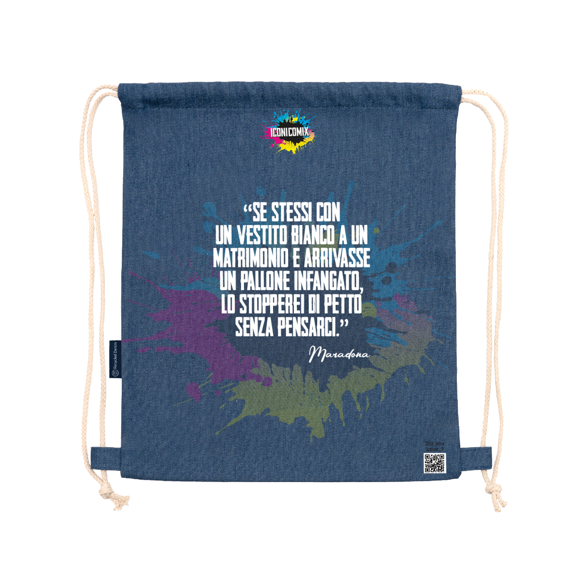 Zaino multiuso realizzato in denim riciclato. Cordoncini regolabili abbinati sul retro, spessore 8 mm. 100% denim, 320 g/m². Dimensioni: 36 cm / 42 cm .