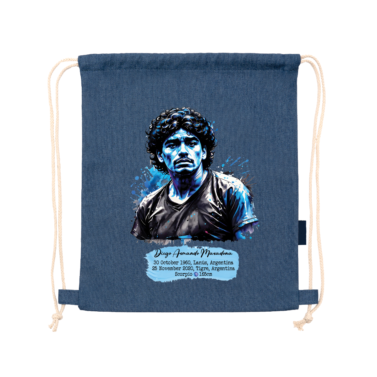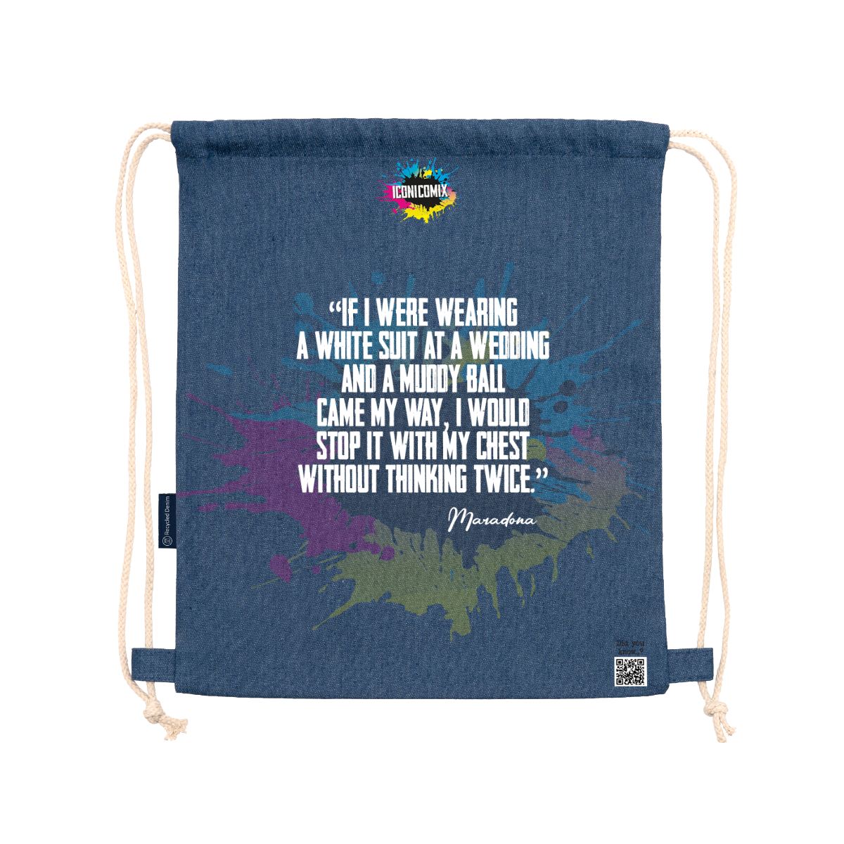 Multipurpose backpack made from recycled denim. Adjustable matching drawstrings at the back, 8 mm thick. 100% denim, 320 g/m². Dimensions: 36 cm / 42 cm.