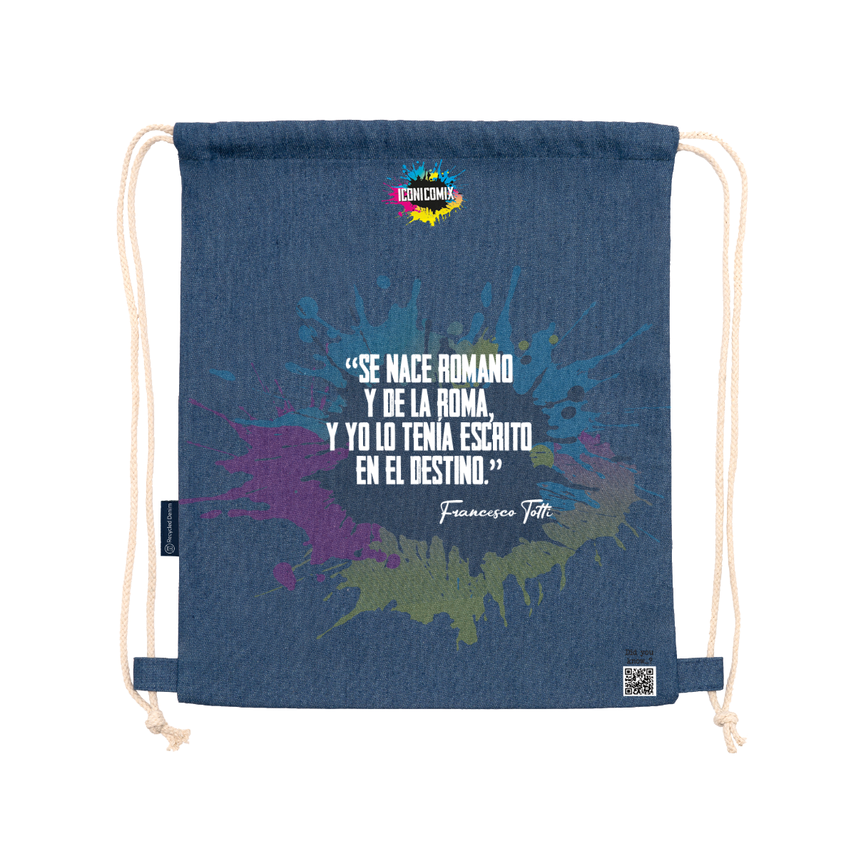Sac à dos polyvalent en denim recyclé. Cordons de serrage réglables assortis à l'arrière, épaisseur 8 mm. 100 % denim, 320 g/m². Dimensions : 36 cm / 42 cm.