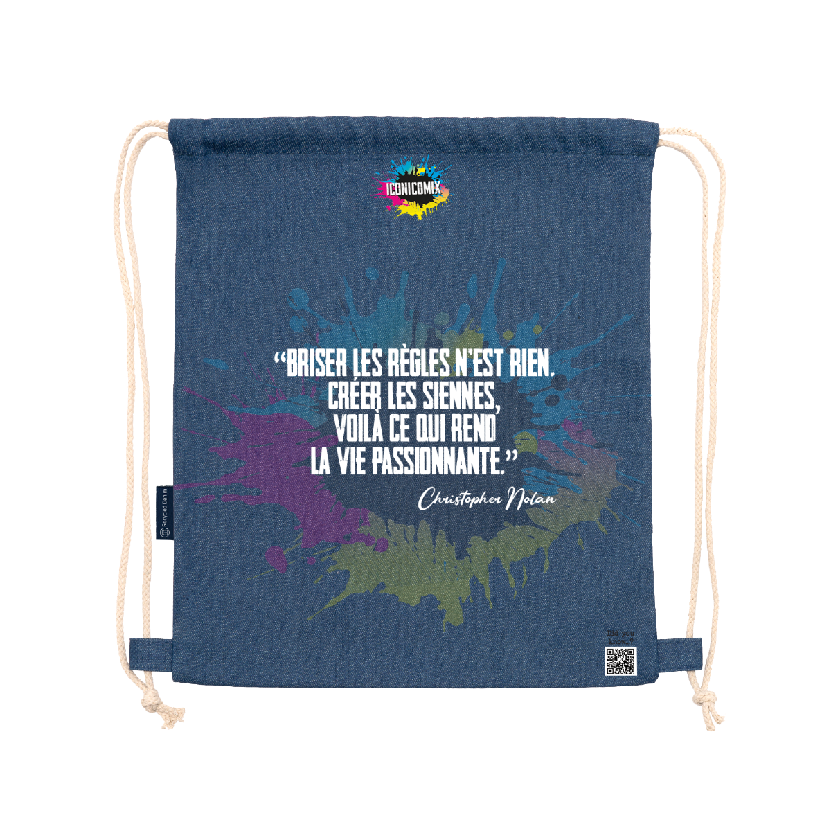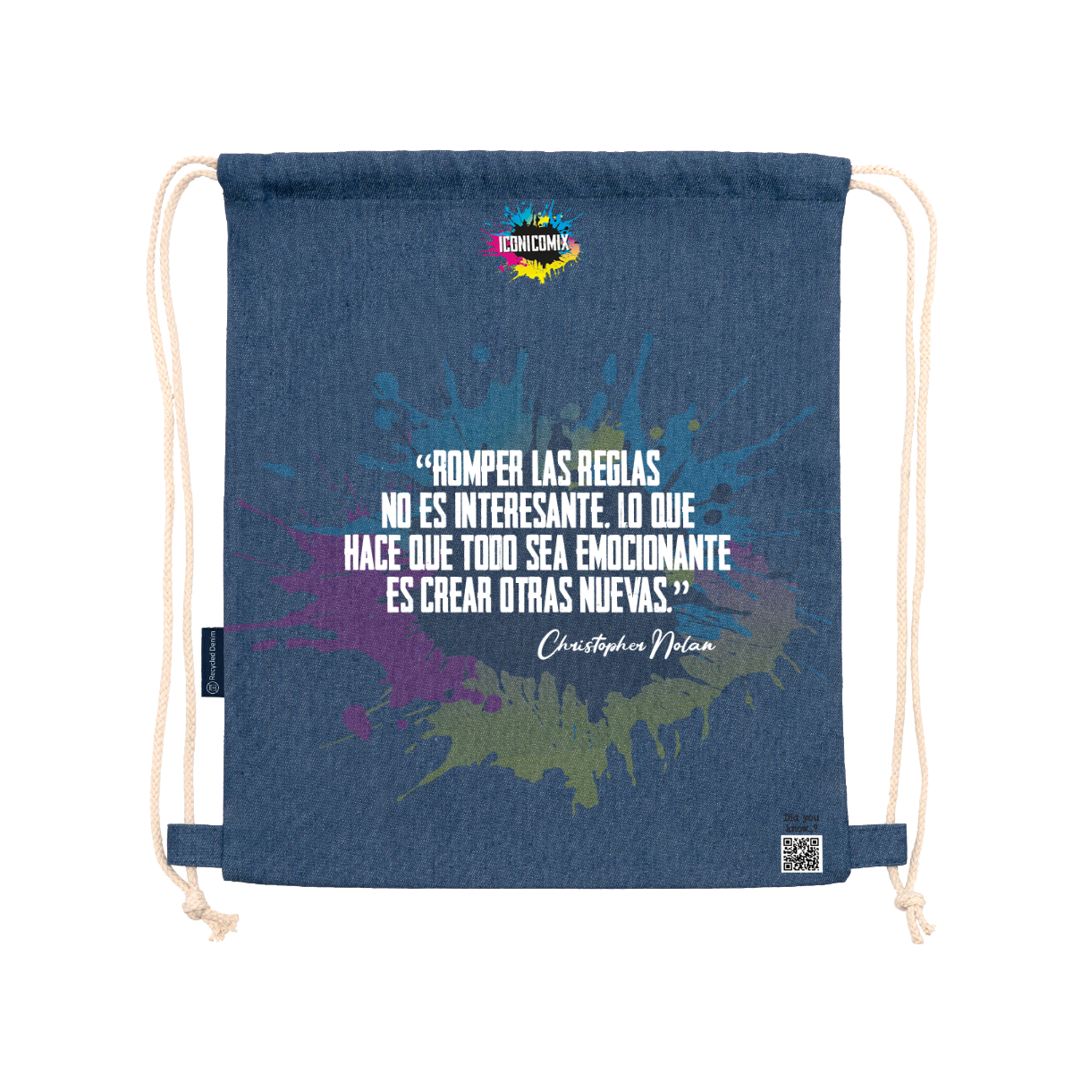 Zaino multiuso realizzato in denim riciclato. Cordoncini regolabili abbinati sul retro, spessore 8 mm. 100% denim, 320 g/m². Dimensioni: 36 cm / 42 cm .
