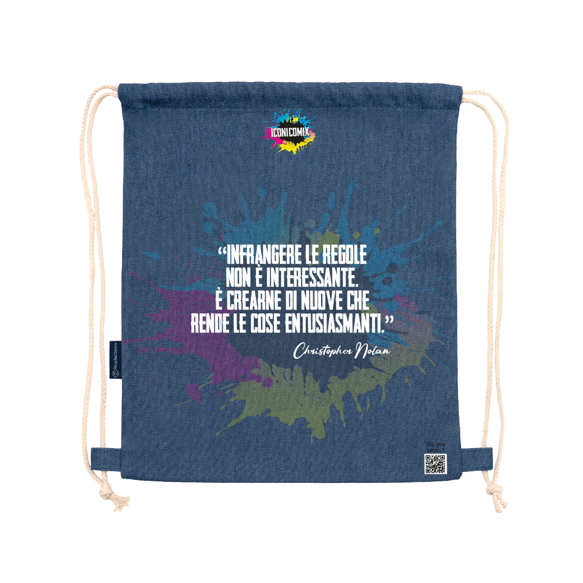 Zaino multiuso realizzato in denim riciclato. Cordoncini regolabili abbinati sul retro, spessore 8 mm. 100% denim, 320 g/m². Dimensioni: 36 cm / 42 cm .