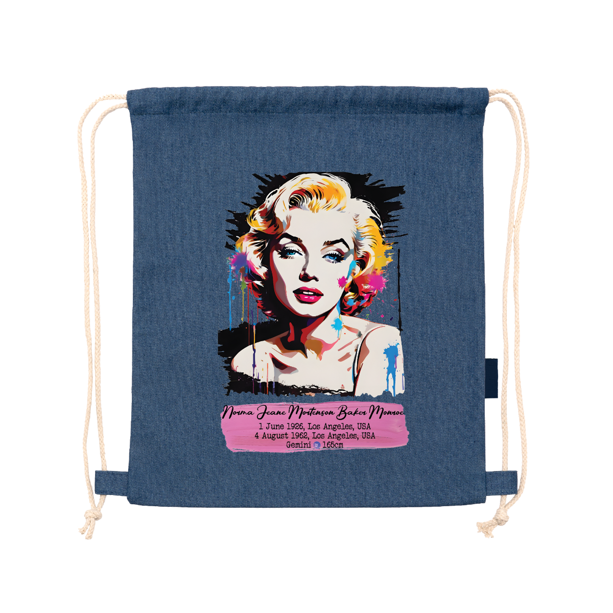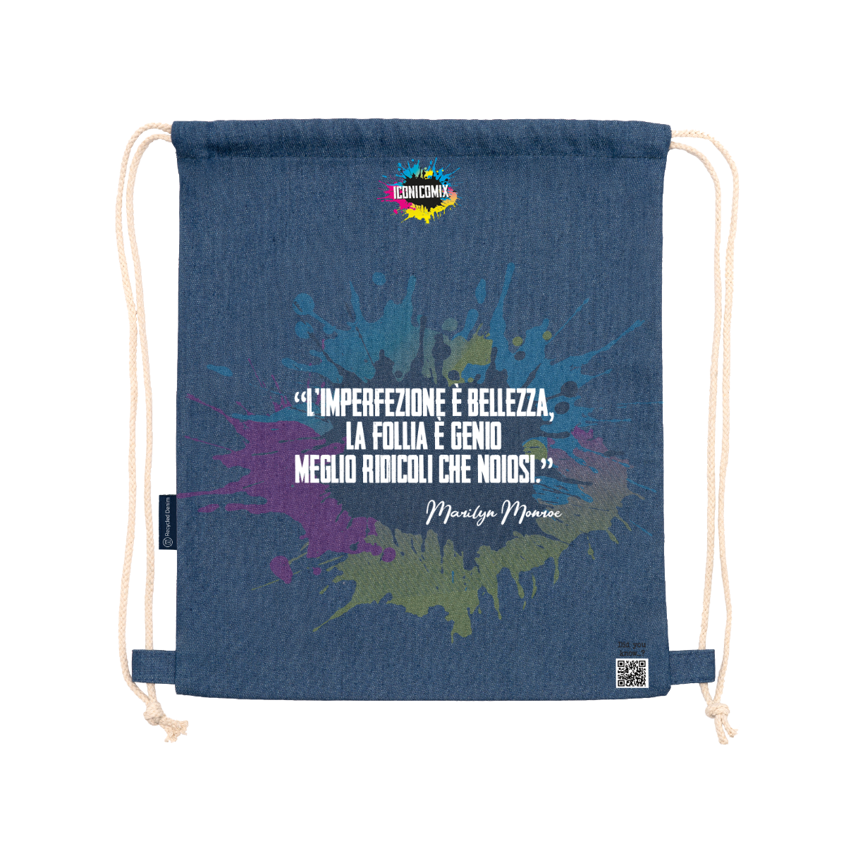 Zaino multiuso realizzato in denim riciclato. Cordoncini regolabili abbinati sul retro, spessore 8 mm. 100% denim, 320 g/m². Dimensioni: 36 cm / 42 cm .