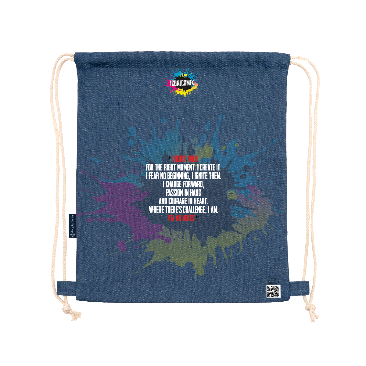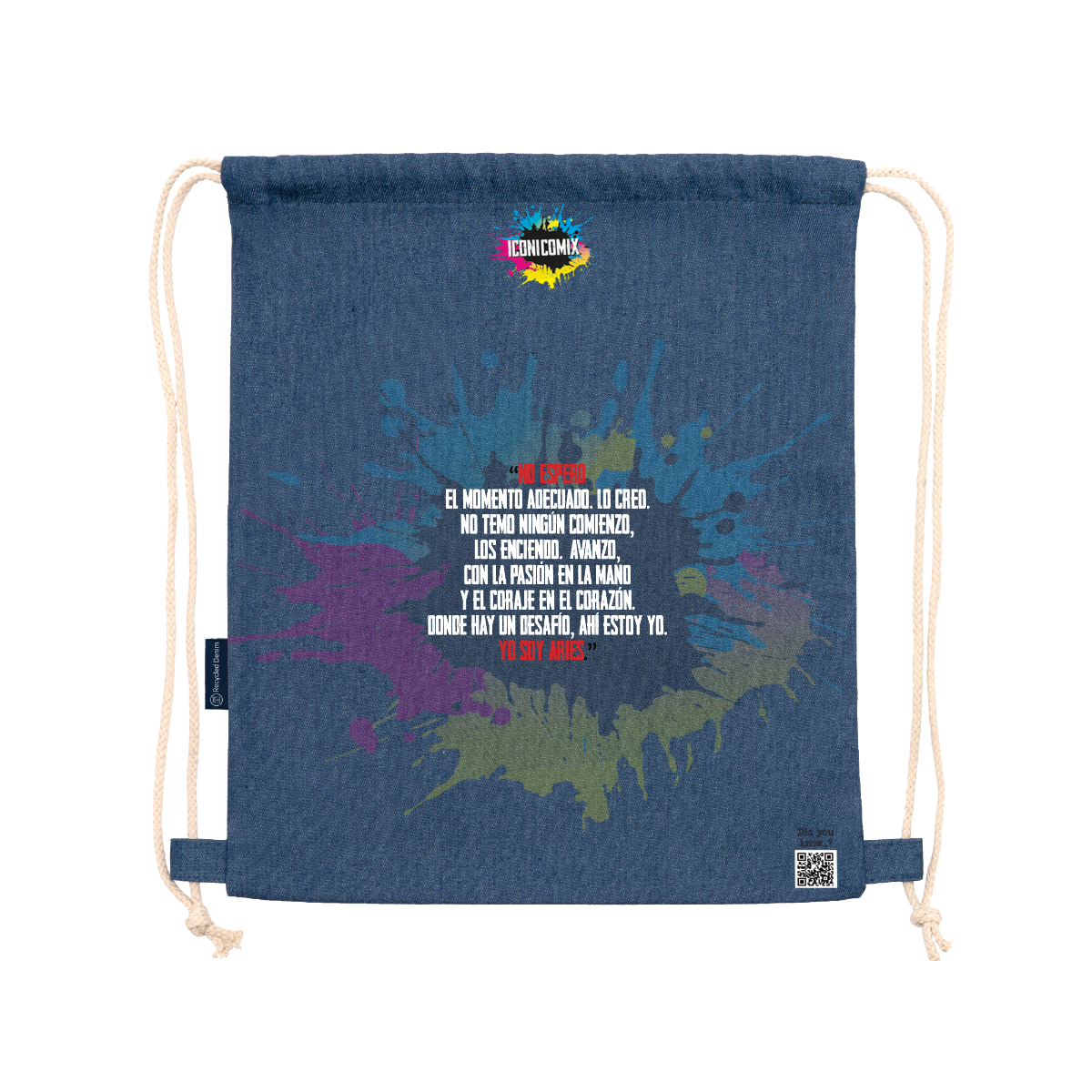 Zaino multiuso realizzato in denim riciclato. Cordoncini regolabili abbinati sul retro, spessore 8 mm. 100% denim, 320 g/m². Dimensioni: 36 cm / 42 cm .
