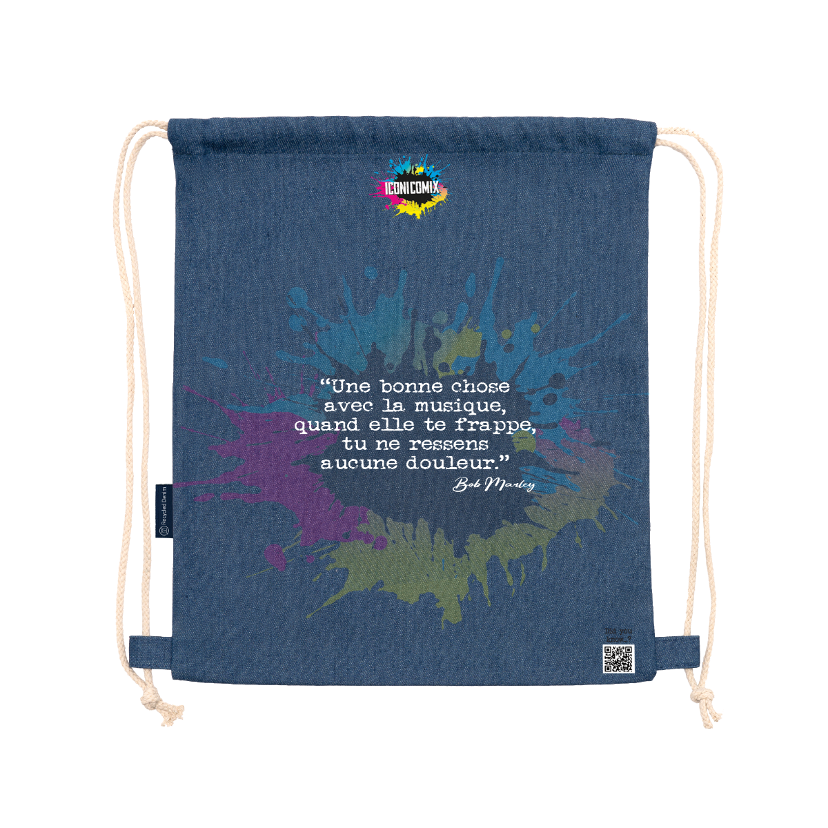 Zaino multiuso realizzato in denim riciclato. Cordoncini regolabili abbinati sul retro, spessore 8 mm. 100% denim, 320 g/m². Dimensioni: 36 cm / 42 cm .