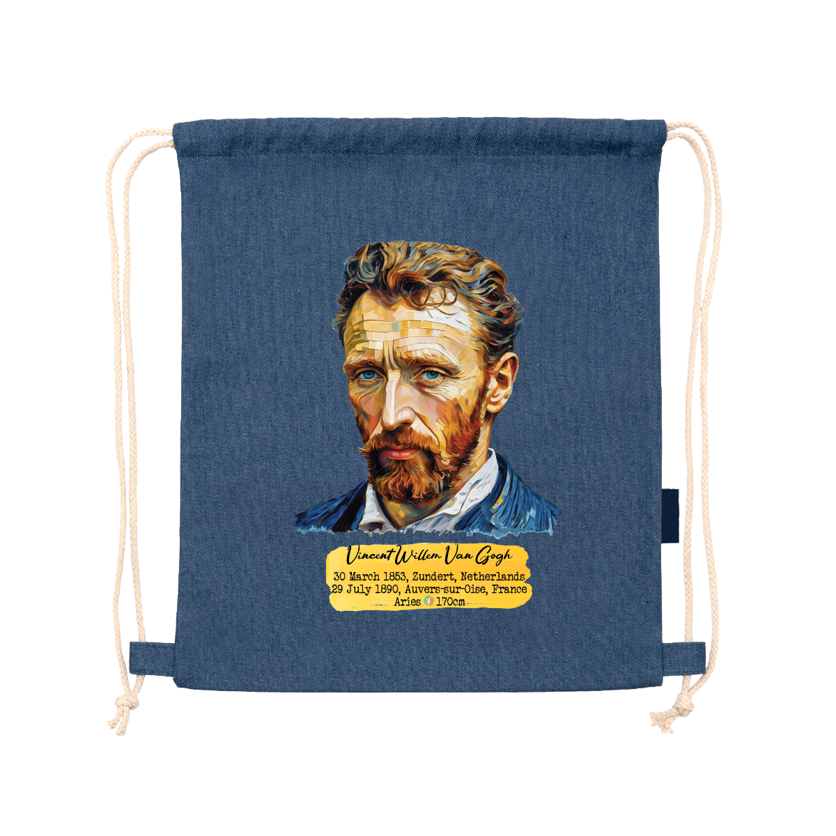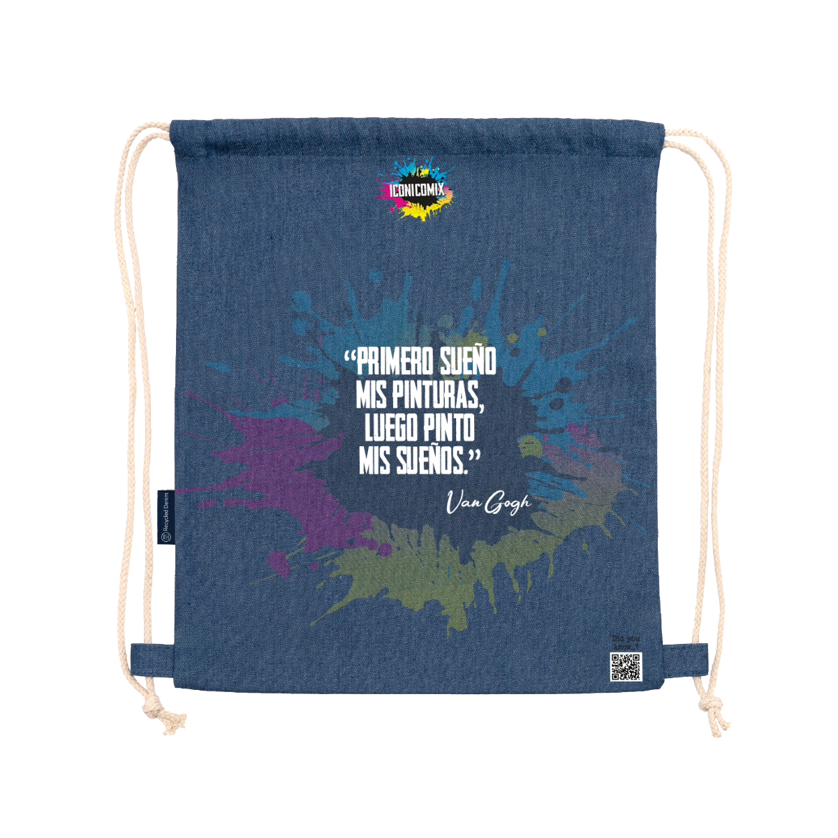 Sac à dos polyvalent en denim recyclé. Cordons de serrage réglables assortis à l'arrière, épaisseur 8 mm. 100 % denim, 320 g/m². Dimensions : 36 cm / 42 cm.