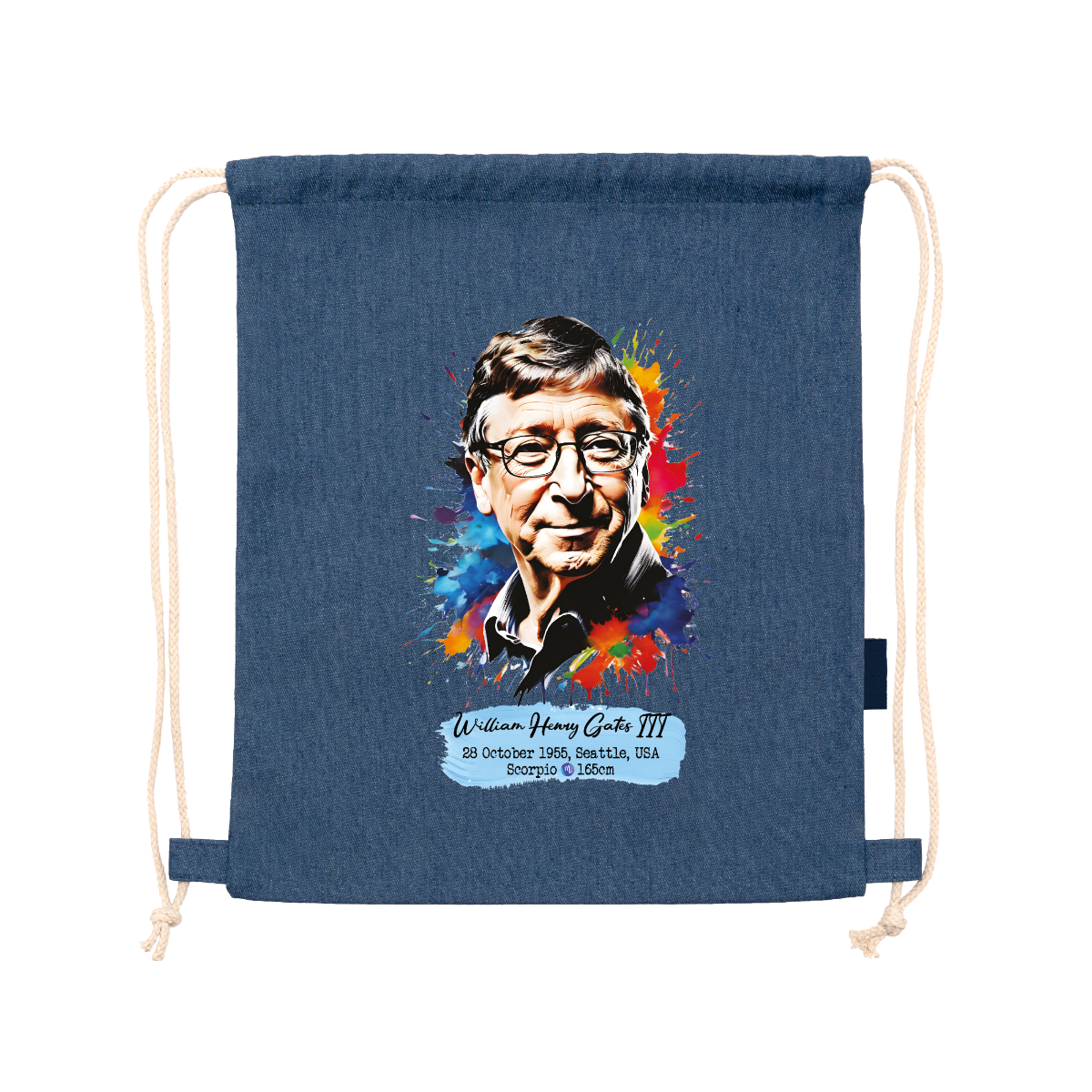 Zaino multiuso realizzato in denim riciclato. Cordoncini regolabili abbinati sul retro, spessore 8 mm. 100% denim, 320 g/m². Dimensioni: 36 cm / 42 cm .