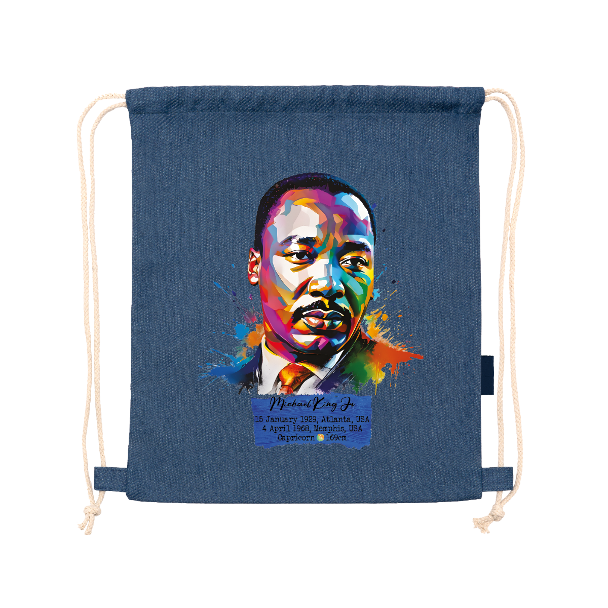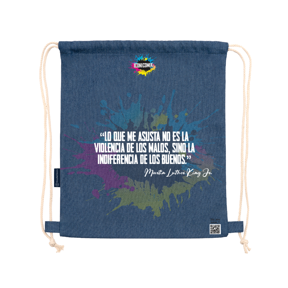 Zaino multiuso realizzato in denim riciclato. Cordoncini regolabili abbinati sul retro, spessore 8 mm. 100% denim, 320 g/m². Dimensioni: 36 cm / 42 cm .